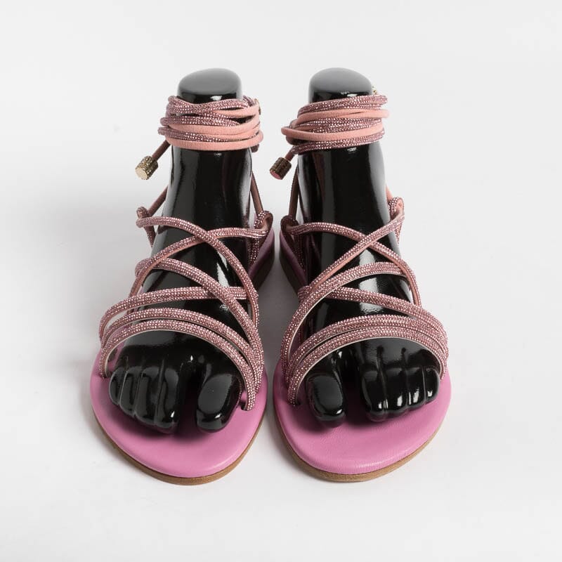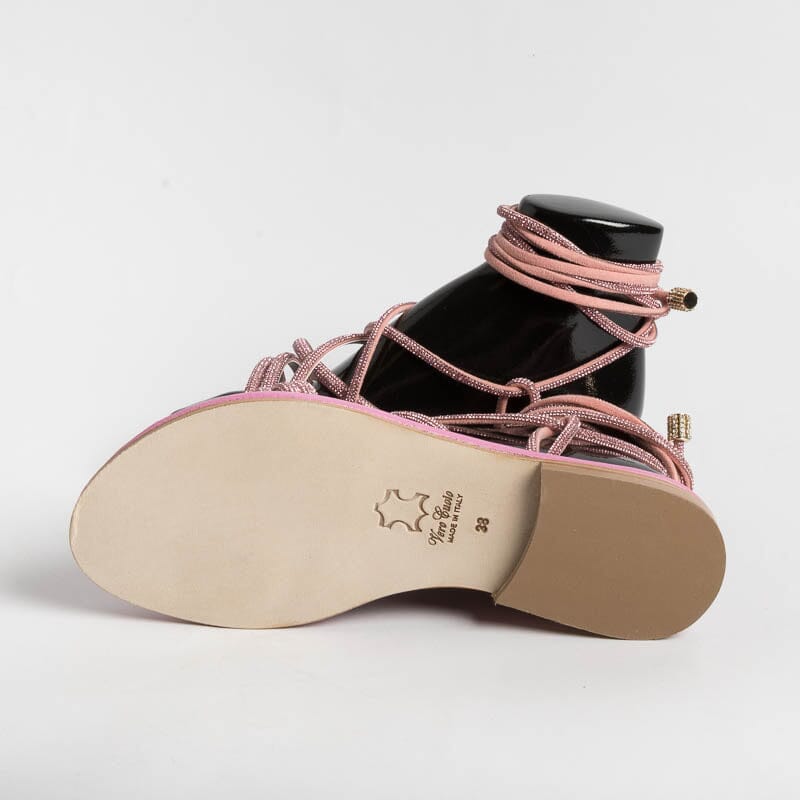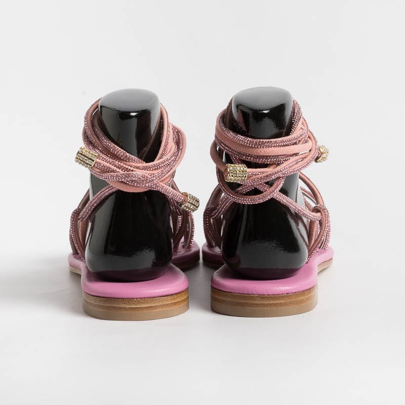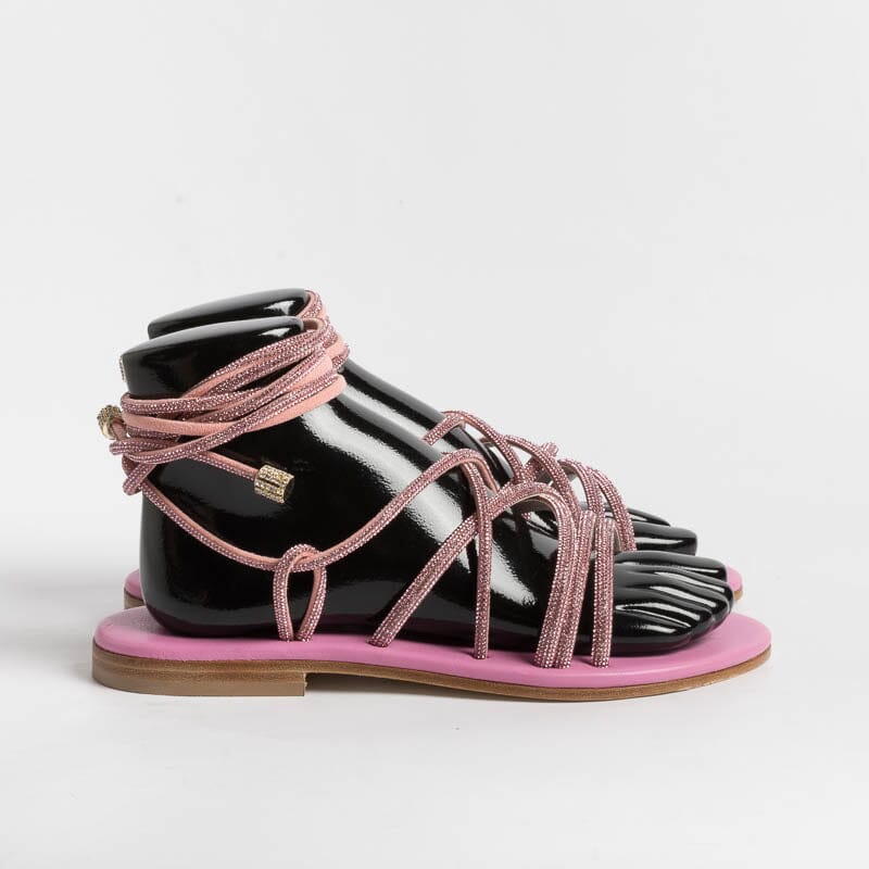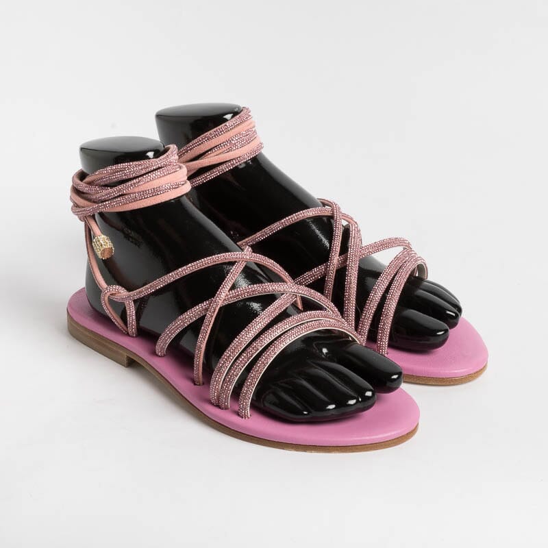 Sandalo alla schiava di Paola Fiorenza, realizzato in pelle di vitello di colore rosa con applicazione di micro cristalli in nuance su tomaia. Sottopiede imbottito in pelle in nuance per un maggiore comfort nella calzata. Chiusura con allacciatura che può essere bassa alla caviglia o lungo il polpaccio. Realizzati a mano in Italia.