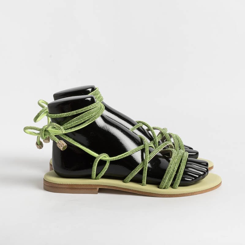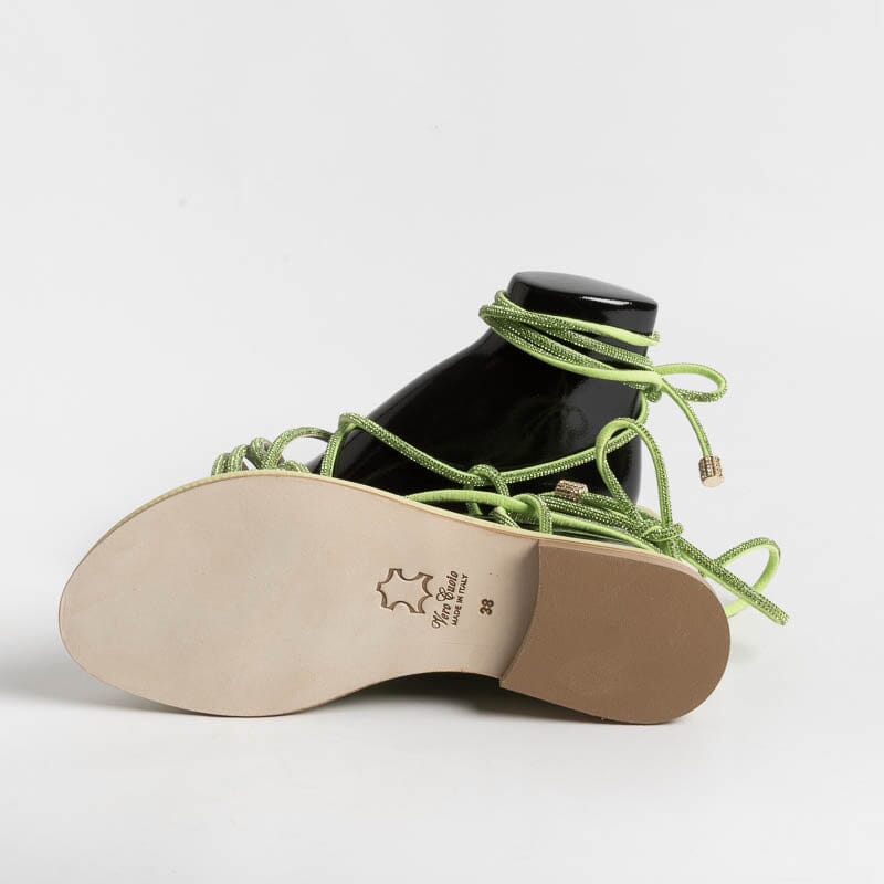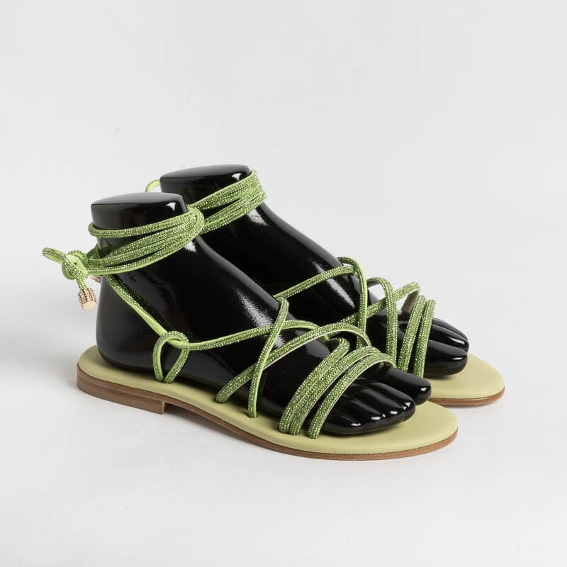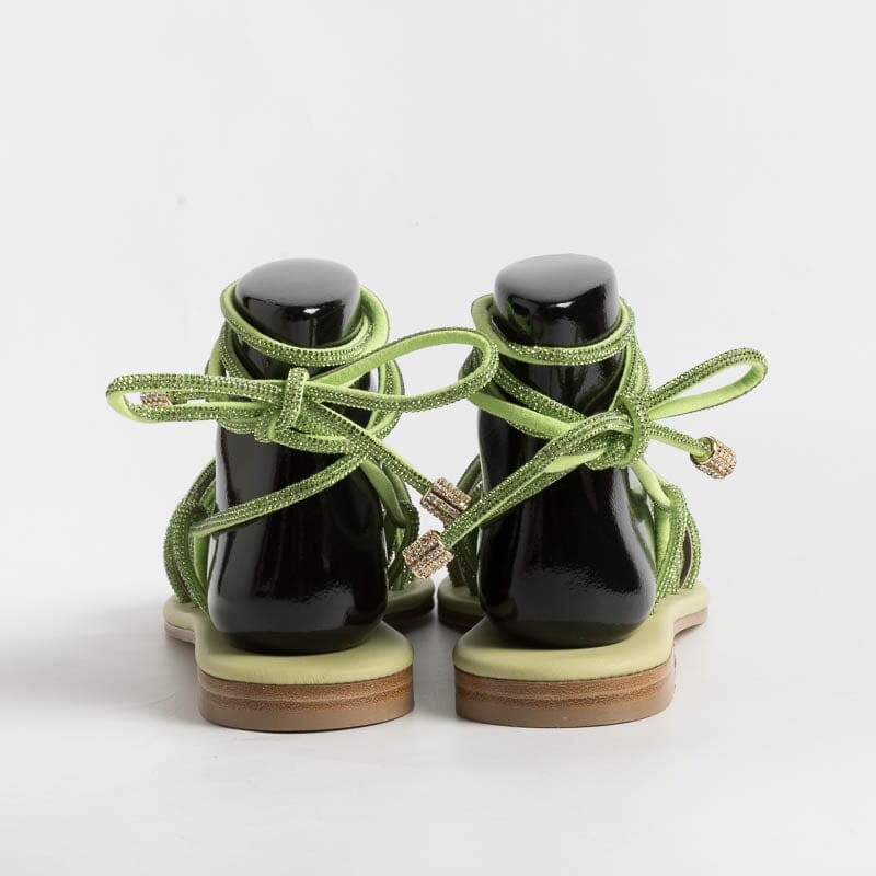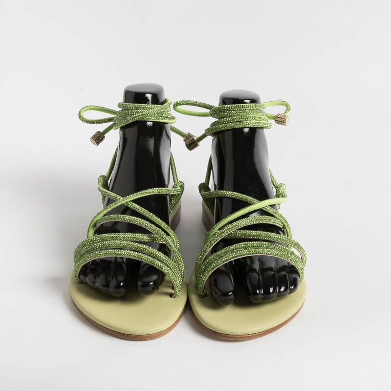 Sandalo alla schiava di Paola Fiorenza, realizzato in pelle di vitello di colore verde brillante con applicazione di micro cristalli in nuance su tomaia. Sottopiede imbottito in pelle in nuance per un maggiore comfort nella calzata. Chiusura con allacciatura che può essere bassa alla caviglia o lungo il polpaccio. Realizzati a mano in Italia.