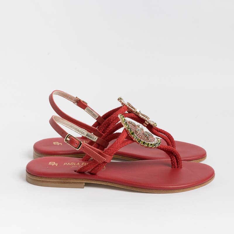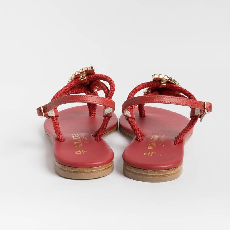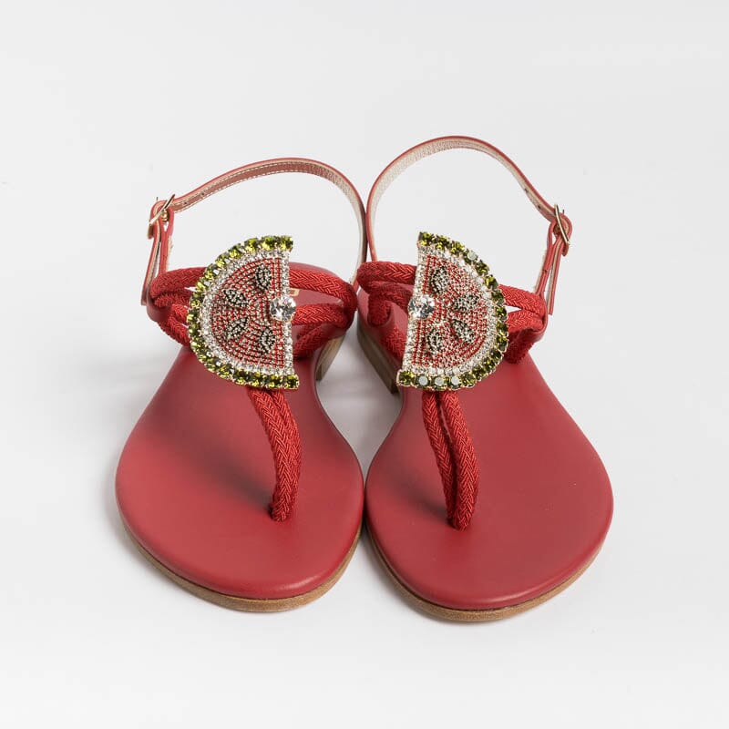 Sandalo infradito di Paola Fiorenza realizzato in pelle di vitello e corda di colore rosso con applicazione di gioiello a forma di fetta di anguria con colori in nuance. Sottopiede imbottito in pelle in nuance per un maggiore comfort nella calzata. Chiusura con cinturino sul tallone regolabile.
