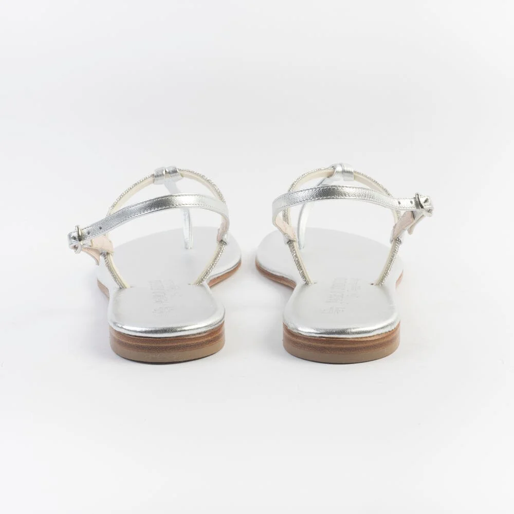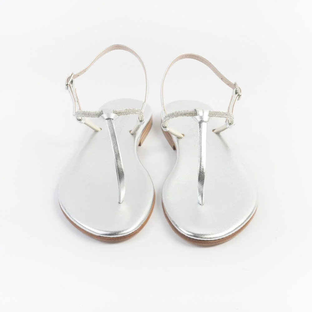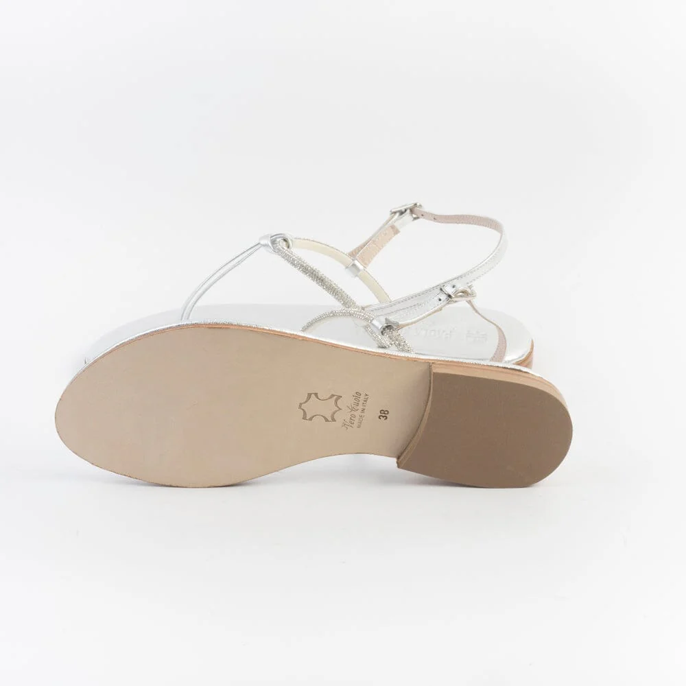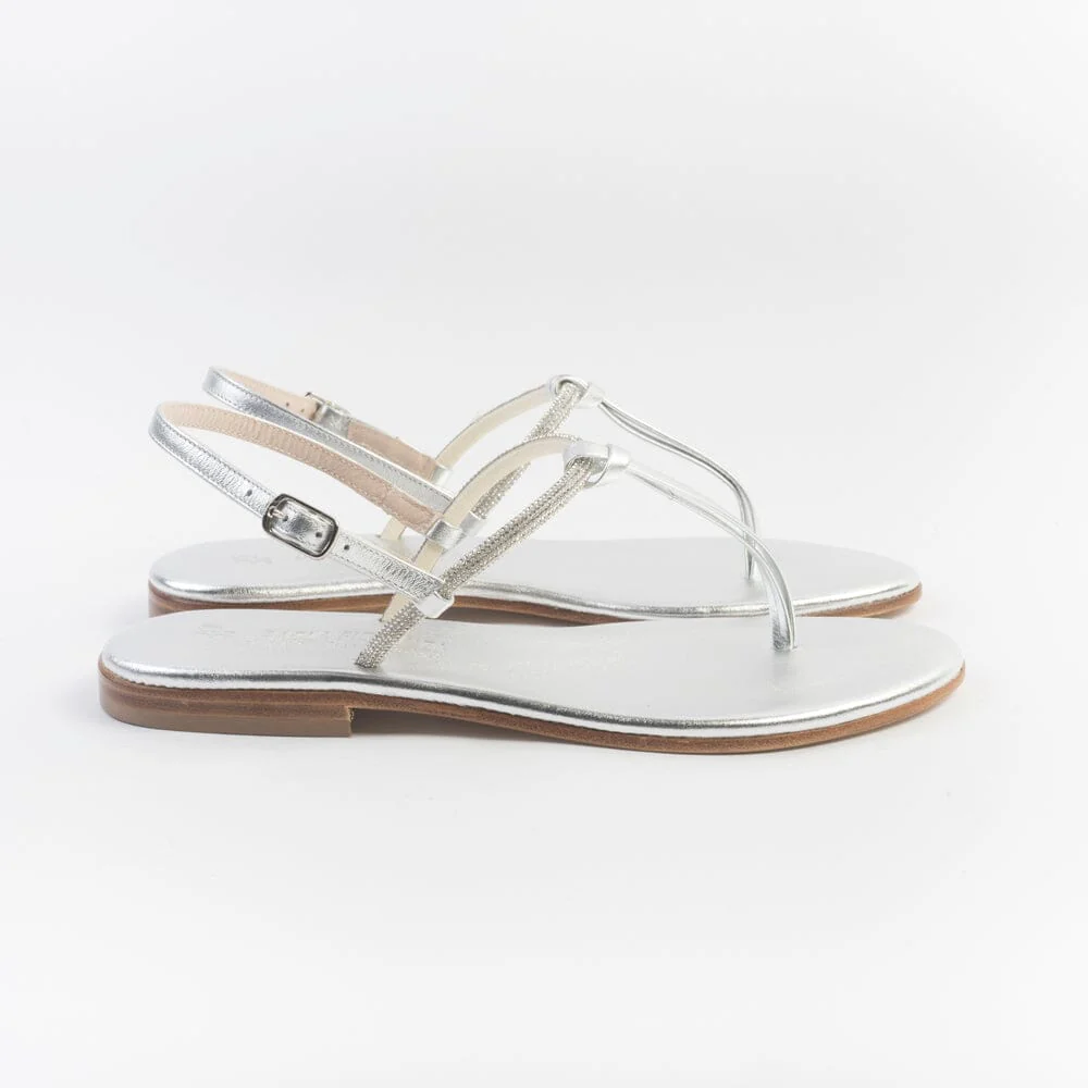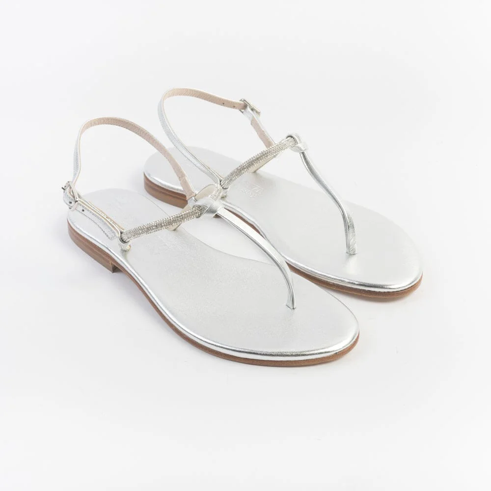 Sandali infradito di Paola Fiorenza, realizzati in pelle di vitello di colore argento con applicazione di micro cristalli e nodino decorativo centrale. Sottopiede imbottito in pelle in nuance per un maggiore comfort nella calzata. Chiusura con cinturino regolabile sul tallone. Realizzati a mano in Italia. Calzata piccola, acquista un numero in più.