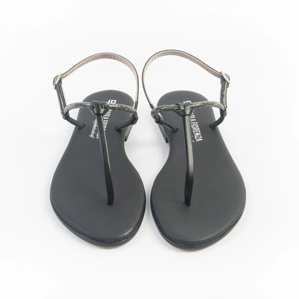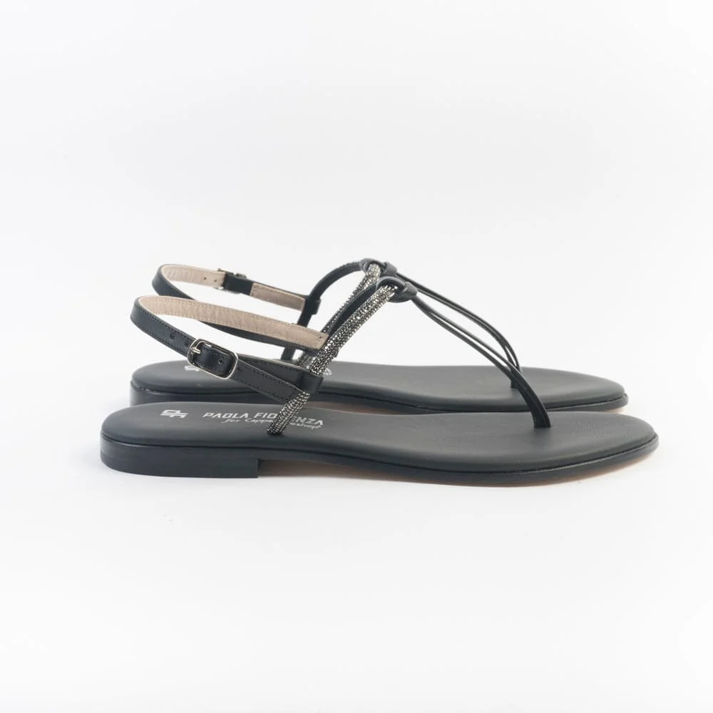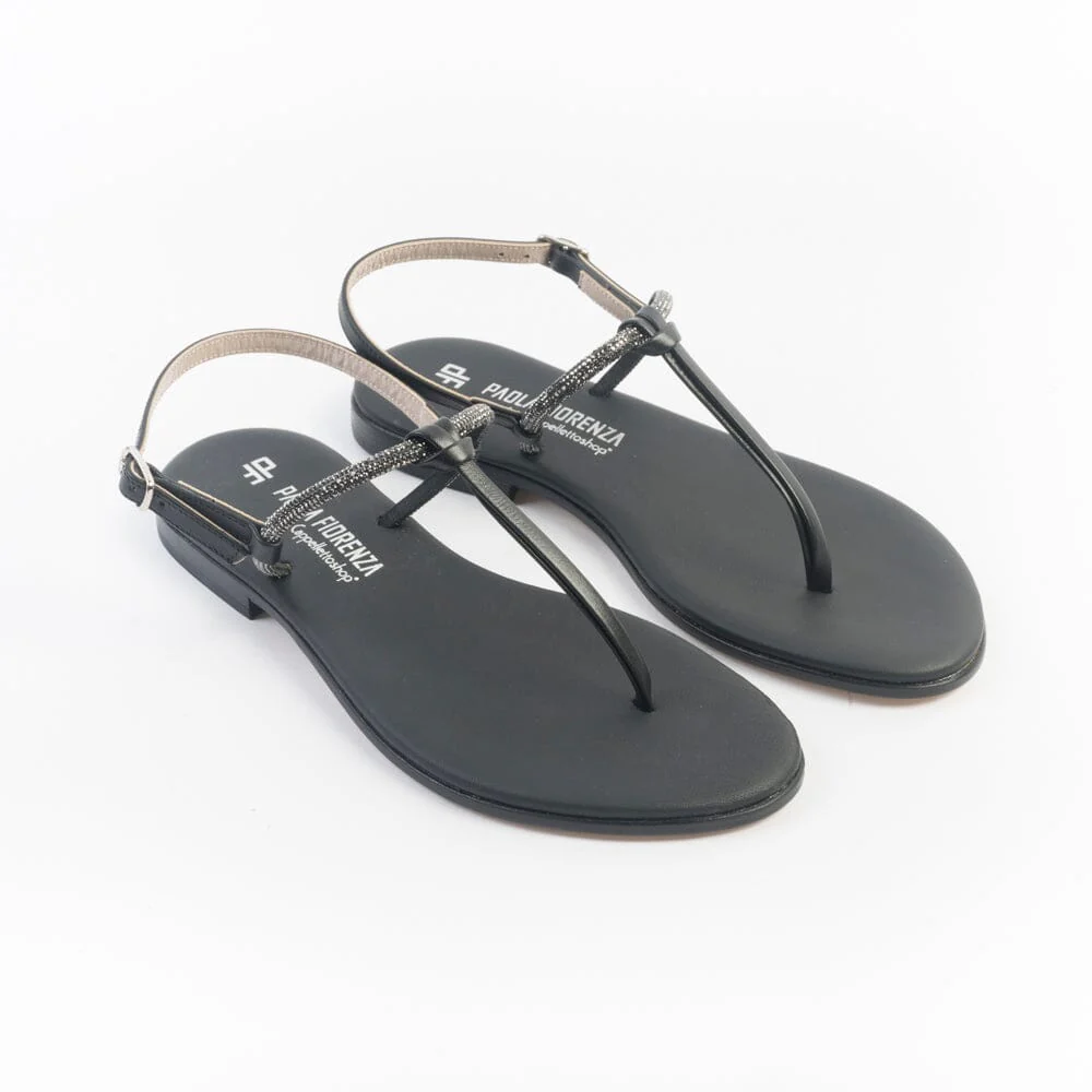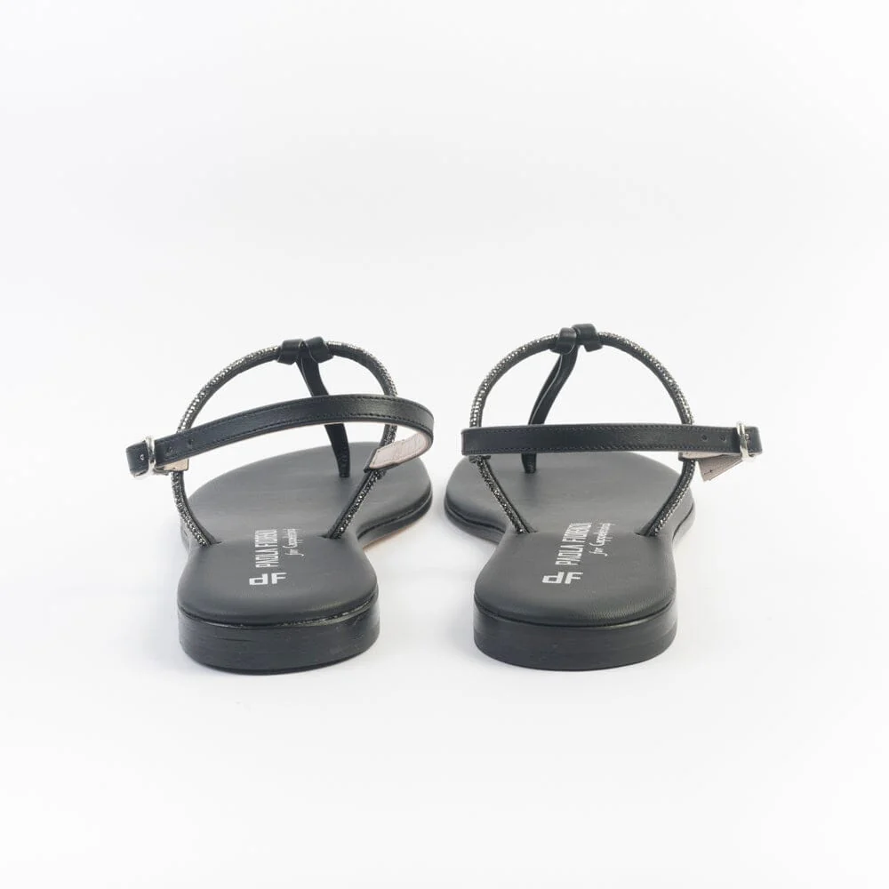 Sandali infradito di Paola Fiorenza, realizzati in pelle di vitello di colore nero con applicazione di micro cristalli e nodino decorativo centrale. Sottopiede imbottito in pelle in nuance per un maggiore comfort nella calzata. Chiusura con cinturino regolabile sul tallone. Realizzati a mano in Italia. Calzata piccola, acquista un numero in più.
