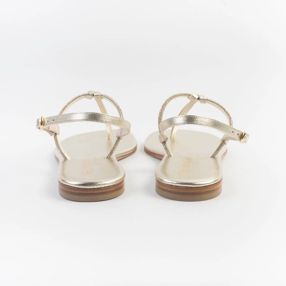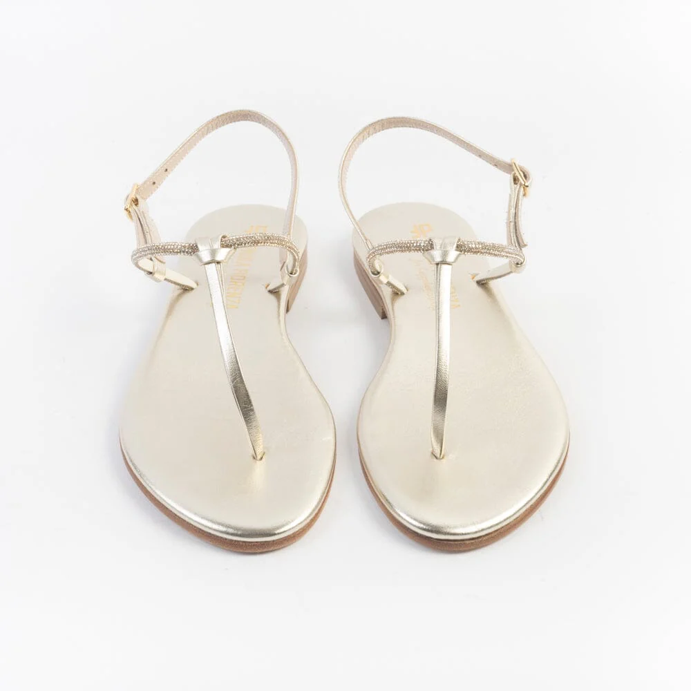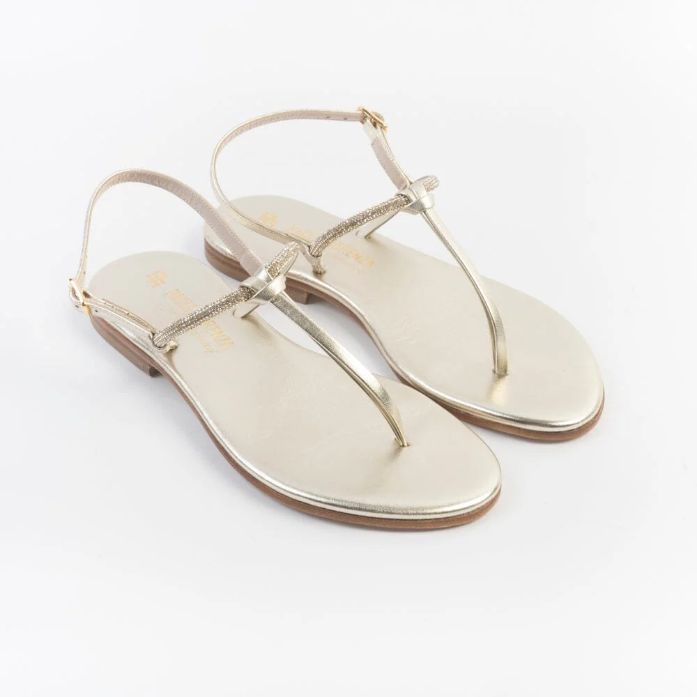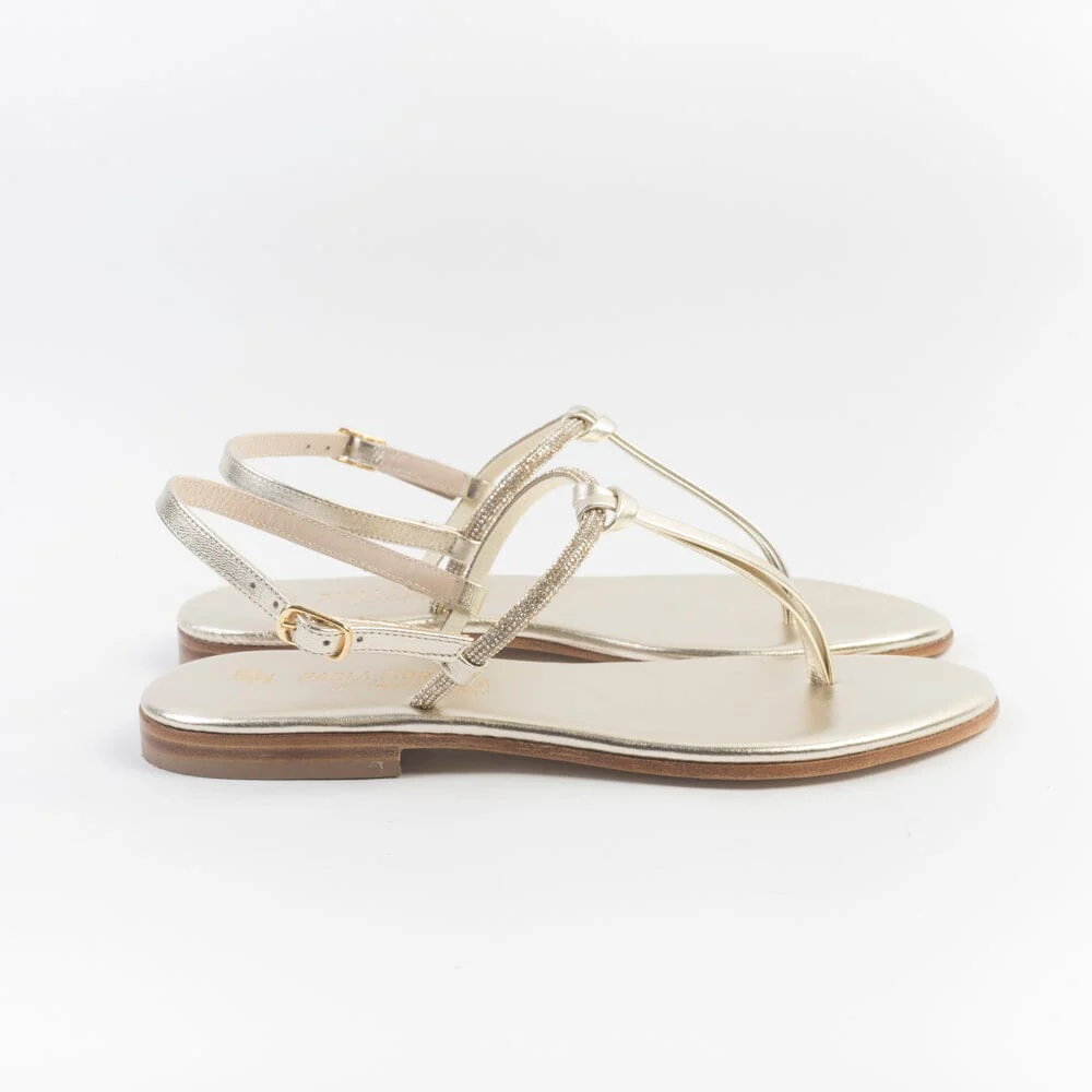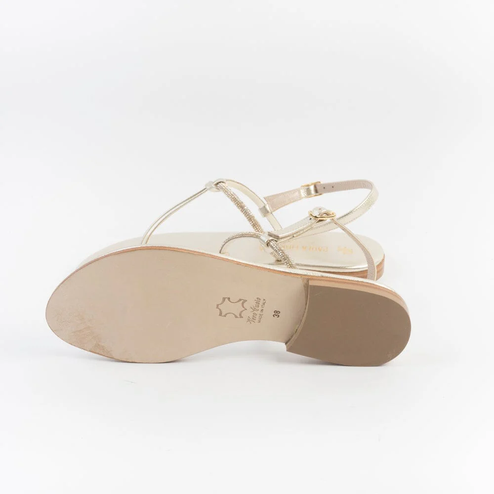 Sandali infradito di Paola Fiorenza, realizzati in pelle di vitello di colore platino con applicazione di micro cristalli e nodino decorativo centrale. Sottopiede imbottito in pelle in nuance per un maggiore comfort nella calzata. Chiusura con cinturino regolabile sul tallone. Realizzati a mano in Italia. Calzata piccola, acquista un numero in più.
