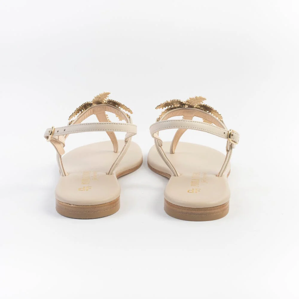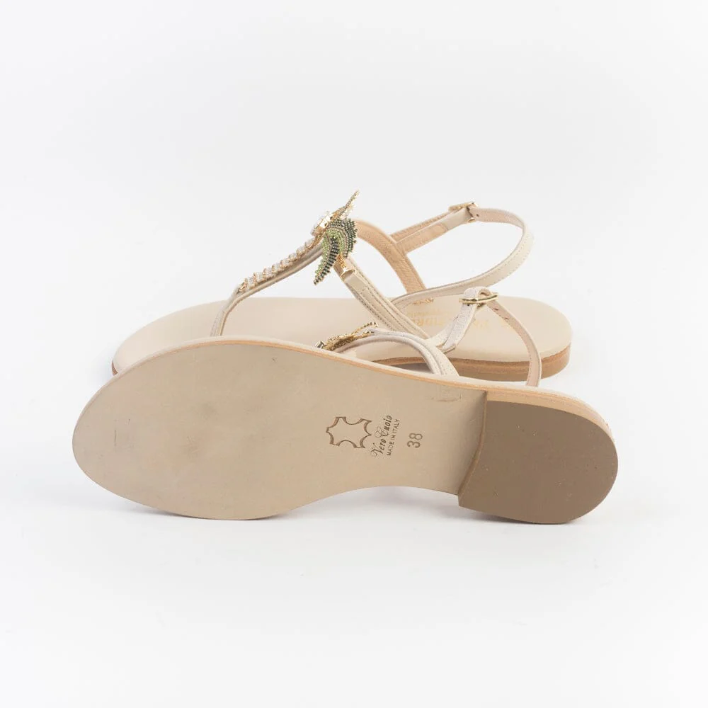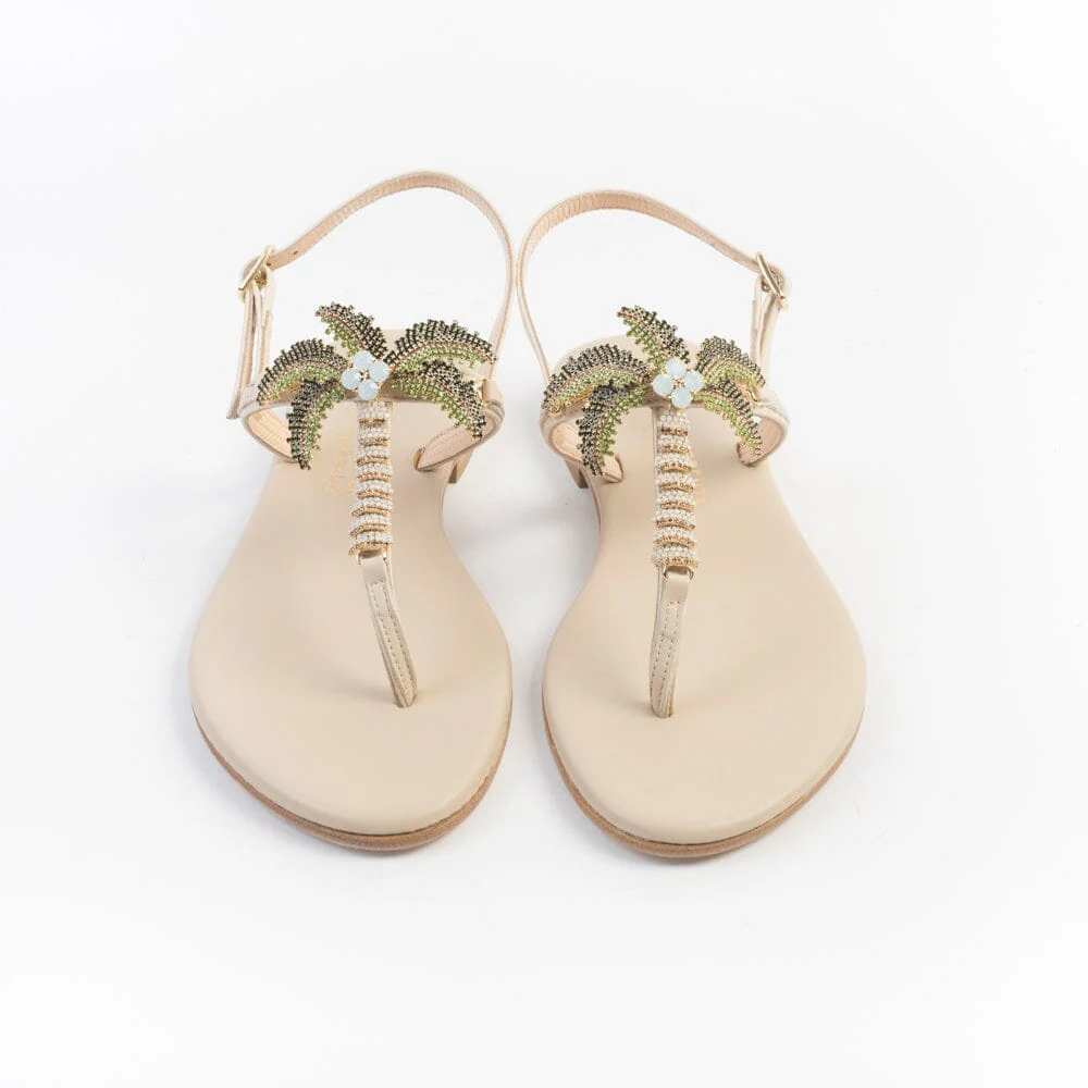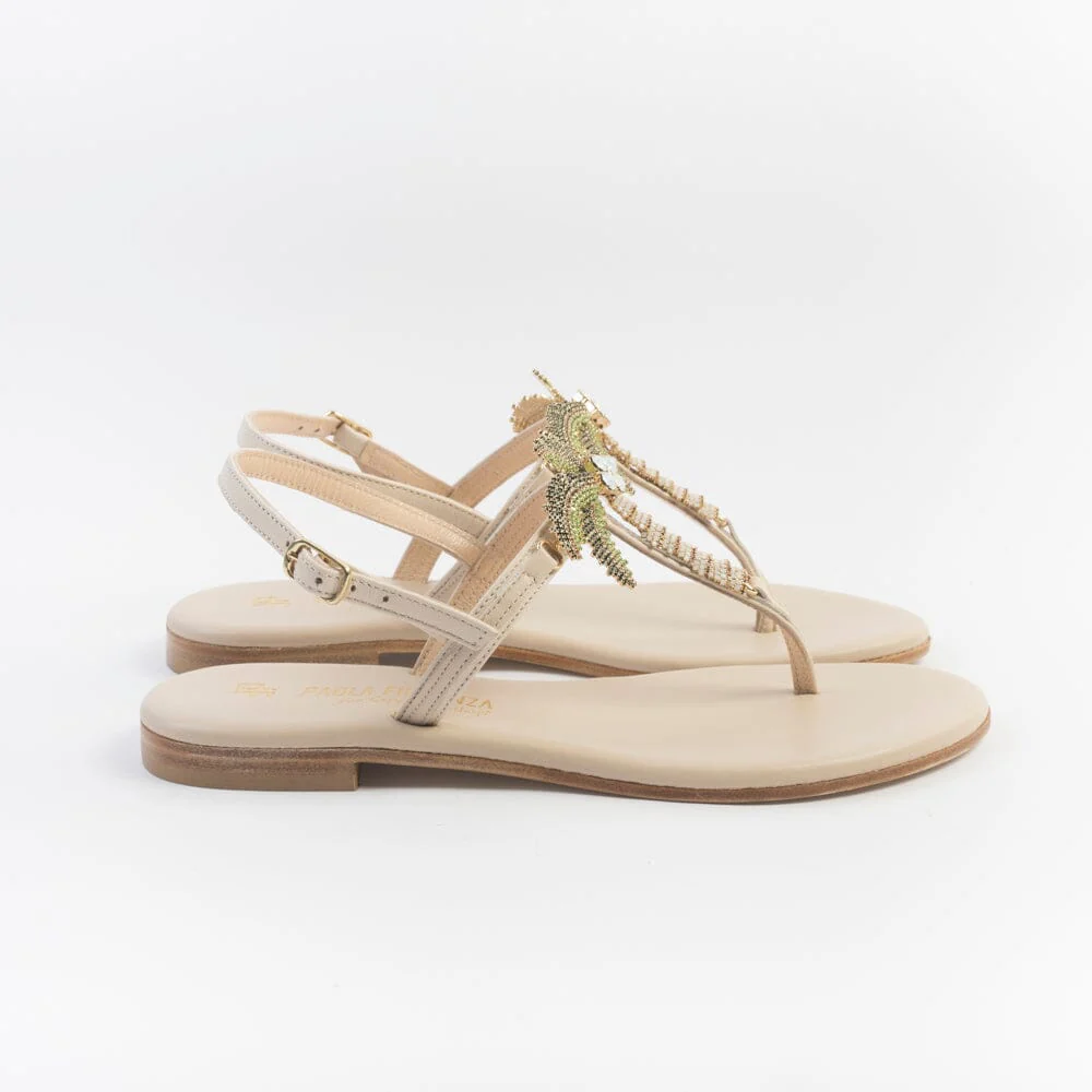 Sandali infradito di Paola Fiorenza, realizzati in nappa di colore beige, con accessorio in micro cristalli a forma di palma di colore beige, oro e verde. Chiusura con cinturino regolabile alla caviglia. Sottopiede imbottito, in pelle in nuance, per un maggiore comfort nella calzata. Suola in cuoio con tacco in gomma.