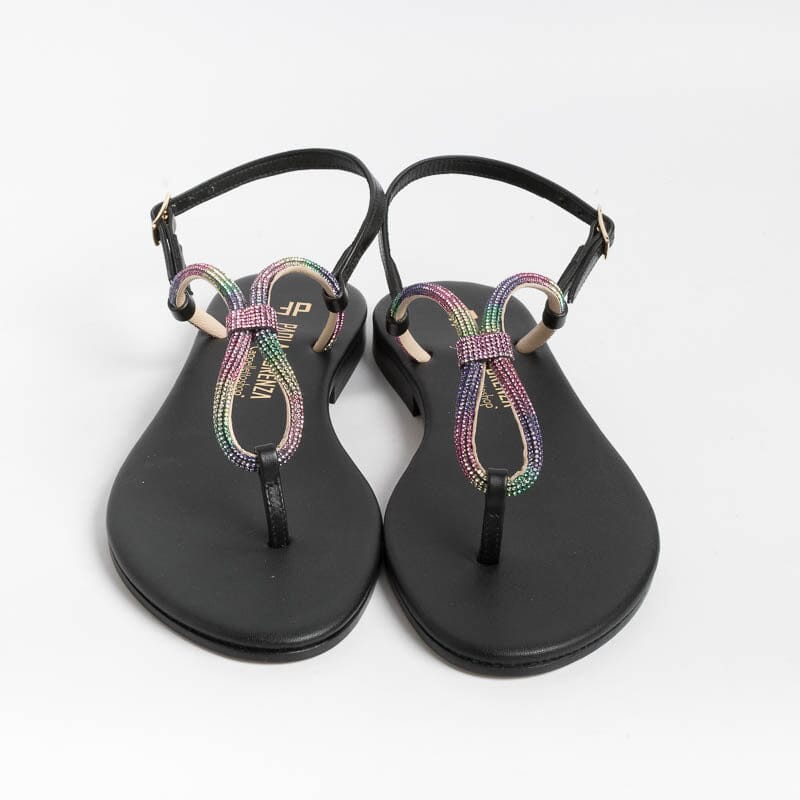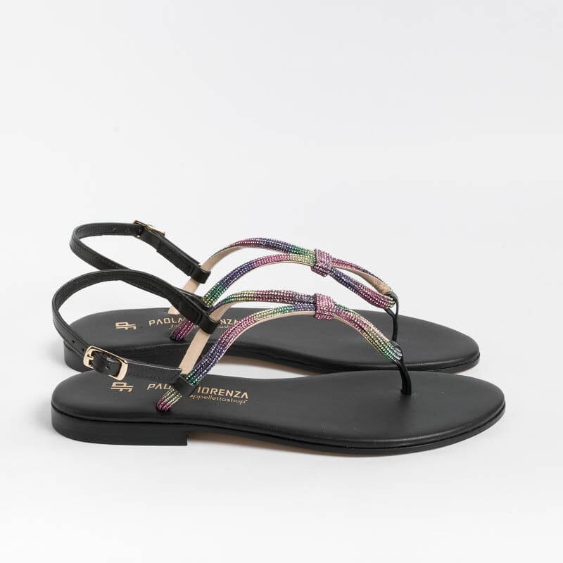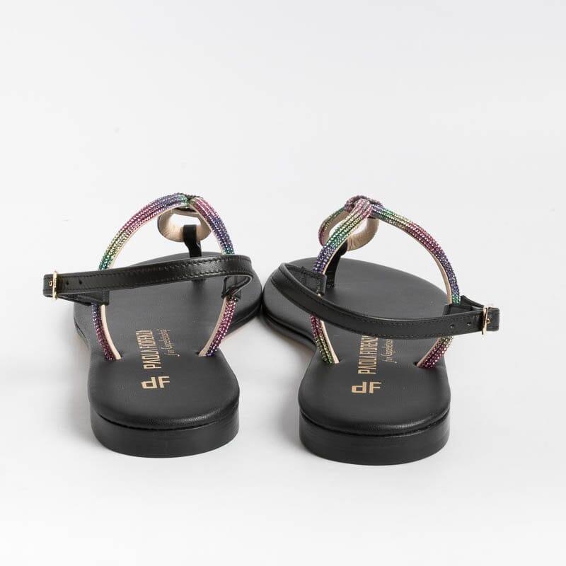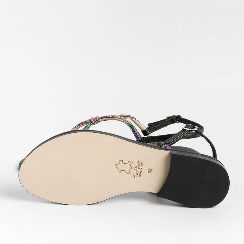 Sandalo infradito di Paola Fiorenza, realizzato in pelle di vitello di colore nero con micro cristalli multicolor su tomaia. Sottopiede imbottito in pelle per un maggiore comfort nella calzata. Chiusura con cinturino sul tallone regolabile.