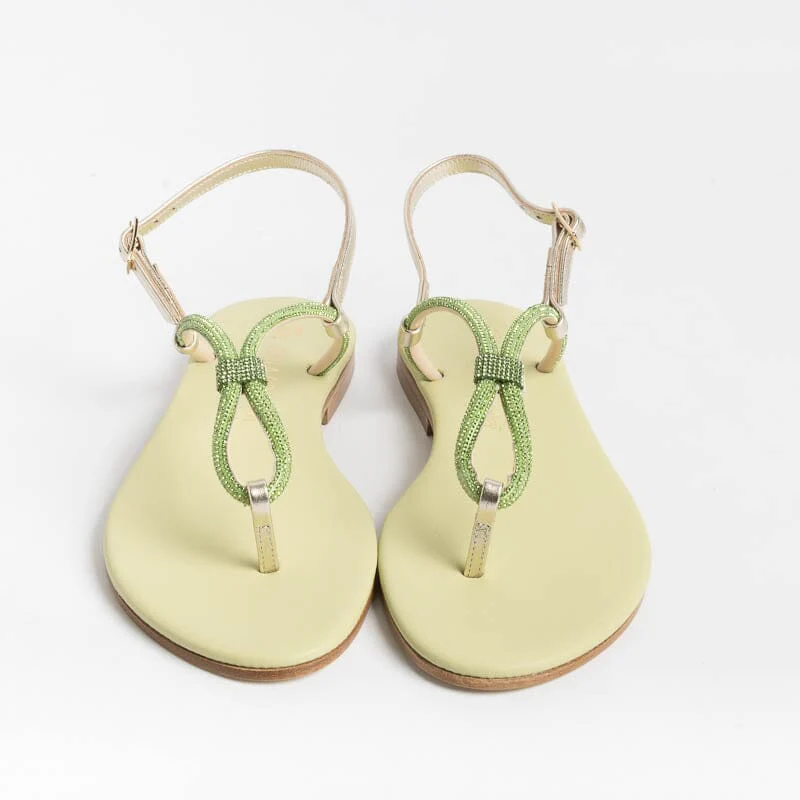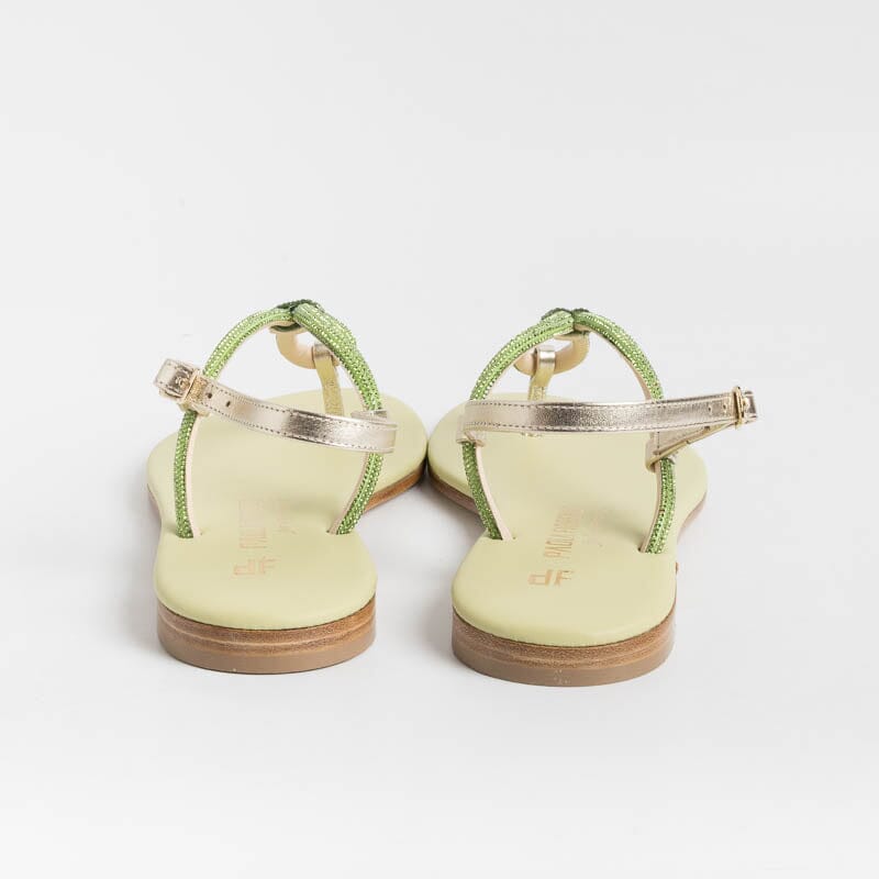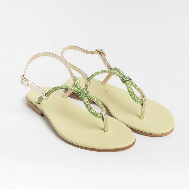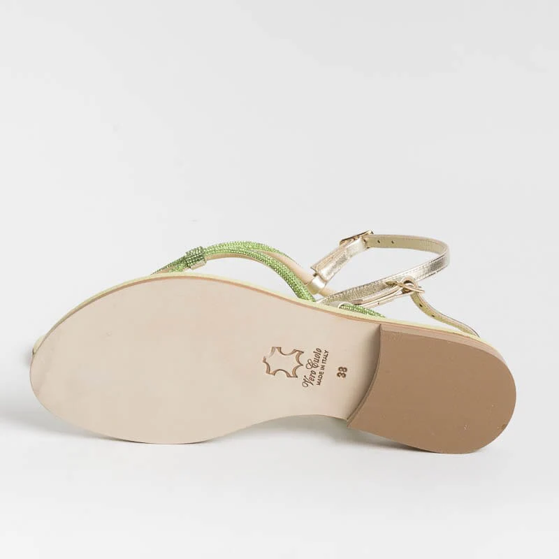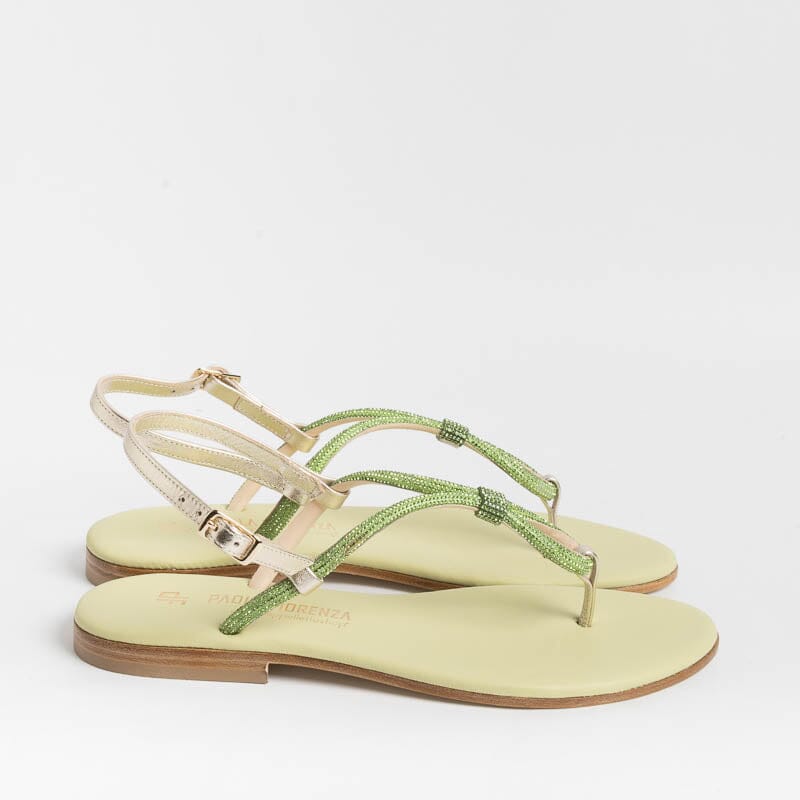 Sandalo infradito di Paola Fiorenza, realizzato in pelle di vitello di colore verde con micro cristalli in nuance su tomaia. Sottopiede imbottito in pelle in nuance per un maggiore comfort nella calzata. Chiusura con cinturino sul tallone regolabile.
