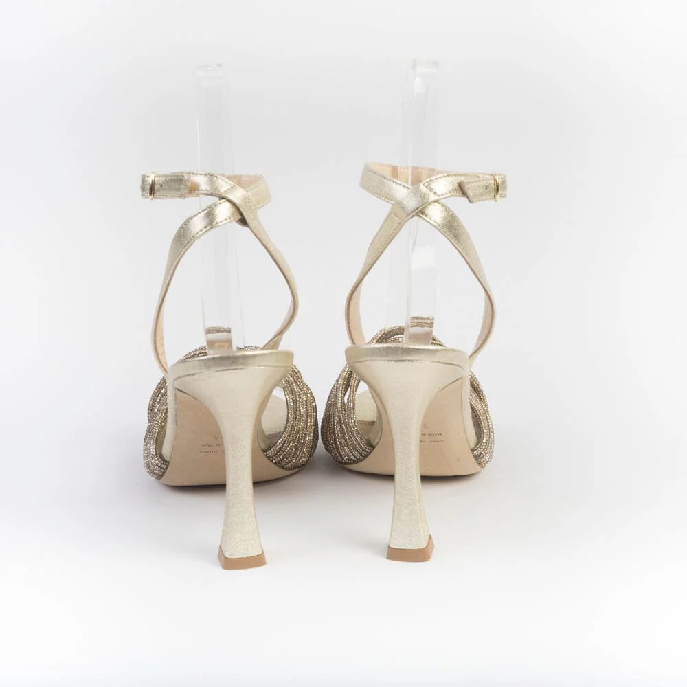 Sandalo gioiello di Paola Fiorenza, realizzato per Cappellettoshop in pelle laminata di colore platino con fasce intrecciate su avampiede in micro cristalli di colore oro sostenute da unica fascia liscia, posta al di sotto. Sottopiede in pelle. Chiusura con cinturino regolabile alla caviglia. Tacco a rocchetto rivestito in pelle di 11 cm. Suola in cuoio. Realizzati a mano in Italia.