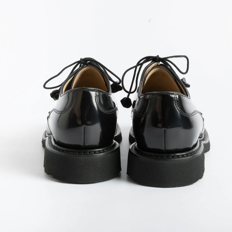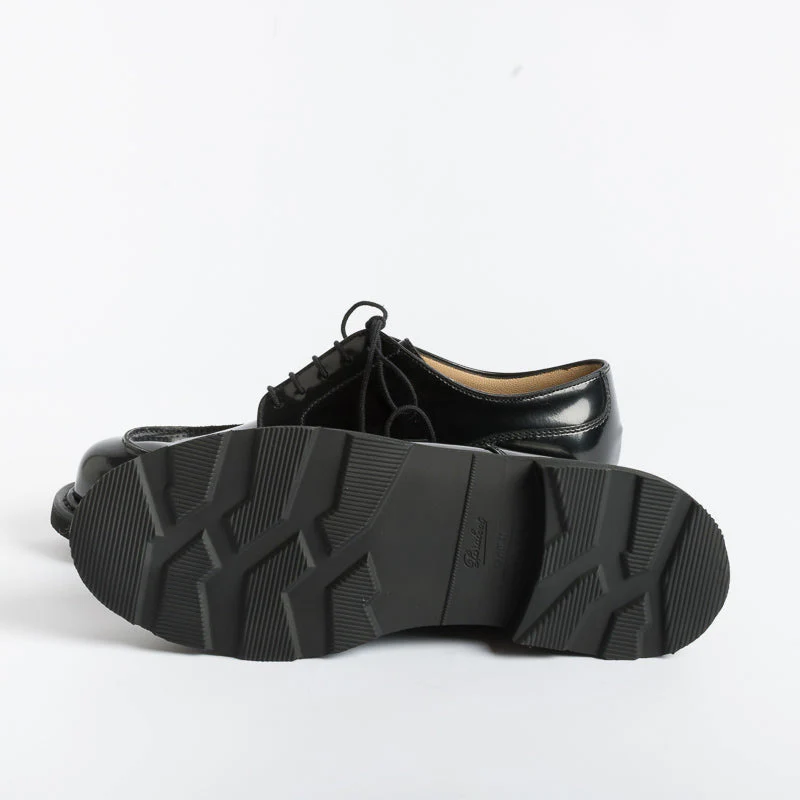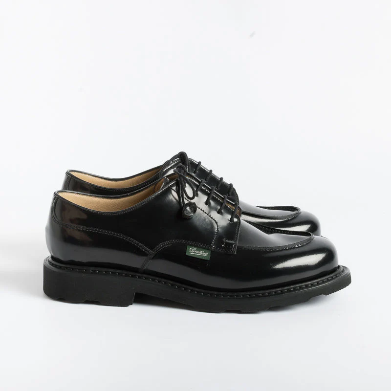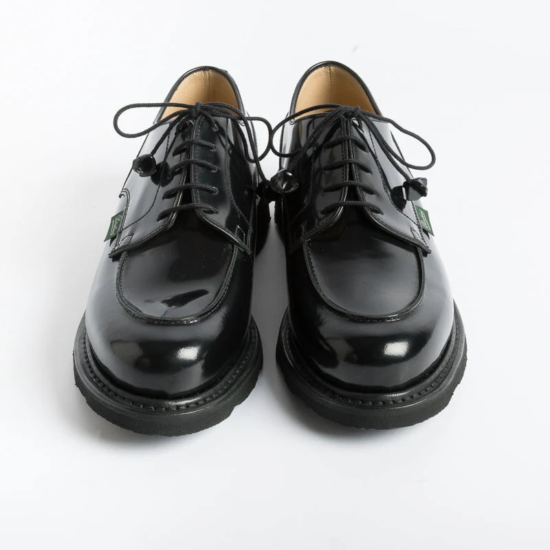 Stringata classica Chambord di Paraboot realizzata in pregiata pelle lucida di colore nero con costruzione norvegese. Doppia impuntura che tiene insieme la tomaia e la soletta, assicurando resistenza e assoluta impermeabilità. Fodera interna in pelle, 5 fori, morbidi lacci in cotone. Autentiche suole Paraboot in gomma.