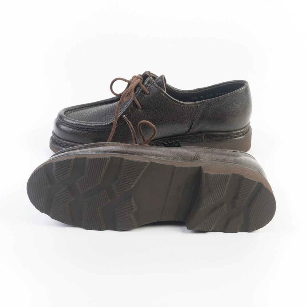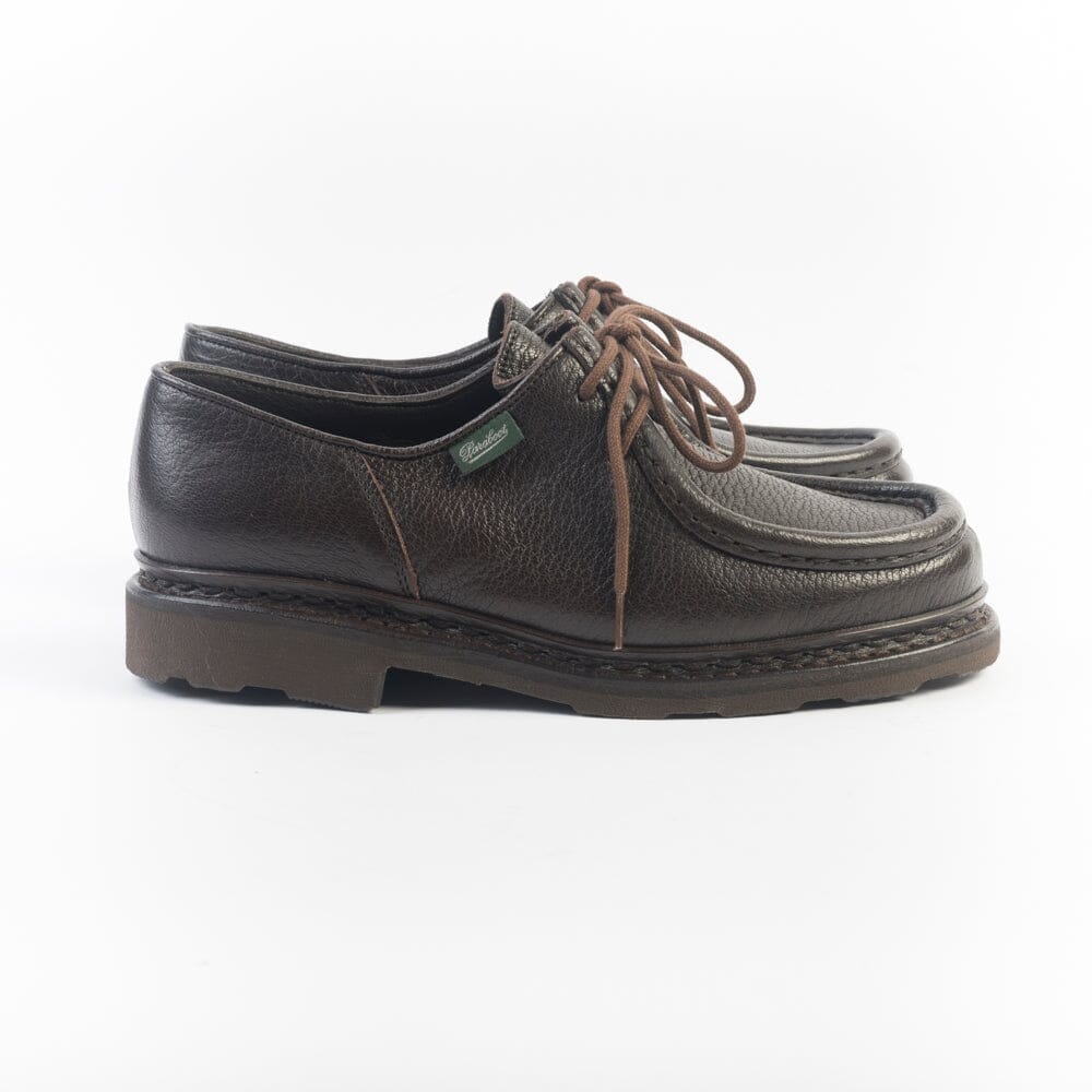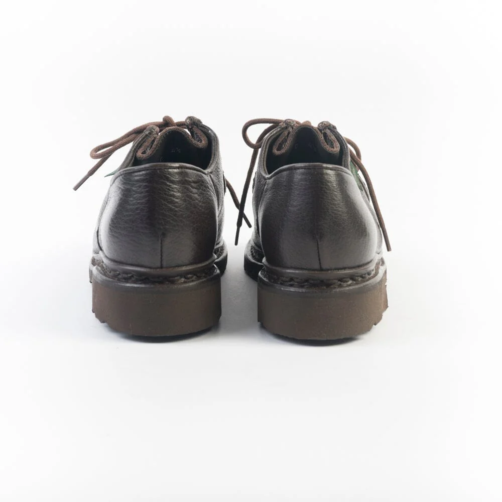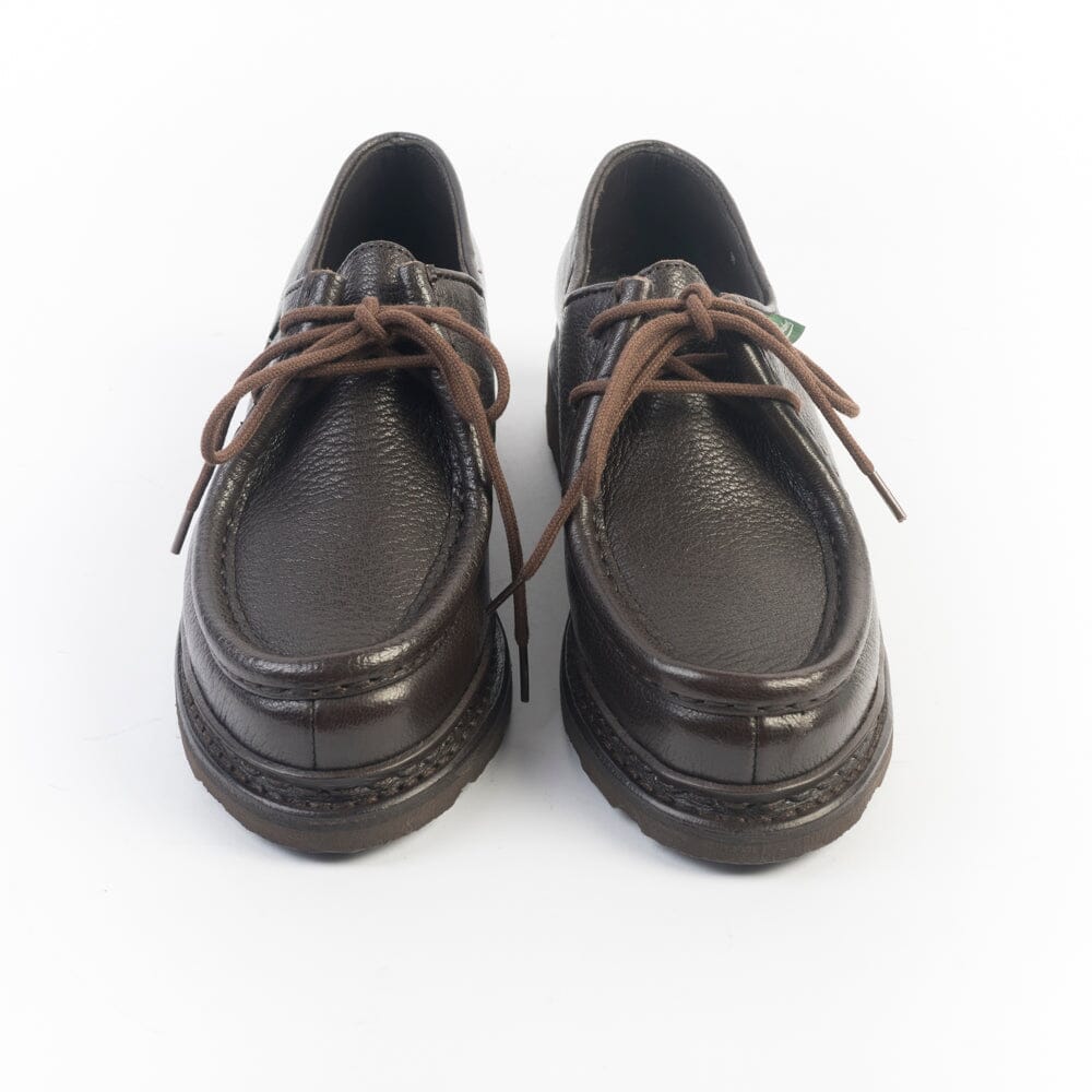 Iconico Derby Michael di Paraboot in morbidissima pelle di cervo martellata, di colore marrone. Doppia cucitura norvegese che tiene insieme la tomaia e la soletta, assicurando resistenza e assoluta impermeabilità. Fodera interna in pelle. Morbidi lacci in cotone in nuance. Autentiche suole Paraboot in gomma naturale.