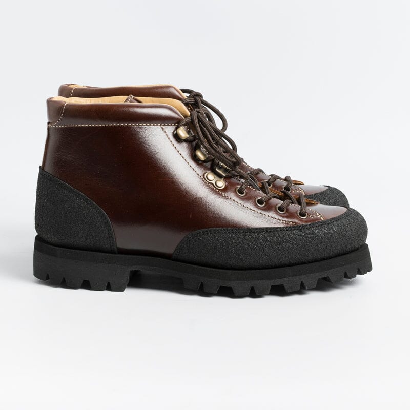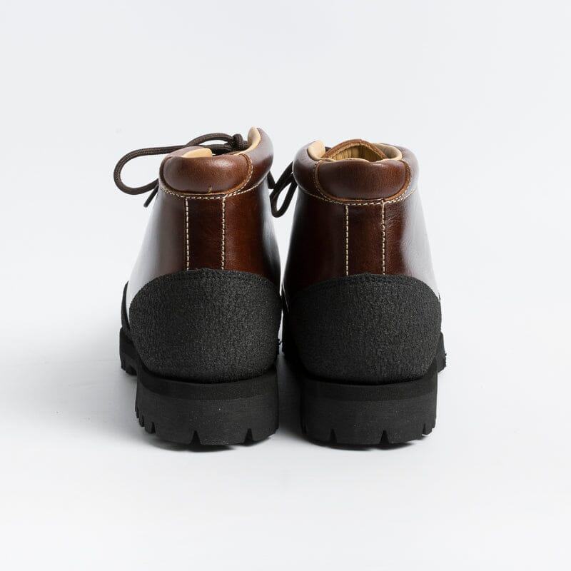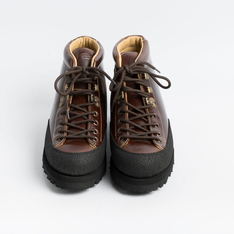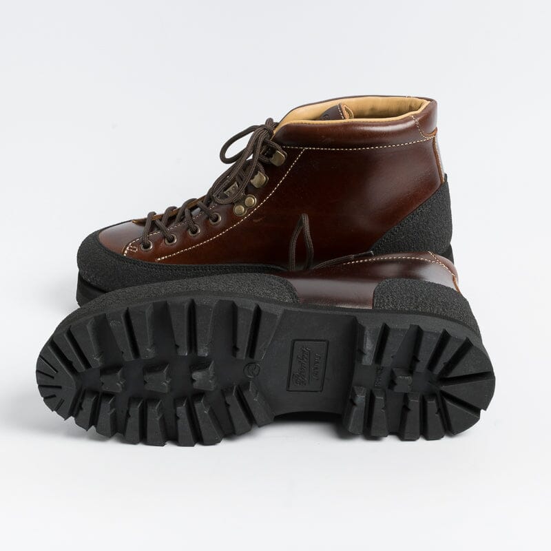 Pedula Yosemite di Paraboot, realizzatoin pregiata pelle conciata al vegetale di colore marrone. Chiusura tramite quattro passanti e tre ganci con lacci in cotone di colore testa di moro. Rivestimento in materiale gommato di colore nero che assicura resistenza e impermeabilità. Fodera interna in pelle. Autentiche suole Paraboot in gomma.