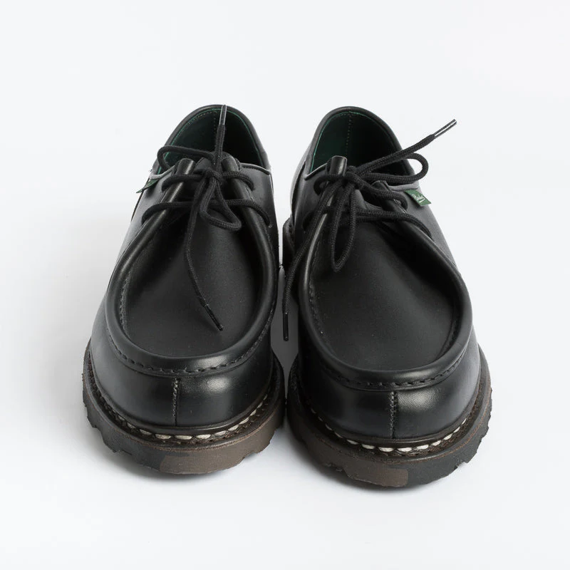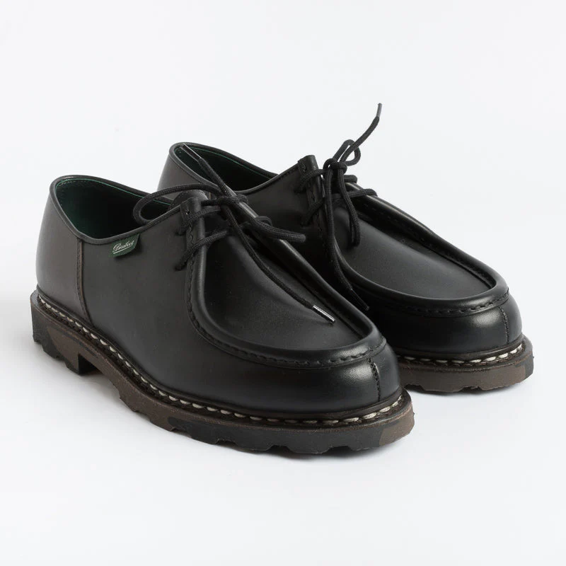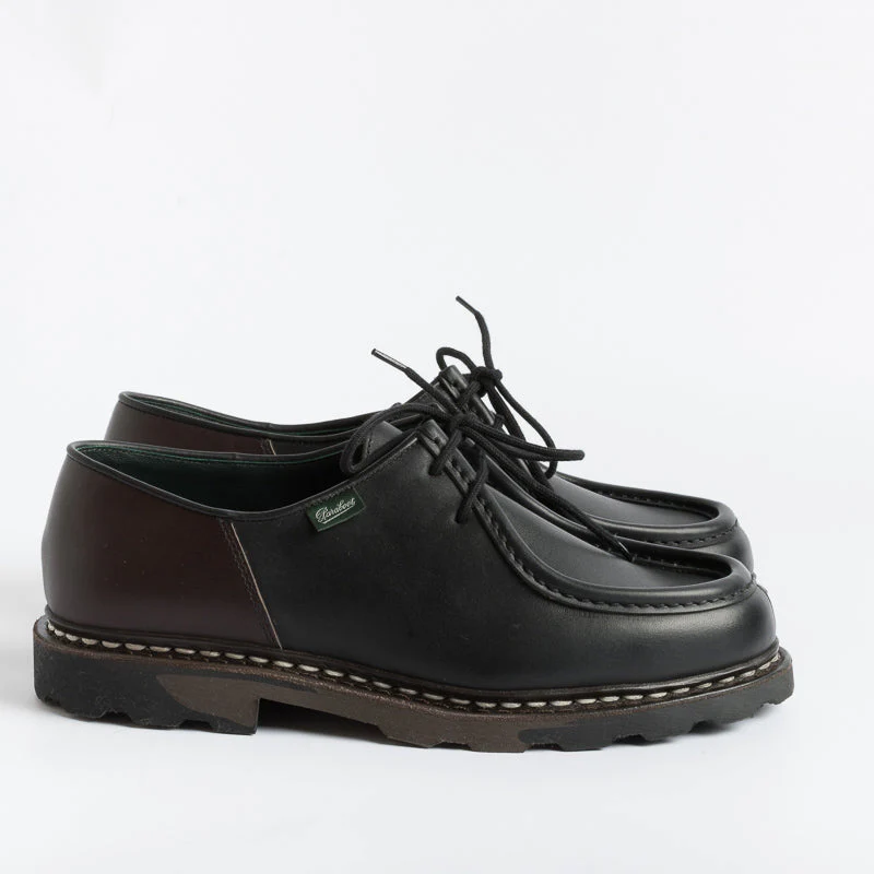 Iconico Derby Michael / Marche II Paraboot in pregiata pelle conciata al vegetale di colore nero e caffé con costruzione norvegese. Doppia impuntura che tiene insieme la tomaia e la soletta, assicurando resistenza e assoluta impermeabilità. Fodera interna in pelle. Morbidi lacci in cotone. Autentiche suole Paraboot in gomma bicolore.