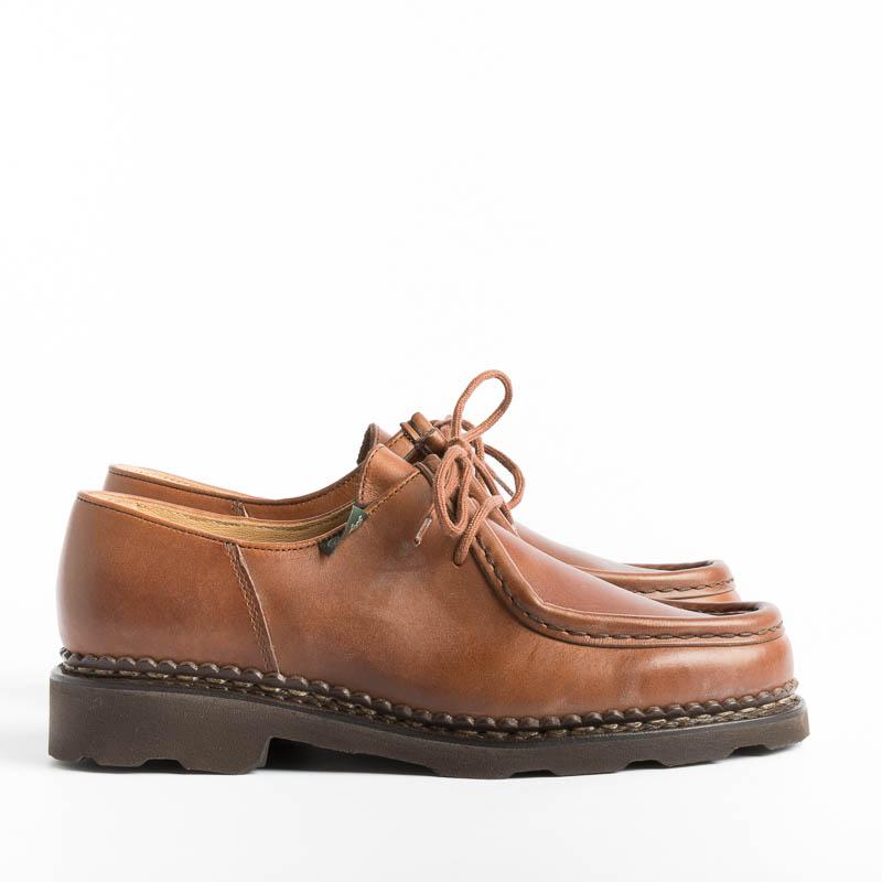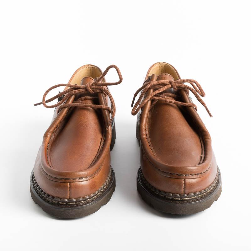 Iconico Derby Michael di Paraboot in pelle conciata al vegetale di colore cuoio. Doppia cucitura norvegese che tiene insieme la tomaia e la soletta, assicurando resistenza e assoluta impermeabilità. Fodera interna in pelle. Morbidi lacci in cotone marrone. Autentiche suole Paraboot in gomma naturale.