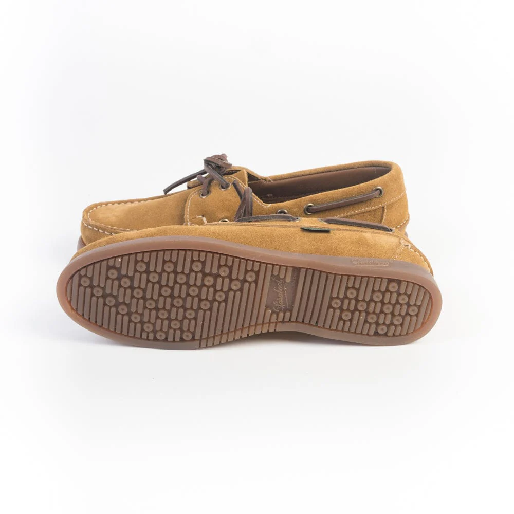 Iconica calzatura da barca realizzata da Paraboot con cucitura Blake, realizzata a mano in camoscio di colore miele. Derby a vaschetta con due occhielli. Suola in gomma in naturale.