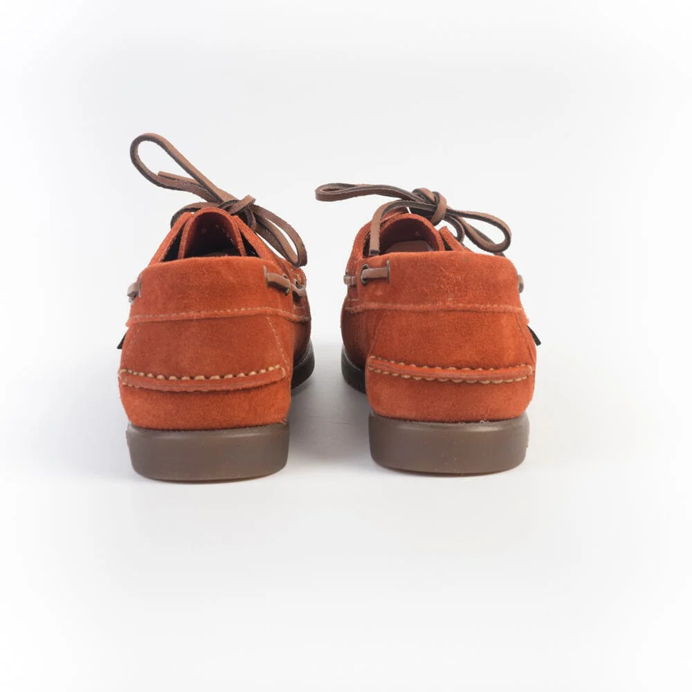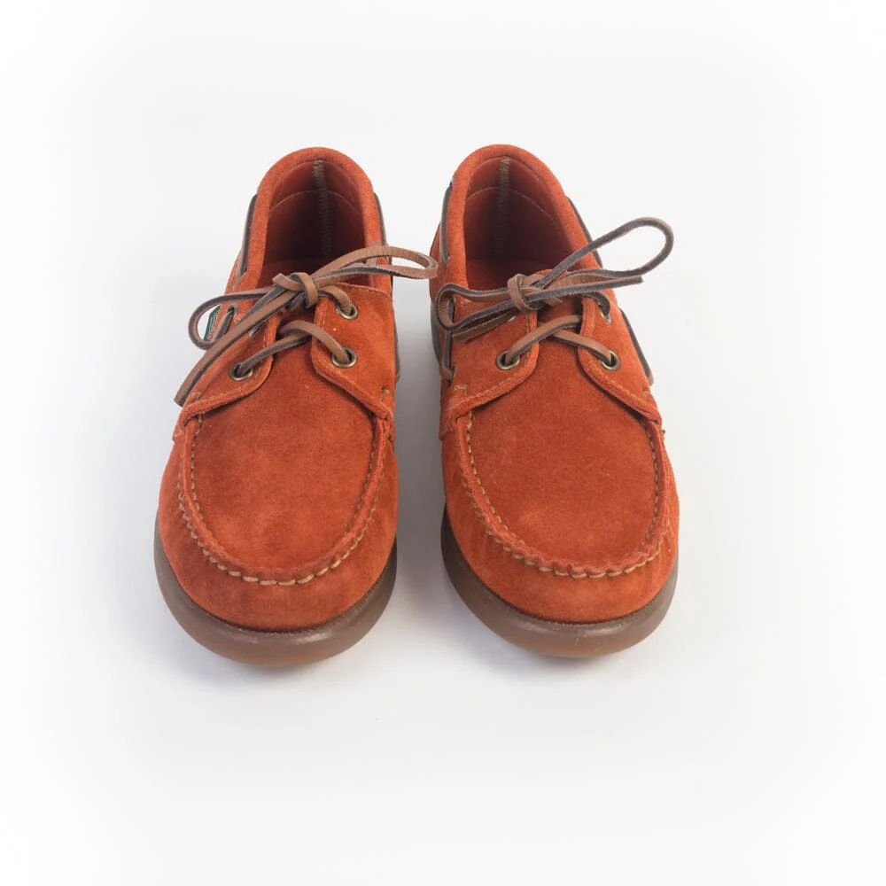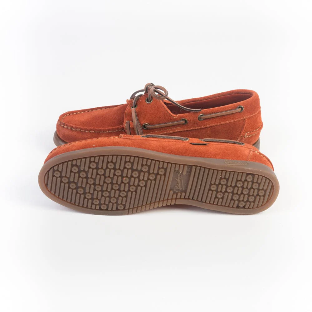 Iconica calzatura da barca realizzata da Paraboot con cucitura Blake, realizzata a mano in camoscio di colore mattone. Derby a vaschetta con due occhielli. Suola in gomma di colore naturale.