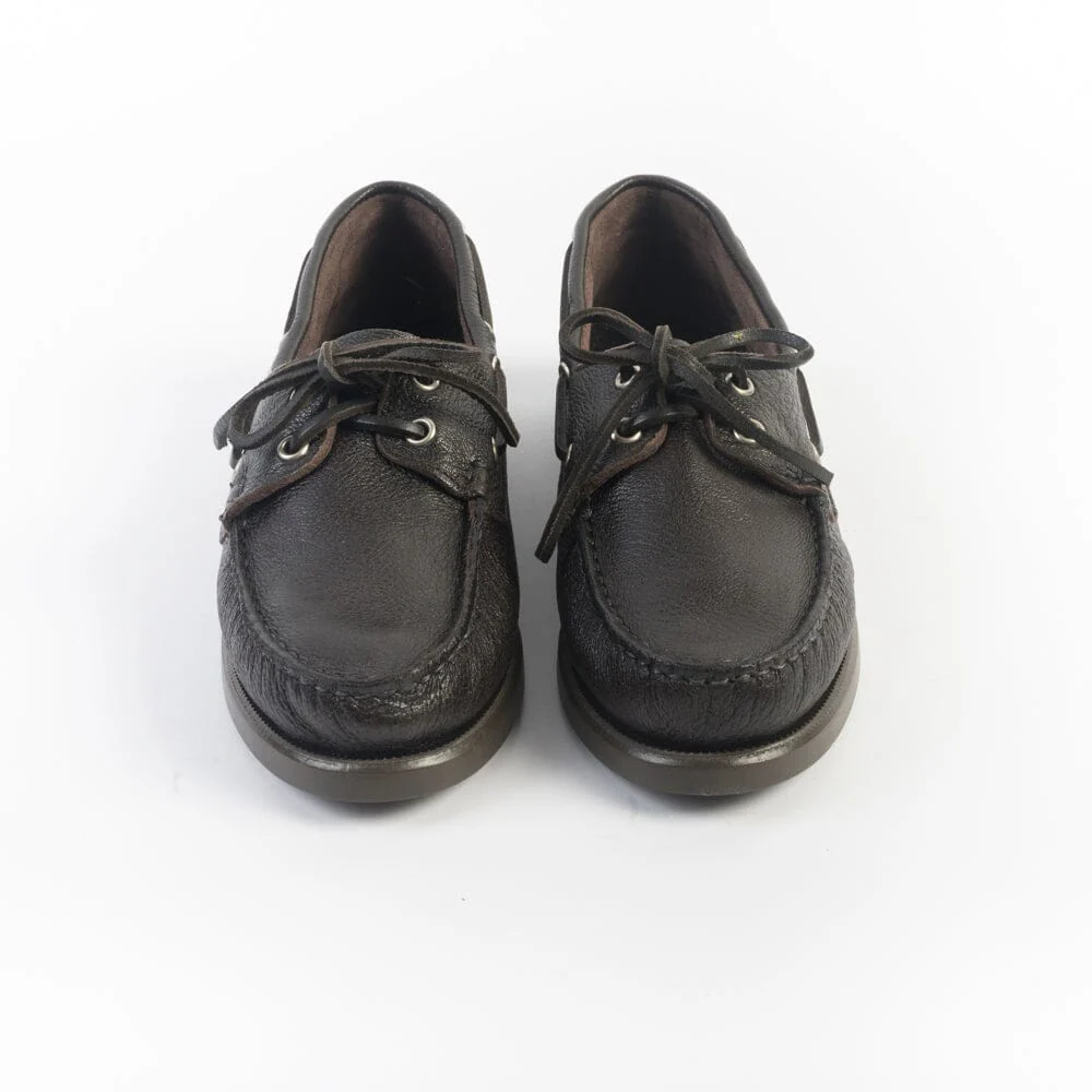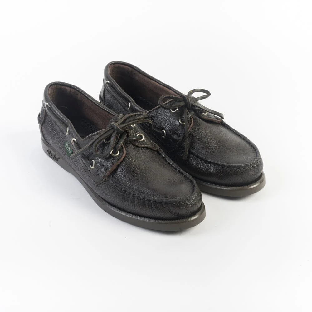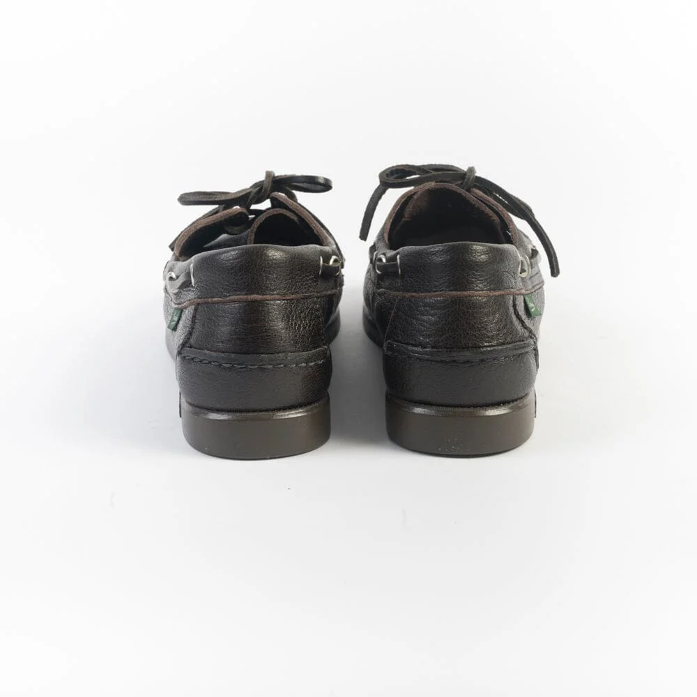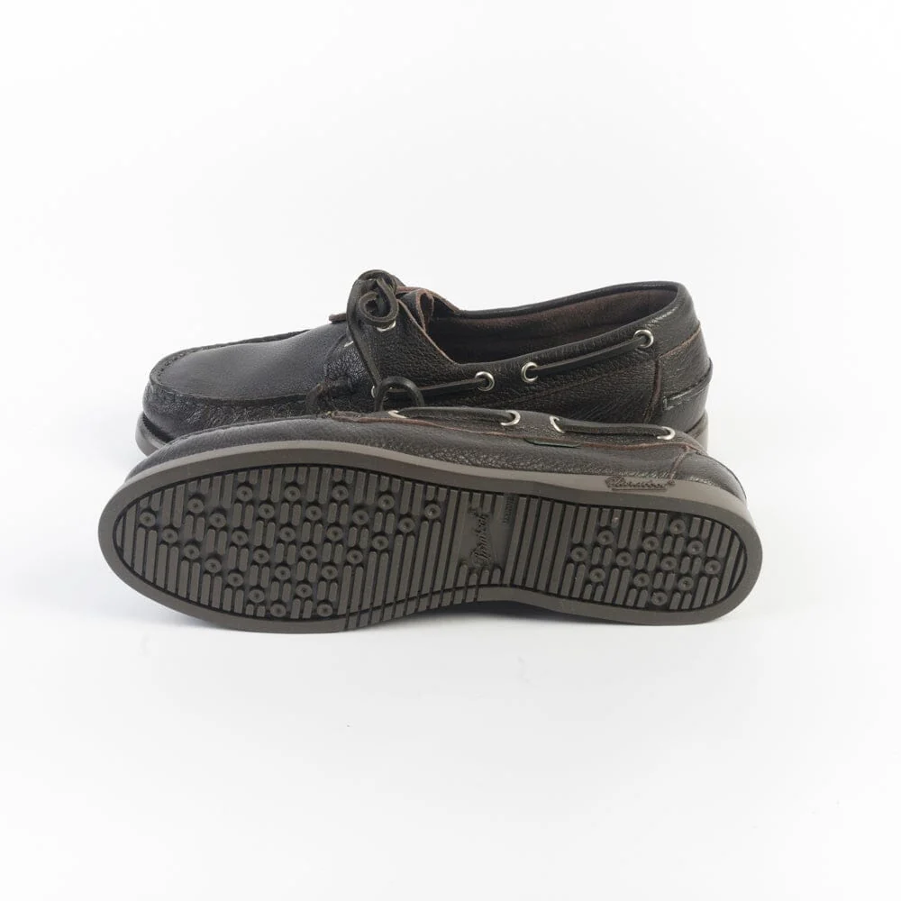 Iconica calzatura da barca realizzata da Paraboot con cucitura Blake, realizzata a mano in morbidissima pelle di cervo martellata di colore testa di moro. Derby a vaschetta con due occhielli. Suola in gomma in nuance.