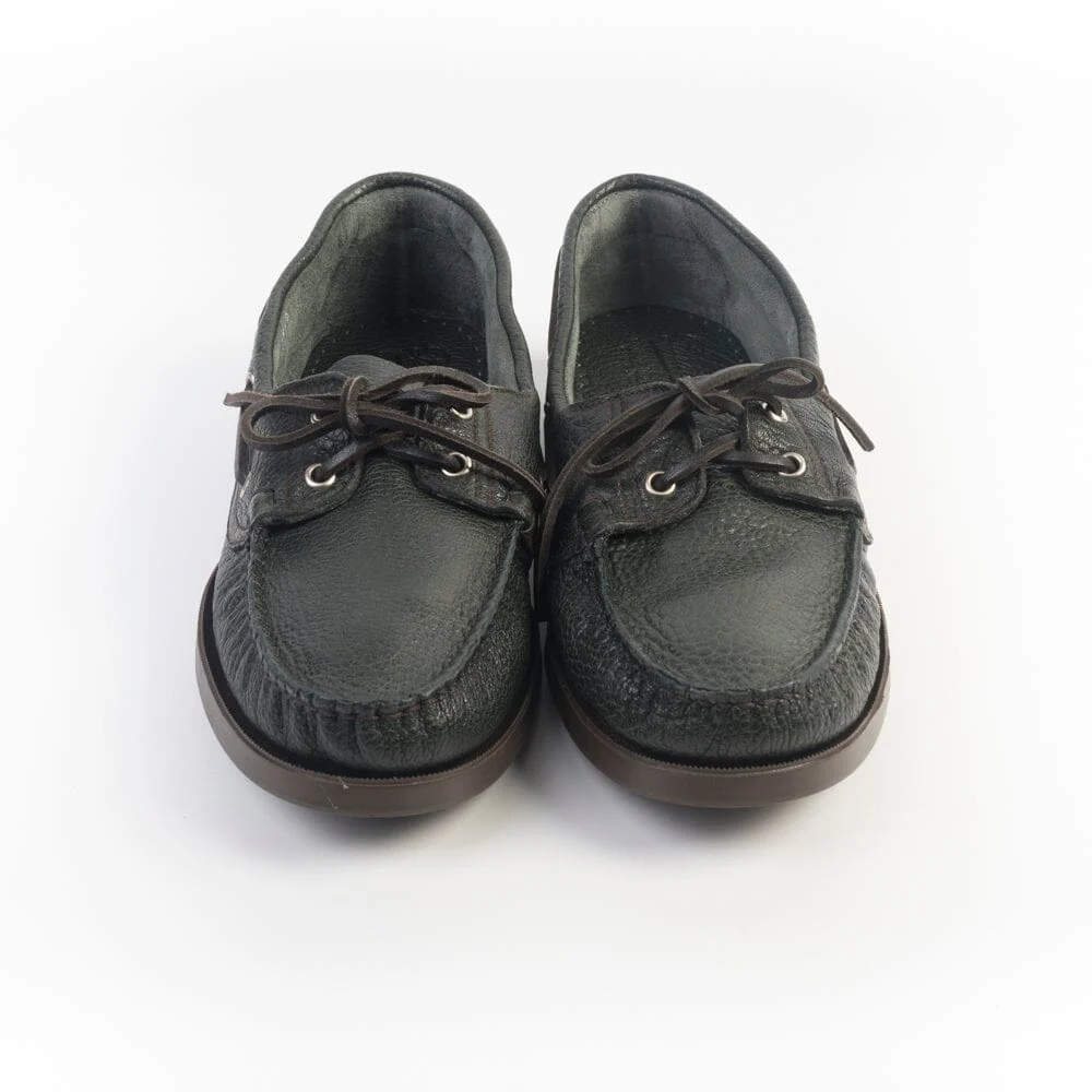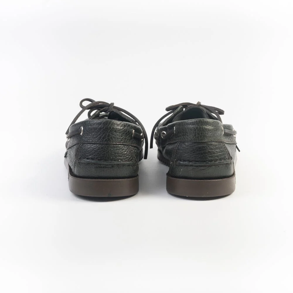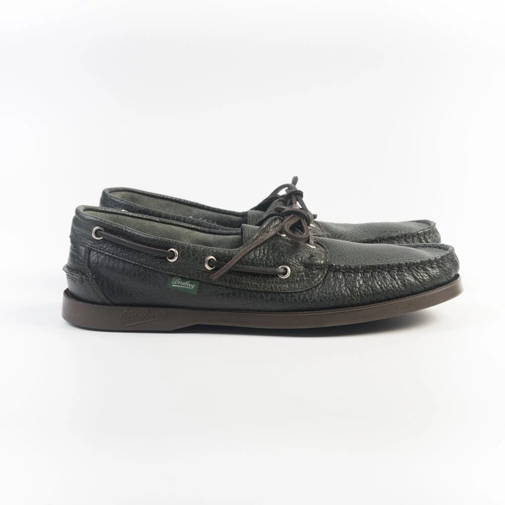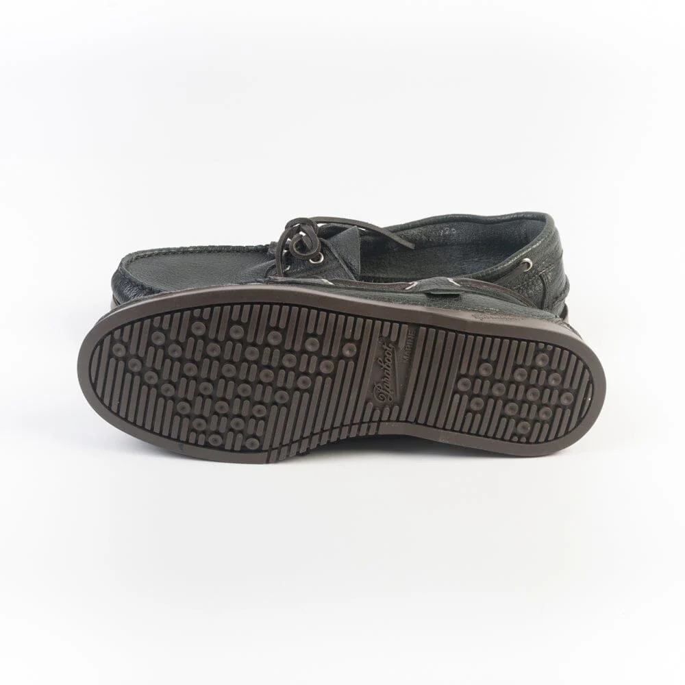 Iconica calzatura da barca di Paraboot con cucitura Blake, realizzata a mano in morbidissima pelle di cervo martellata, di colore verde scuro. Allacciatura con laccio in cuoio, due occhielli. Suola in gomma in nuance.