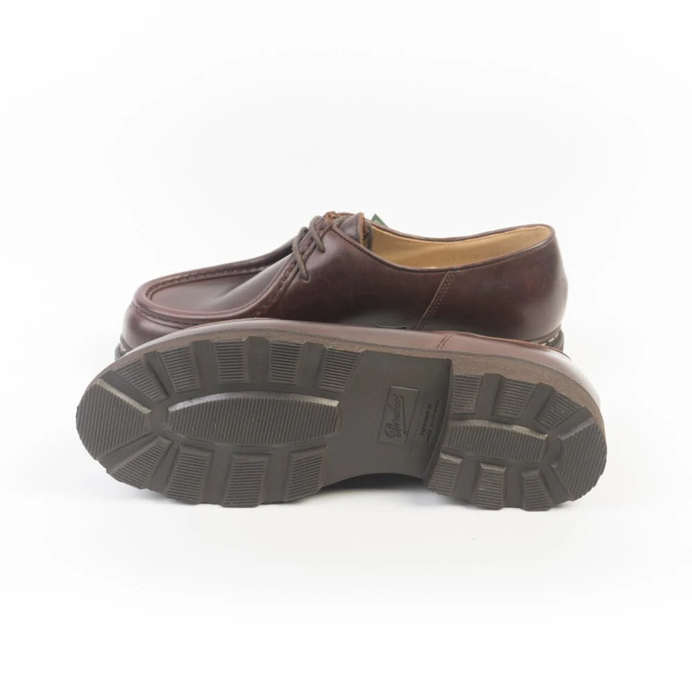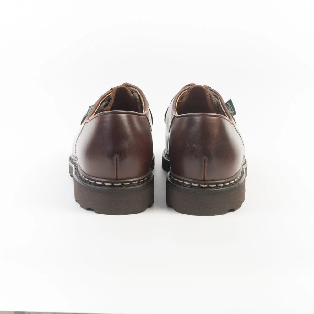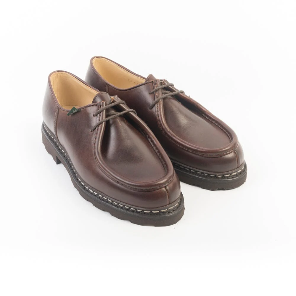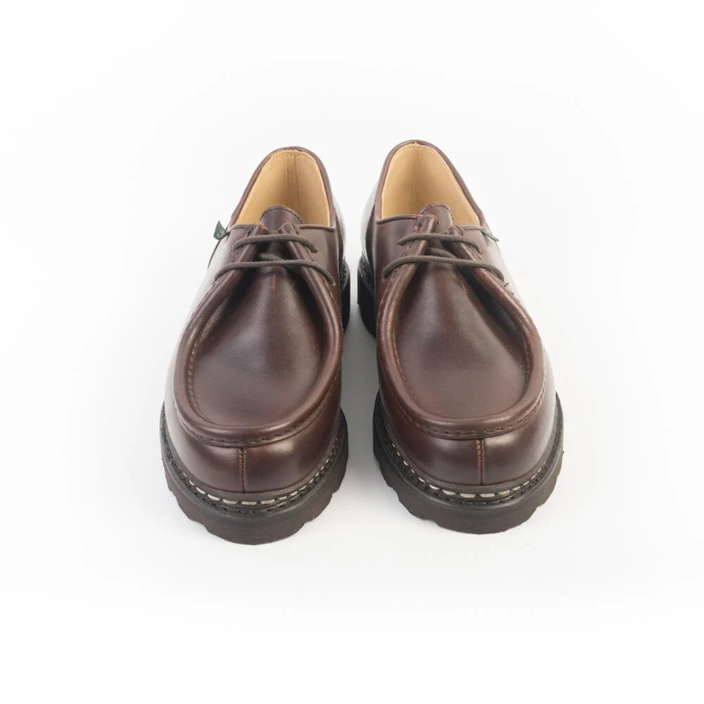Iconico Derby Michael di Paraboot qui realizzato in pregiata pelle conciata al vegetale di colore marrone con costruzione norvegese. Doppia impuntura che tiene insieme la tomaia e la soletta, assicurando resistenza e assoluta impermeabilità. Fodera interna in pelle. Morbidi lacci in cotone. Autentiche suole Paraboot in gomma.