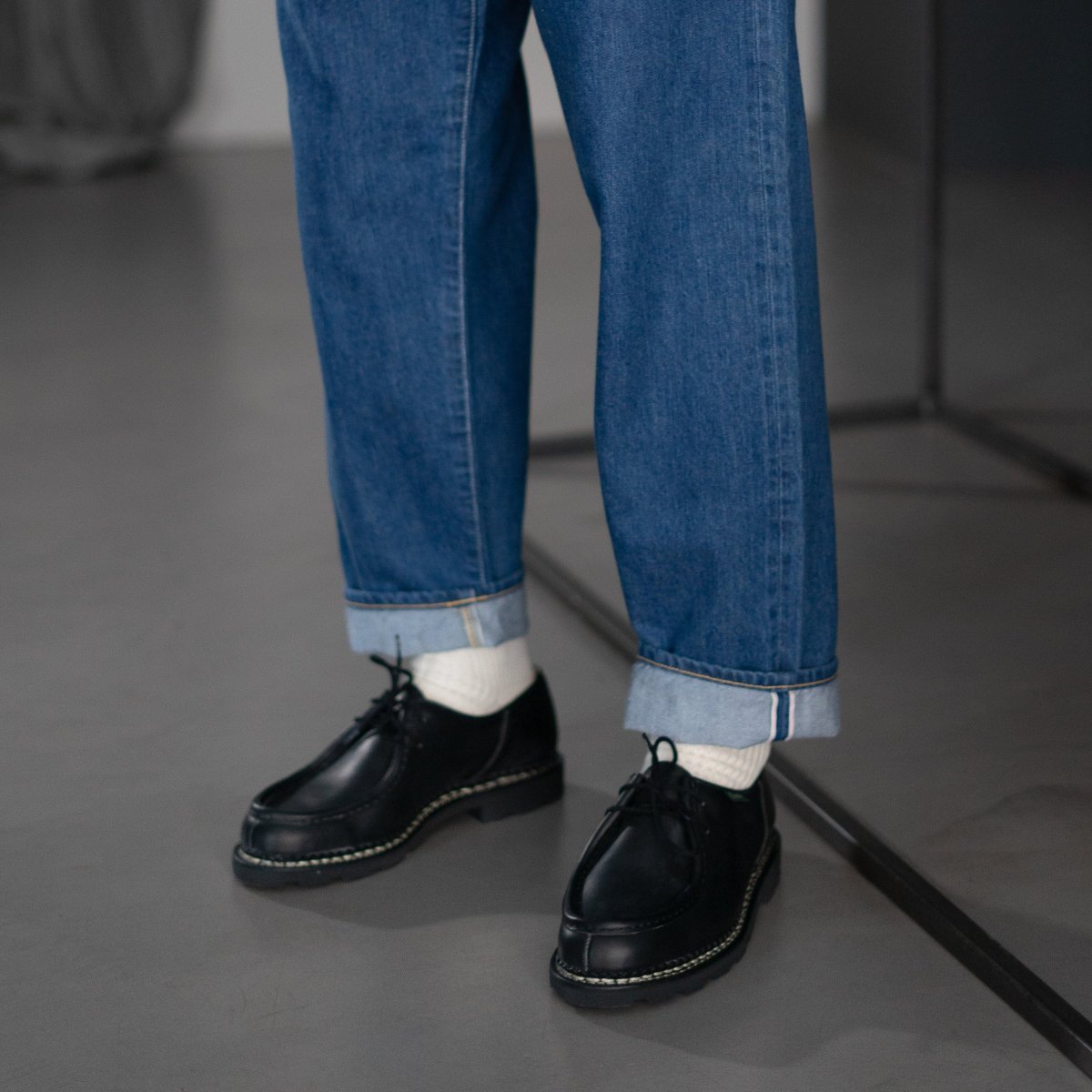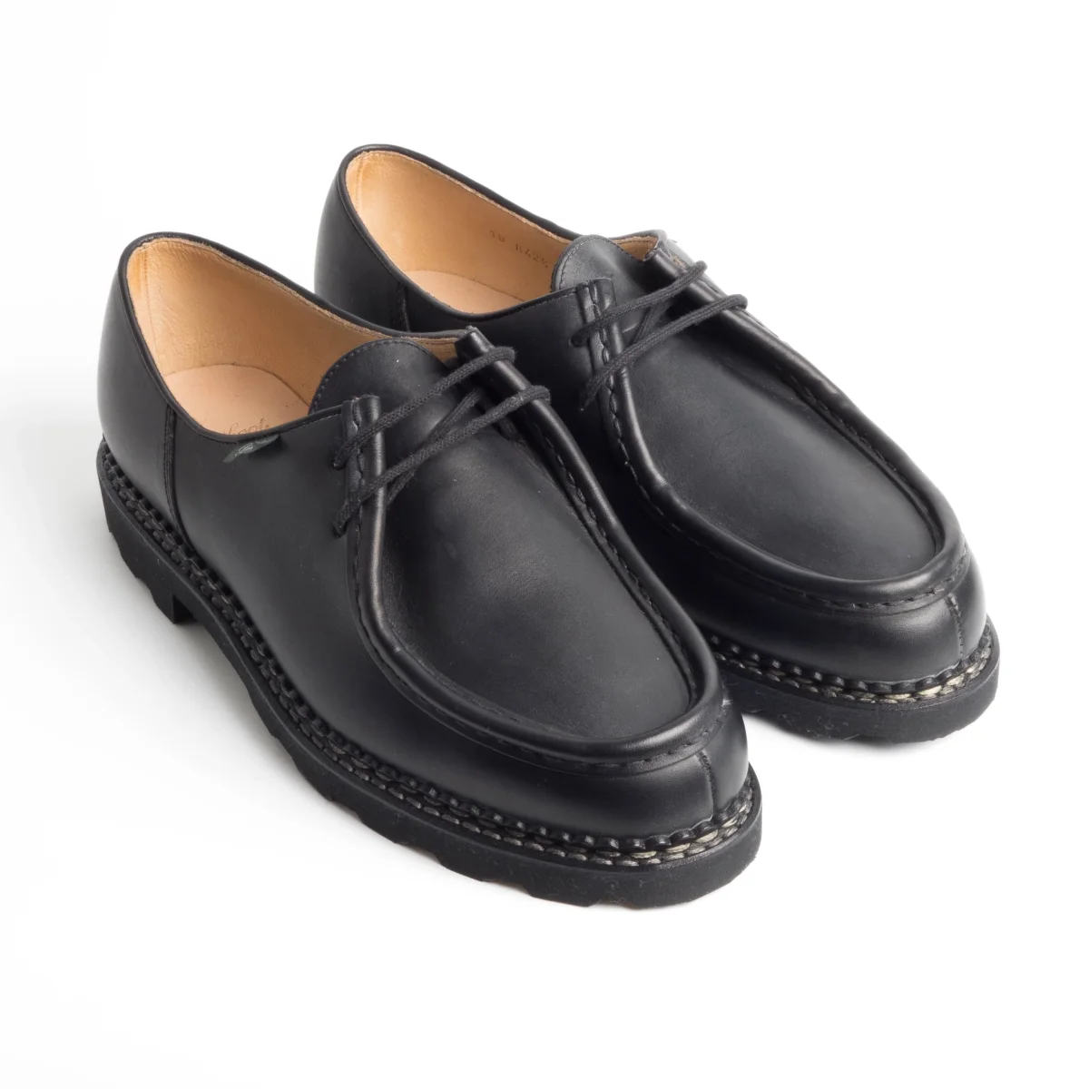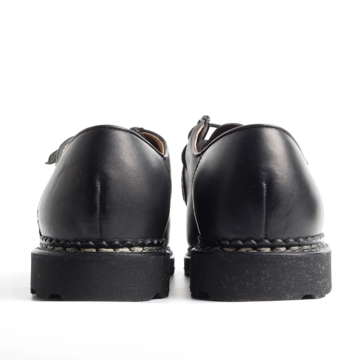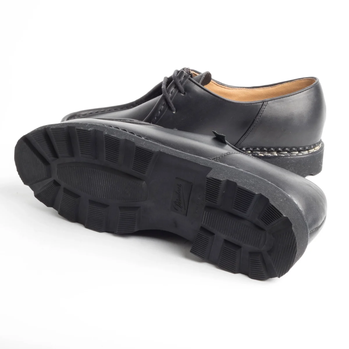 Iconico Derby Michael / Marche II Paraboot in pregiata pelle conciata al vegetale di colore nero con costruzione norvegese. Doppia impuntura che tiene insieme la tomaia e la soletta, assicurando resistenza e assoluta impermeabilità. Fodera interna in pelle. Morbidi lacci in cotone. Autentiche suole Paraboot in gomma.