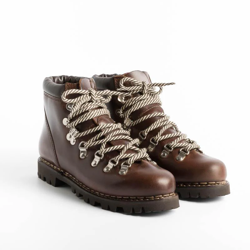 Pedula Avoriaz di Paraboot realizzato in pregiata pelle conciata al vegetale di colore marrone. Chiusura tramite quattro passanti e tre ganci con lacci in cotone. Doppia impuntura che tiene insieme la tomaia e la suola, assicurando resistenza e assoluta impermeabilità. Fodera interna in pelle. Autentiche suole Paraboot in gomma.