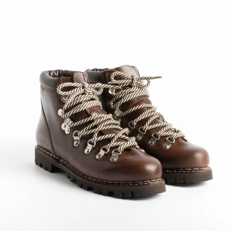 Iconico Hiking Boot Avoriaz / Jannu Paraboot in pregiata pelle conciata al vegetale di colore marrone. Chiusura tramite quattro passanti e tre ganci con lacci in cotone. Doppia impuntura che tiene insieme la tomaia e la suola, assicurando resistenza e assoluta impermeabilità. Fodera interna in pelle. Autentiche suole Paraboot in gomma.