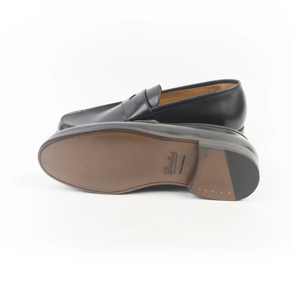 Mocassino con mascherina di Paraboot, realizzato in pregiata pelle di vitello liscia semi lucida di colore nero. Fodera interna in pelle. Autentiche suole Paraboot in cuoio cucite.