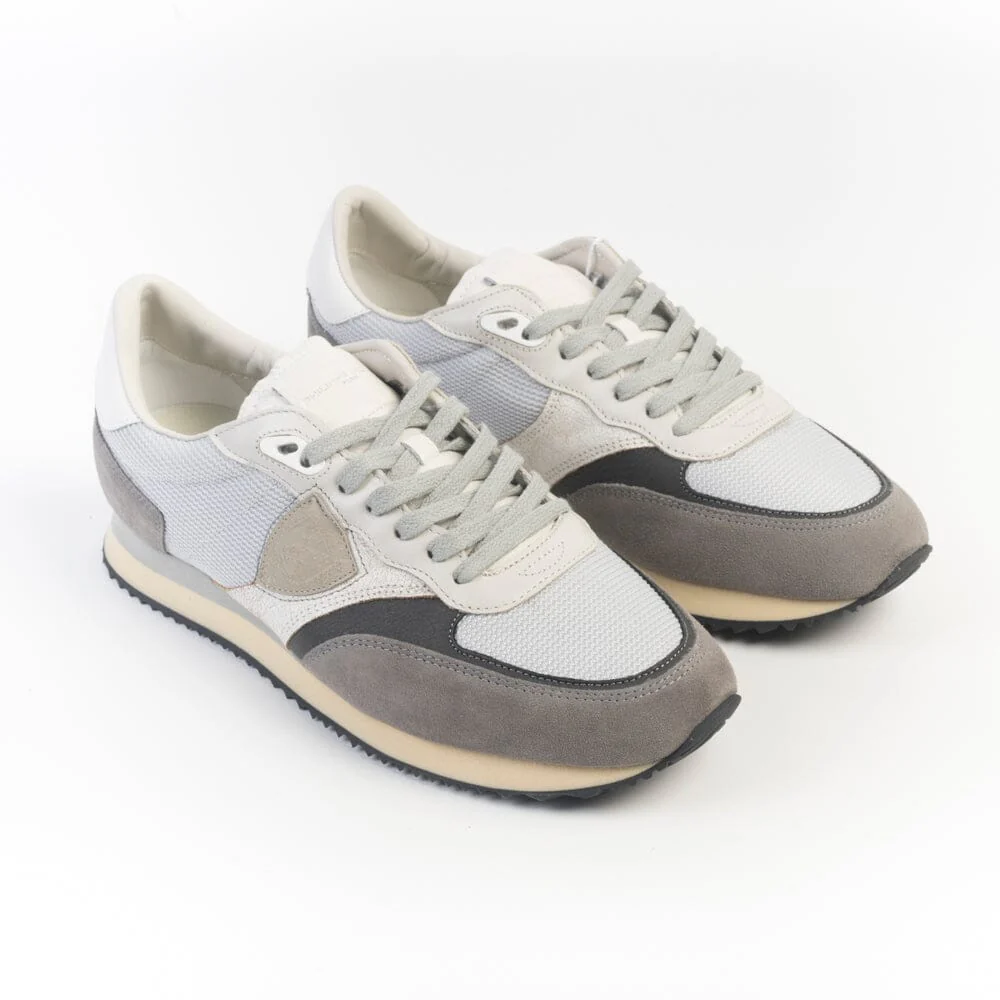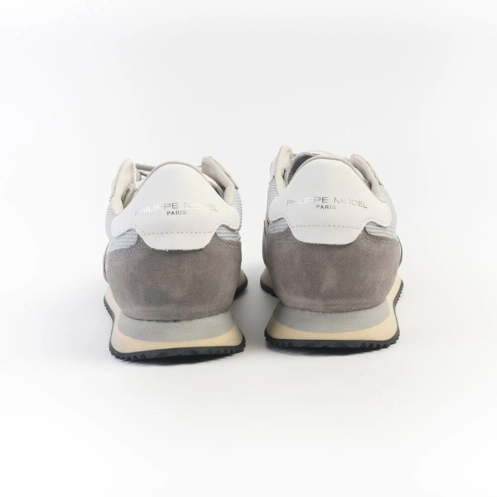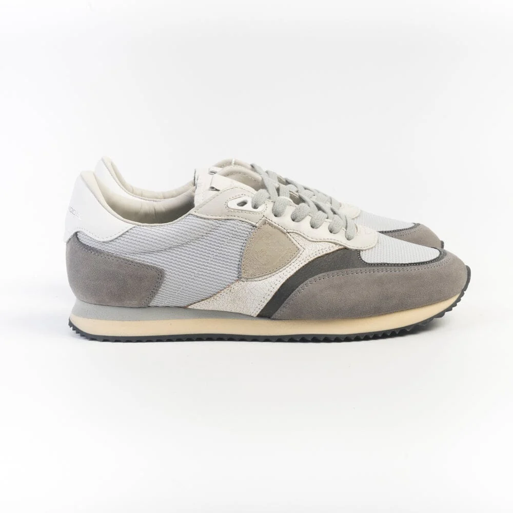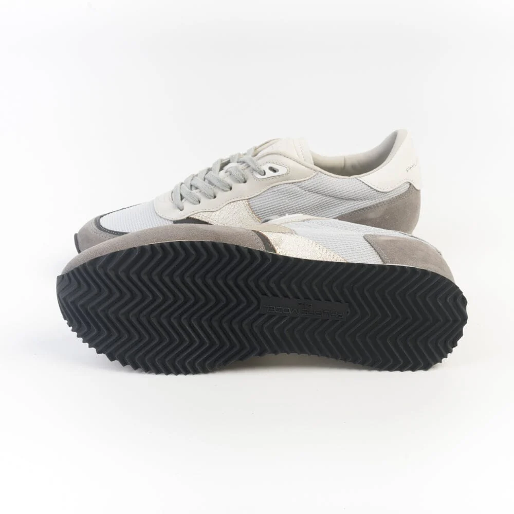 Sneakers running bassa BeIville di Philippe Model con tomaia in tessuto tecnico di colore grigio, pelle di colore grigio antracite, pelle cracklé di colore bianco e suede di colore grigio. Scudetto della Maison laterale di colore beige e inserto posteriore in pelle di colore bianco. Lacci in cotone di colore grigio chiaro. Suola di altezza circa 2 centimetri.