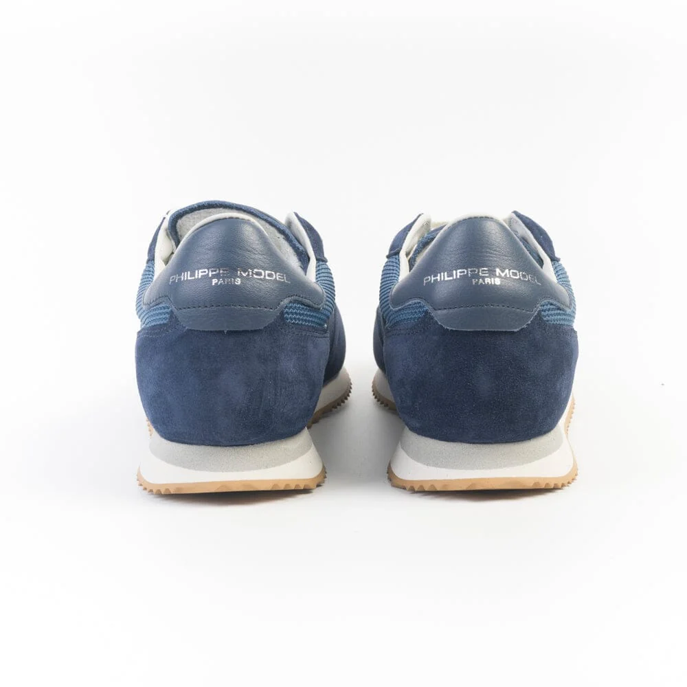 Sneakers running bassa BIville di Philippe Model con tomaia in tessuto tecnico di colore avio, pelle e camoscio di colore blu. Scudetto della Maison laterale e inserto posteriore in pelle di colore blu. Lacci piatti in cotone di colore bianco. Suola di altezza circa 2 centimetri.