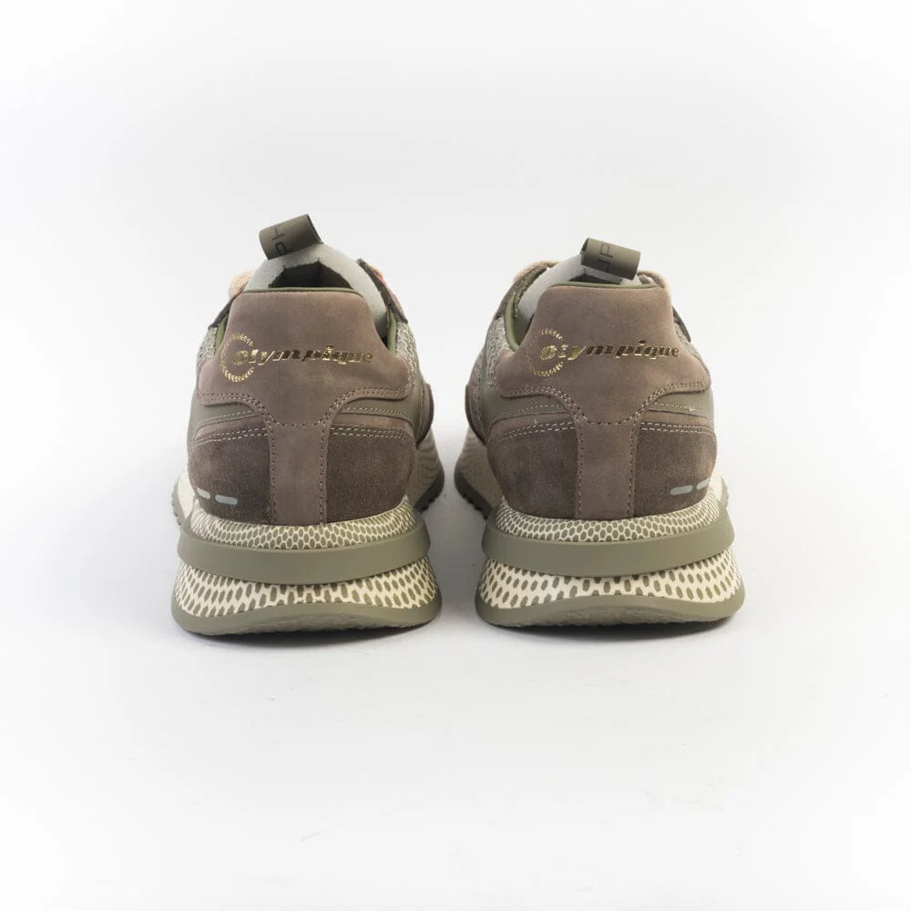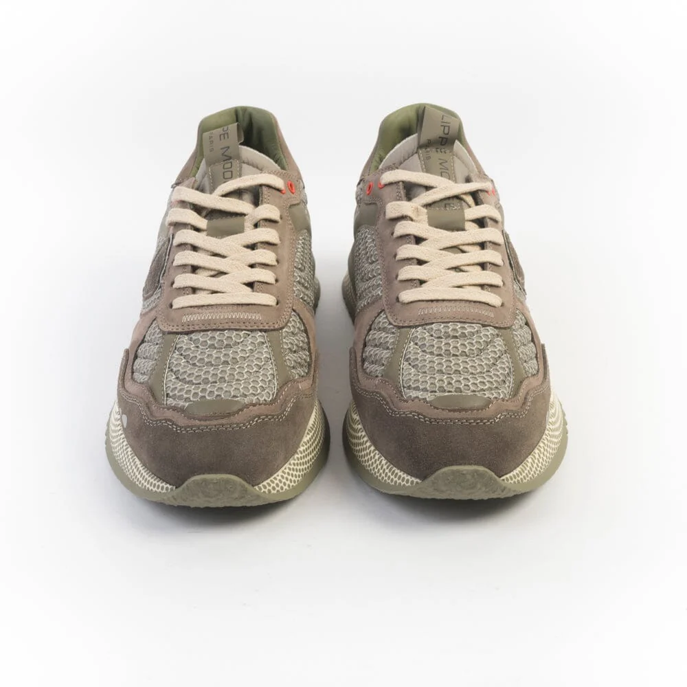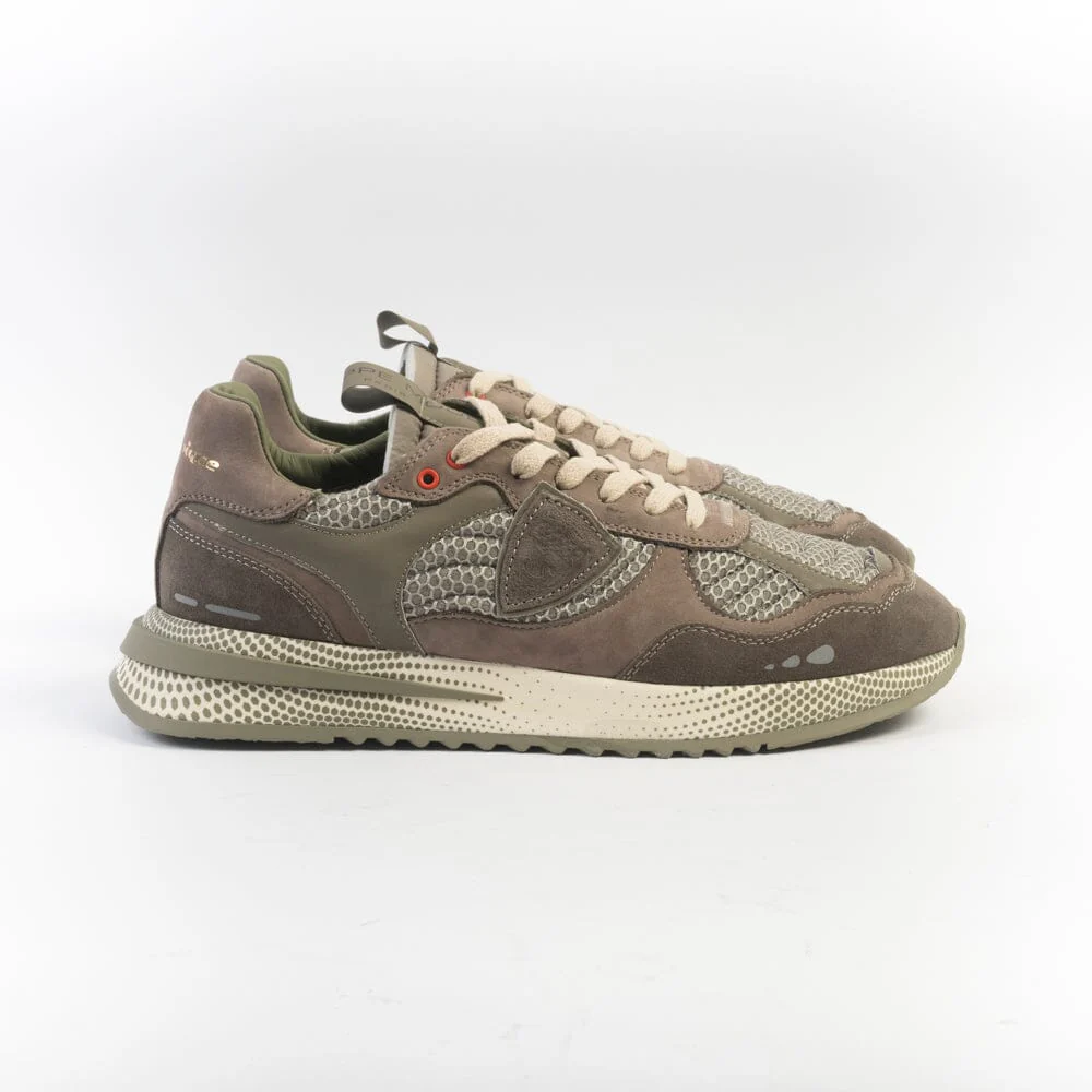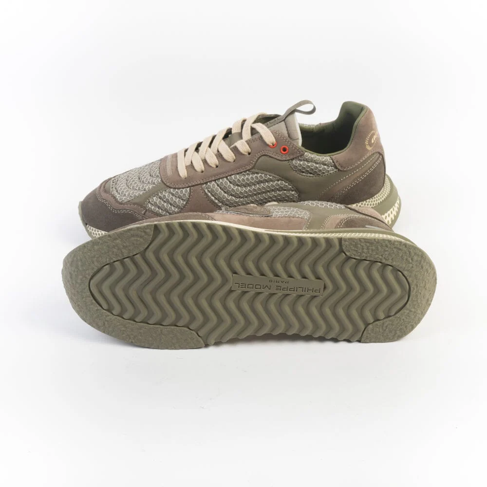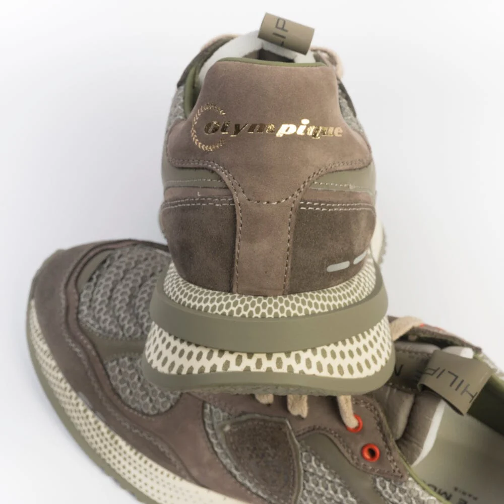 Sneakers Olimpique di Philippe Model, edizione esclusiva per le Olimpiadi. Realizzate in nabuk di colore fango e tessuto tecnico di colore verde militare, inserti in pelle catarinfrangente. Scudetto della Maison laterale in camoscio in nuance. Inserto posteriore con scritta che identifica l’edizione speciale della sneakers. Lacci in cotone di colore avorio. Maxi suola di altezza circa 4 centimetri.