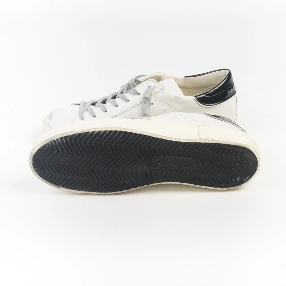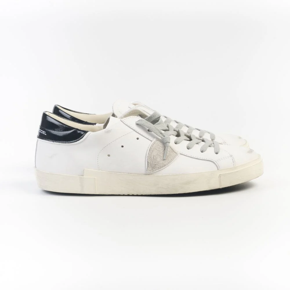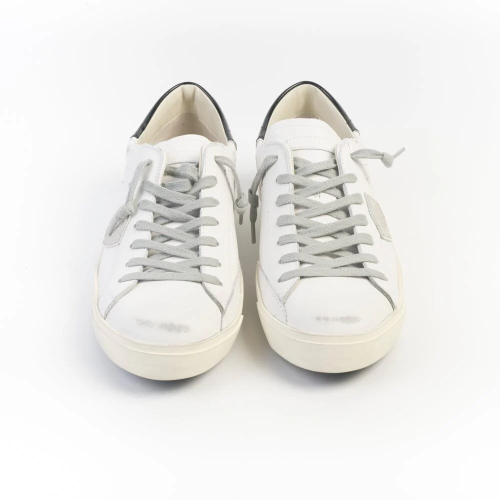 Iconiche sneakers Paris X di Philippe Model realizzate in pelle di colore bianco con trattamenti vintage. Scudetto della Maison cucito lateralmente in camoscio di colore grigio. Inserto posteriore in pelle di colore nero lucido con logo in contrasto di colore bianco. Lacci piatti in cotone di colore grigio. Suola trattata con effetto vintage, altezza 2.5 centimetri.