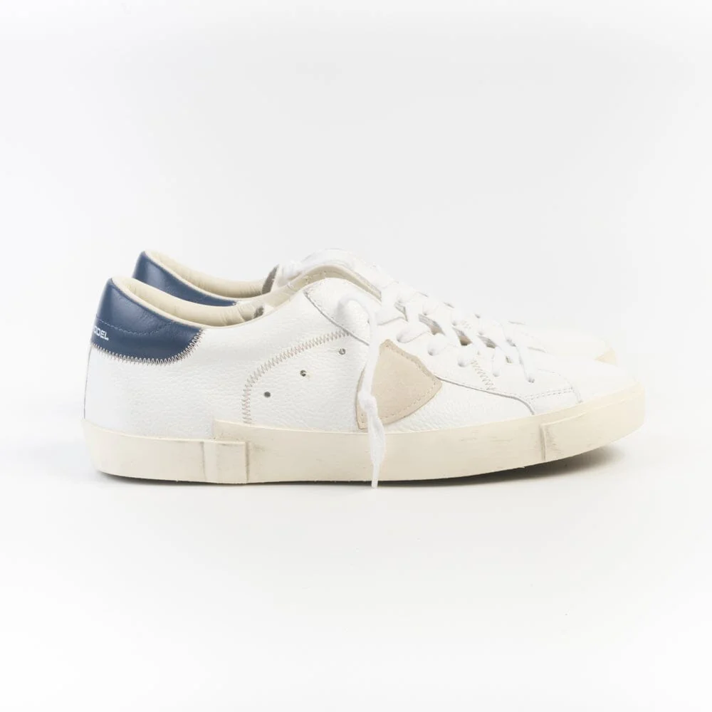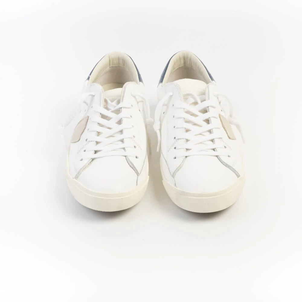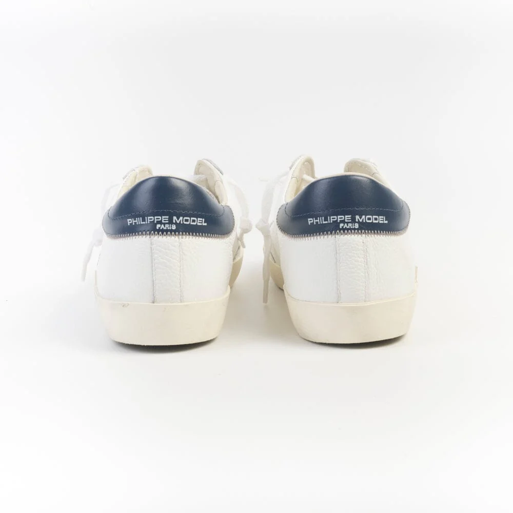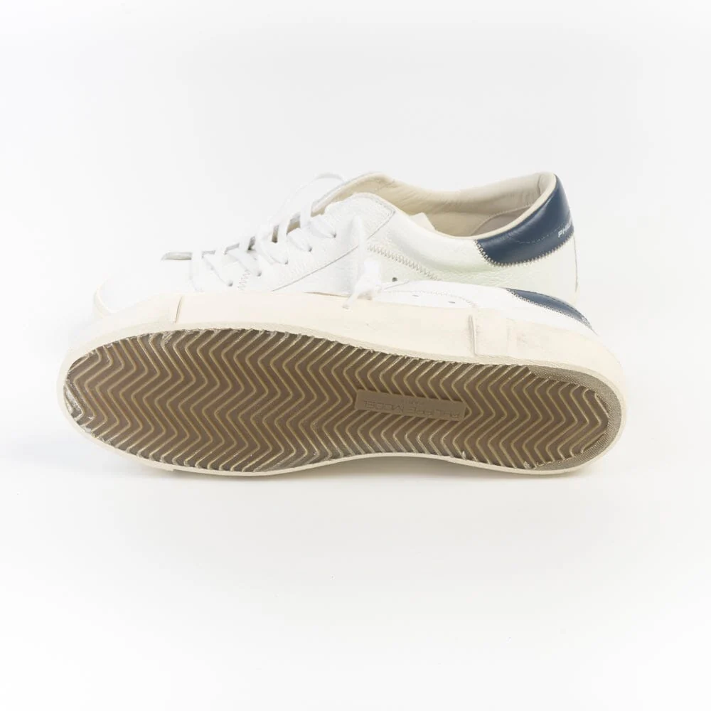 Iconiche sneakers Paris X di Philippe Model realizzate in pelle martellata di colore bianco. Scudetto della Maison cucito lateralmente in pelle di colore beige. Inserto posteriore in pelle di colore blu con logo in contrasto di colore bianco. Lacci piatti in cotone di colore bianco. Suola trattata con effetto vintage, altezza 2.5 centimetri.