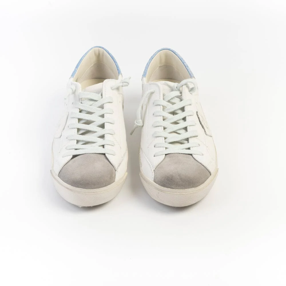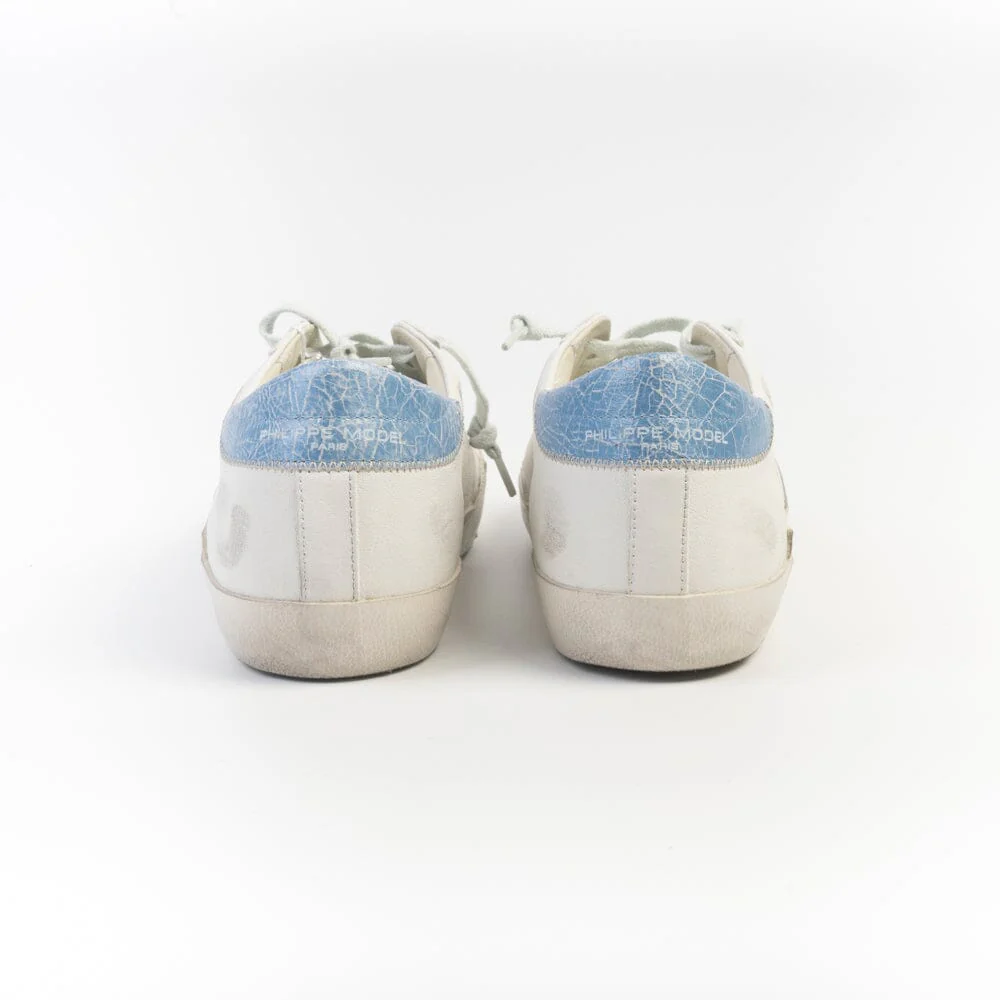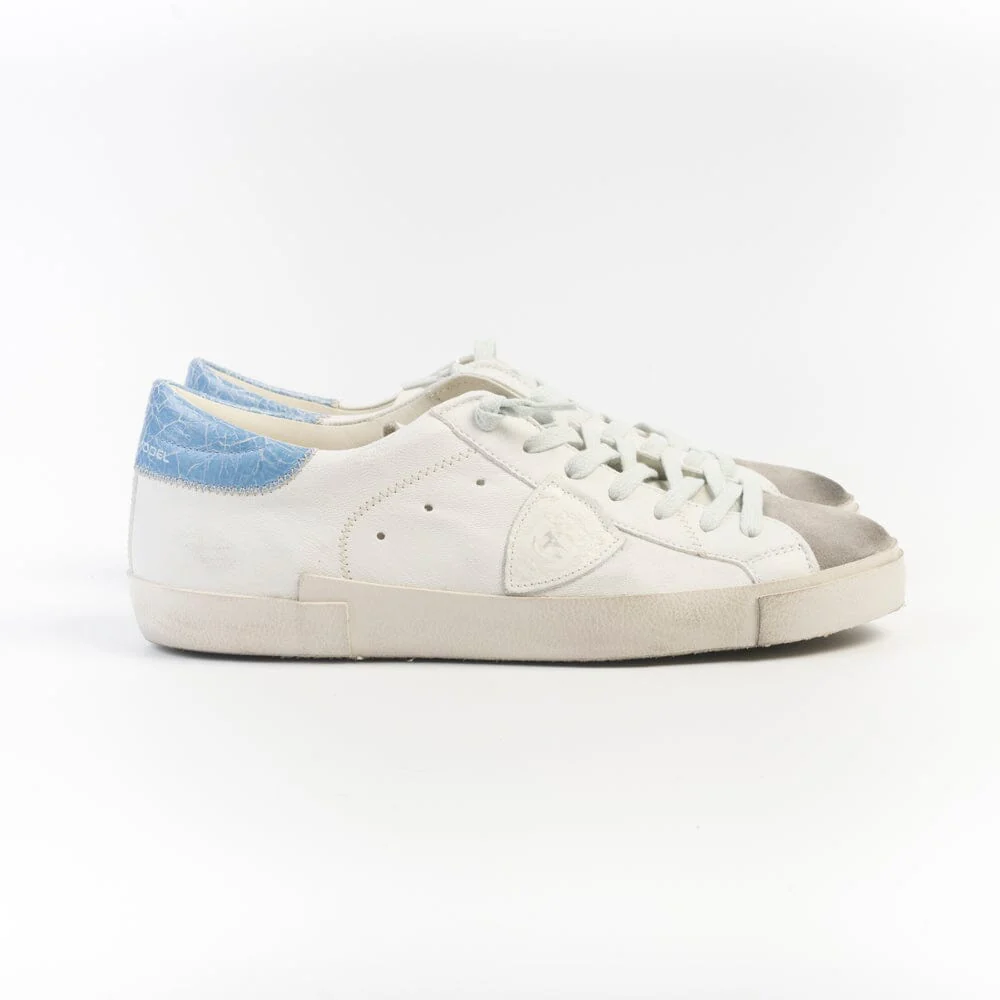Iconiche sneakers ParisX di Philippe Model realizzate in morbida pelle di colore avorio con trattamenti vintage e camoscio di colore grigio. Scudetto della Maison cucito lateralmente in pelle in nuance. Inserto posteriore in pelle effetto craklè di colore azzurro con logo Philippe Model in contrasto di colore bianco. Lacci in cotone di colore azzuro chiaro. Suola trattata con effetto vintage in nuance, altezza 2.5 centimetri.