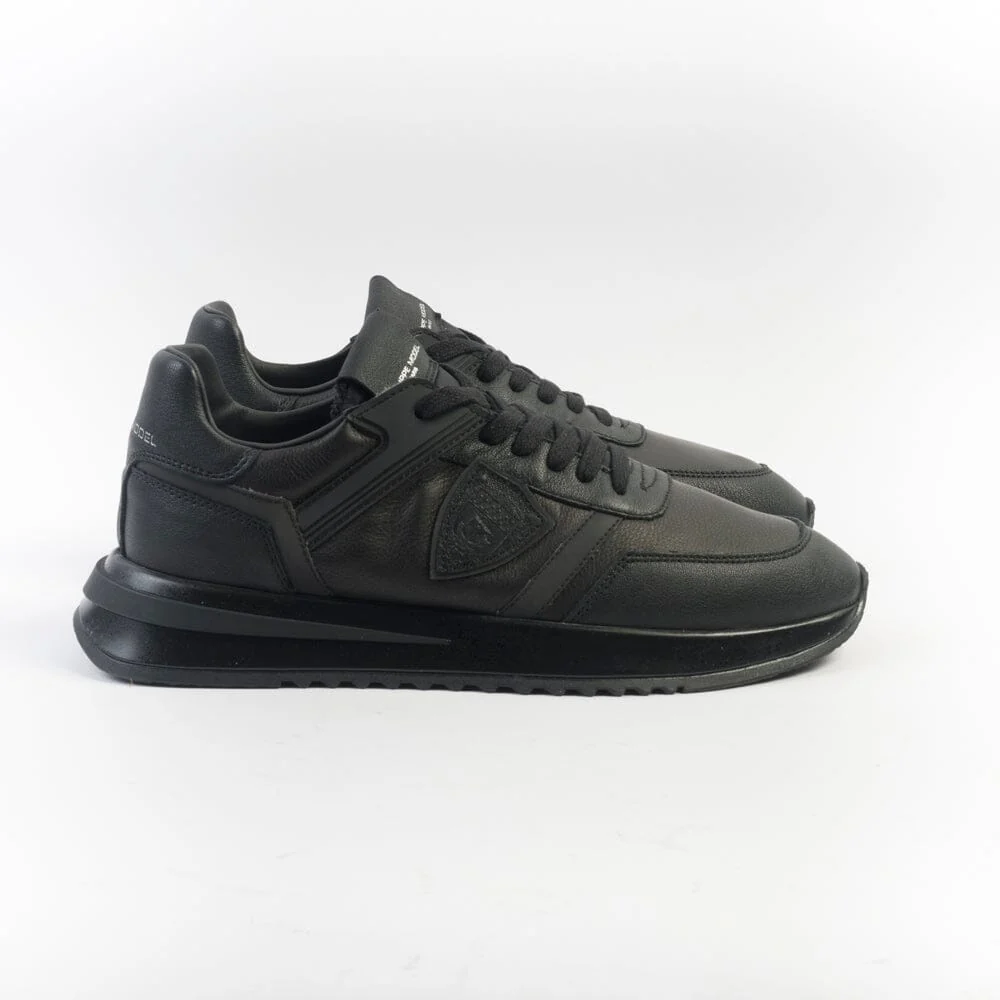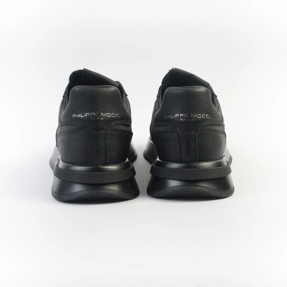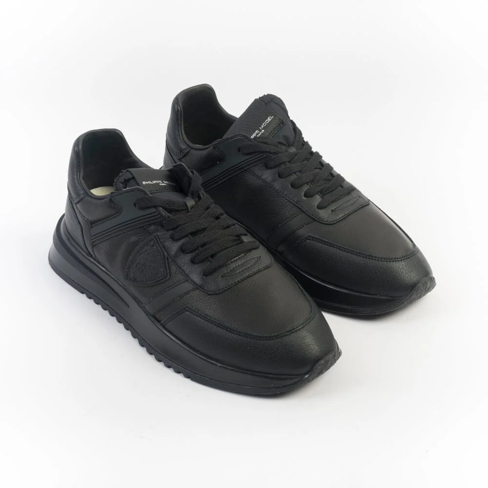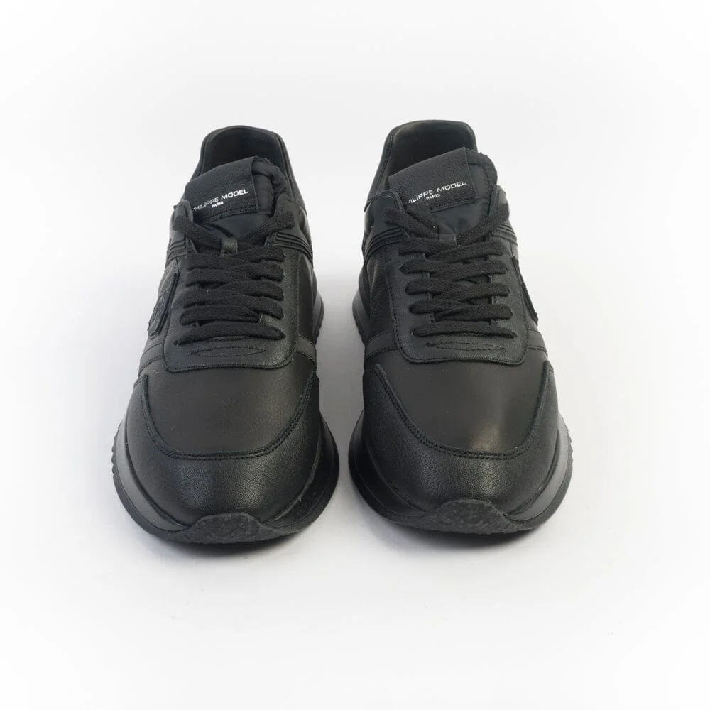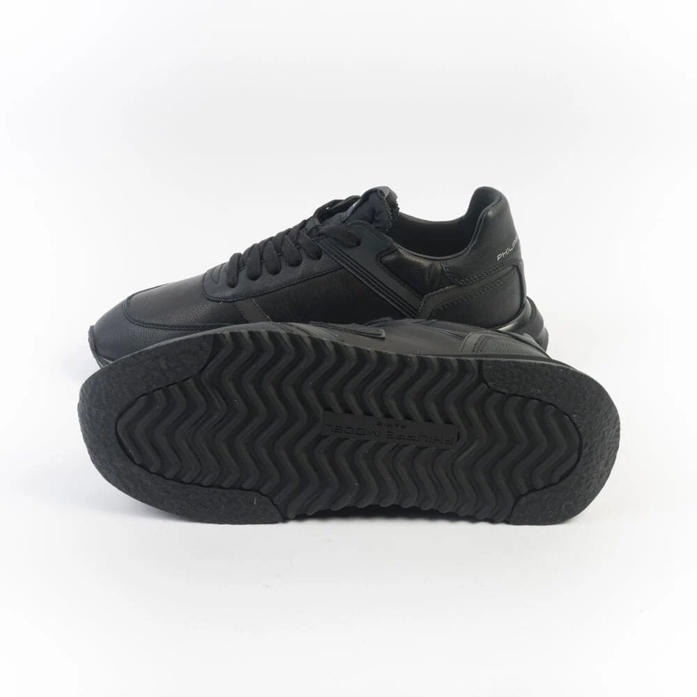 Sneakers Tropez 2.1 di Philippe Model, realizzate in pelle e materiale gommato di colore nero. Scudetto della Maison laterale in pelle in nuance. Linguetta in tessuto tecnico. Inserto posteriore in pelle di colore nero con logo in contrasto di colore argento. Lacci in cotone di colore nero. Maxi suola di altezza circa 3 centimetri.