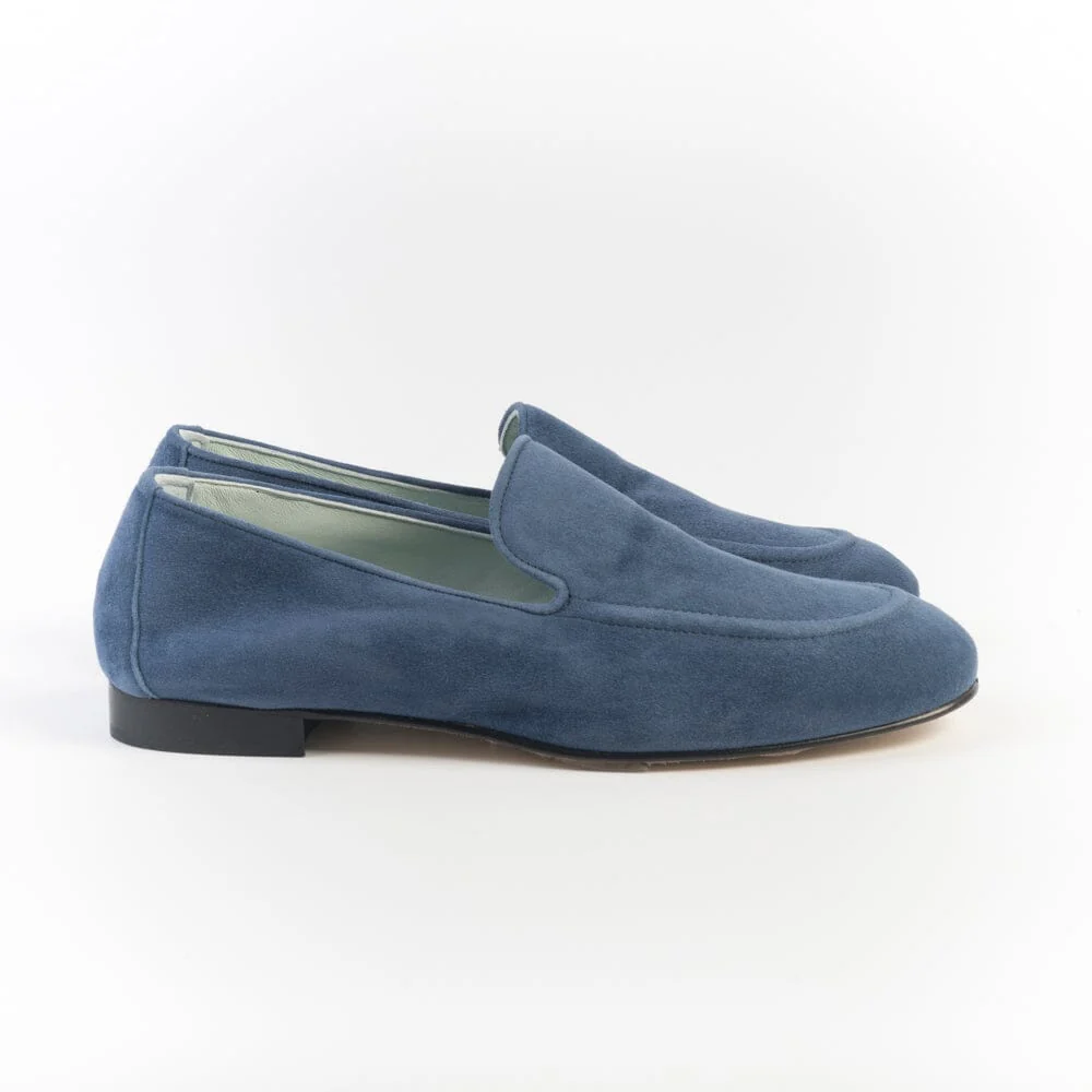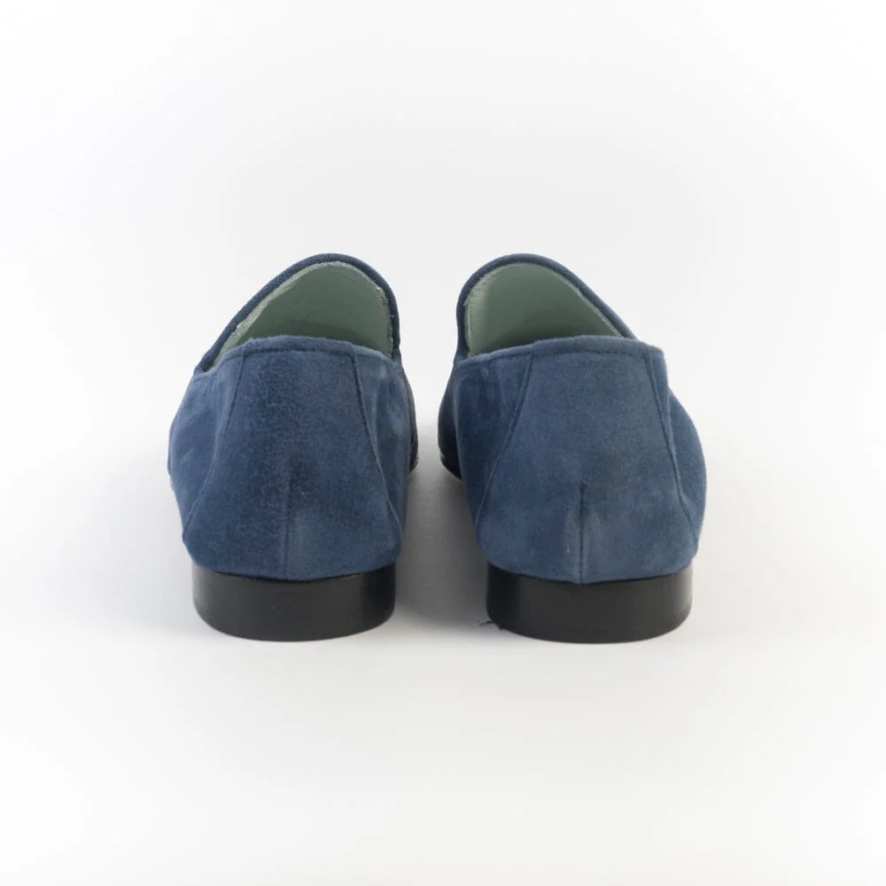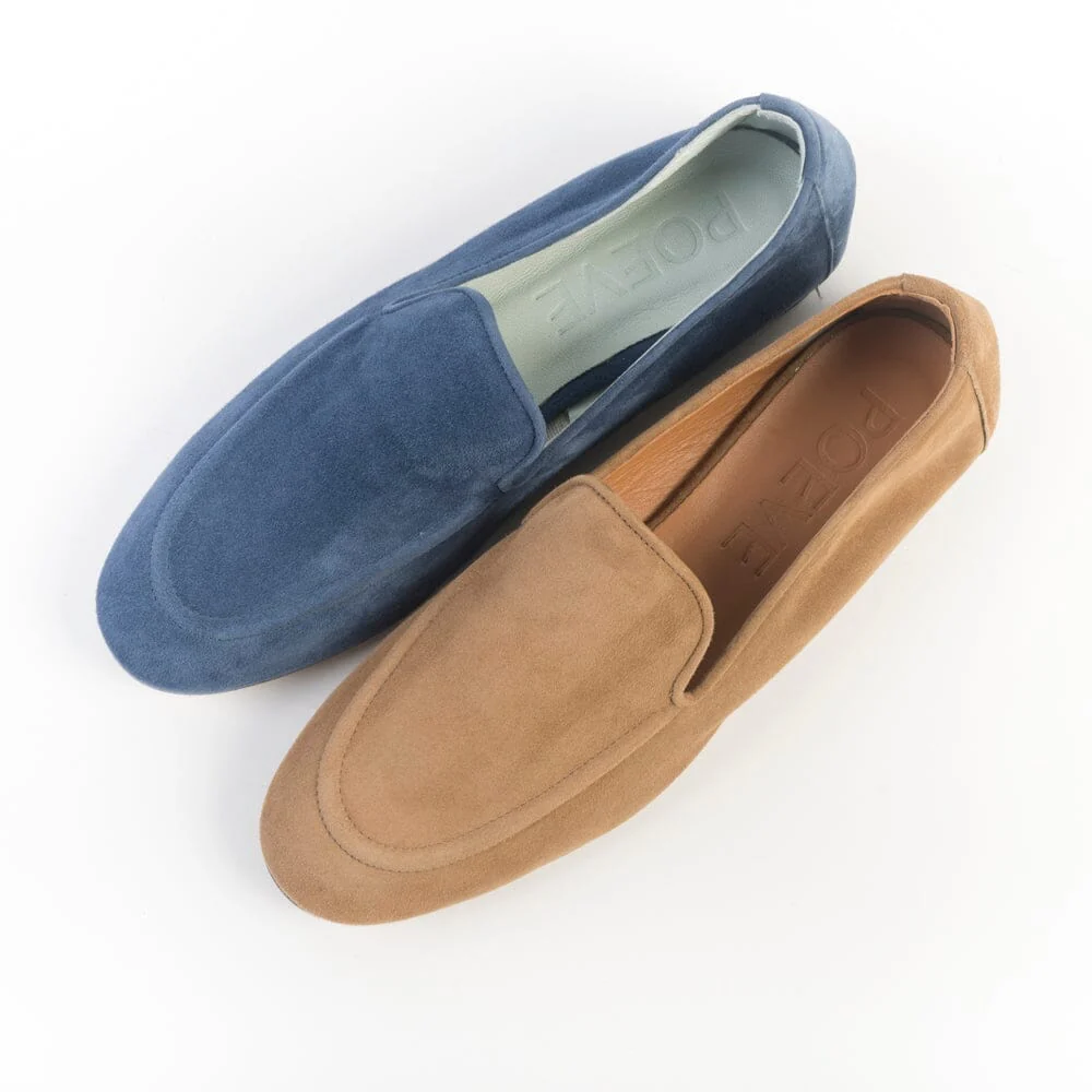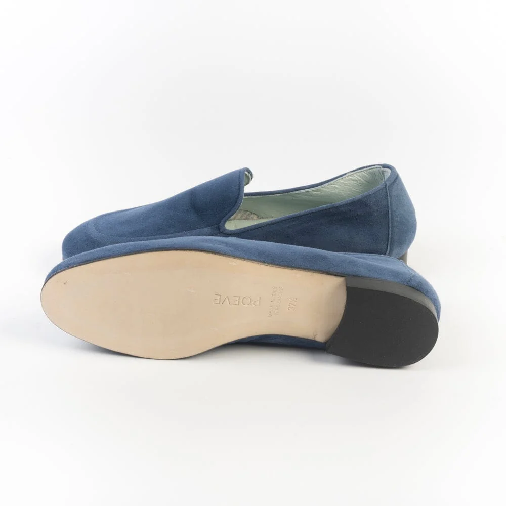 Mocassino di Poeve, realizzato in morbidissimo camoscio di colore blu. Piping in rilievo, in nuance. Interno foderato e sottopiede imbottito in pelle, suola in cuoio, tacco cuoio e gomma di 2 centimetri.