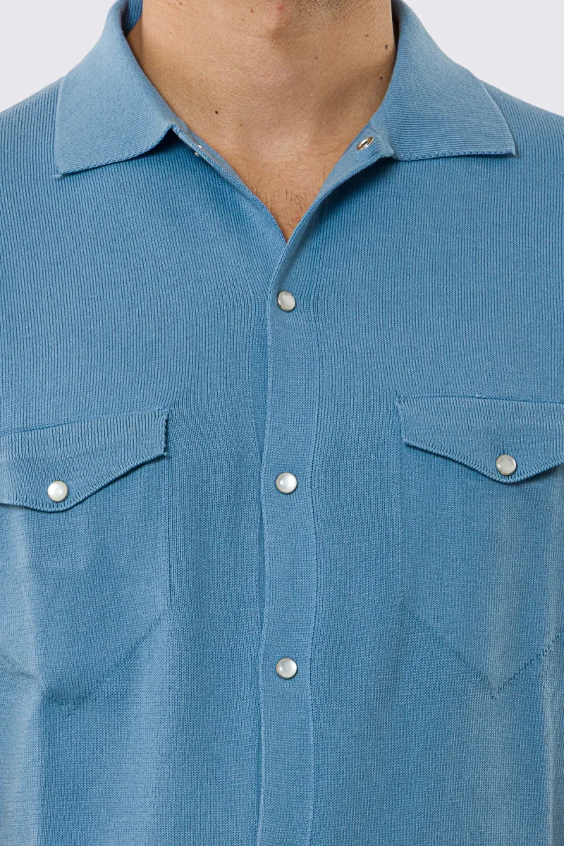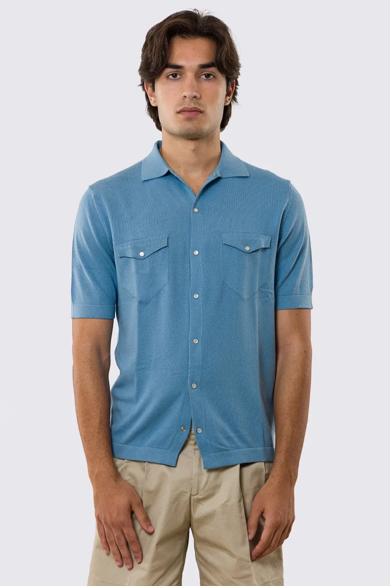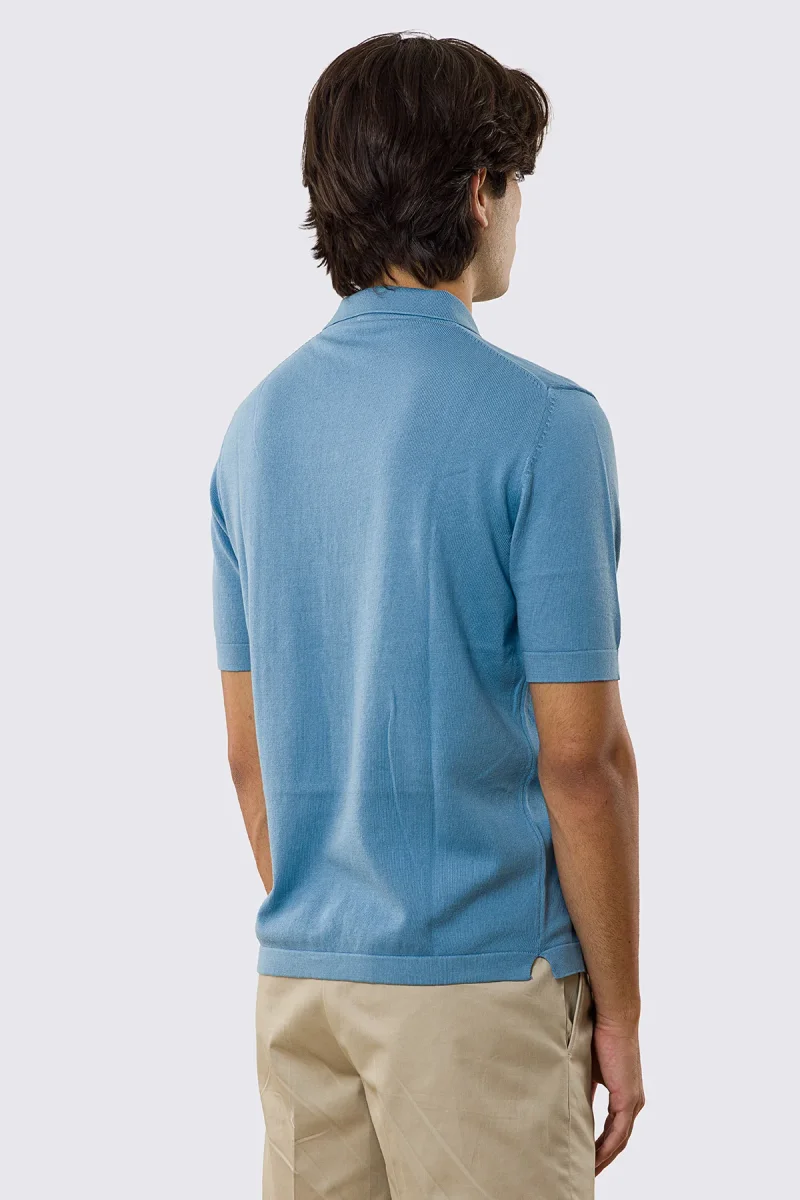 Polo mezze maniche azzurra modello con tasconi e bottoni clip in perla da uomo finezza 14 con elastici sulle maniche e sul fondo 100% cotone di filo tinta unita