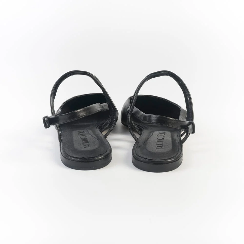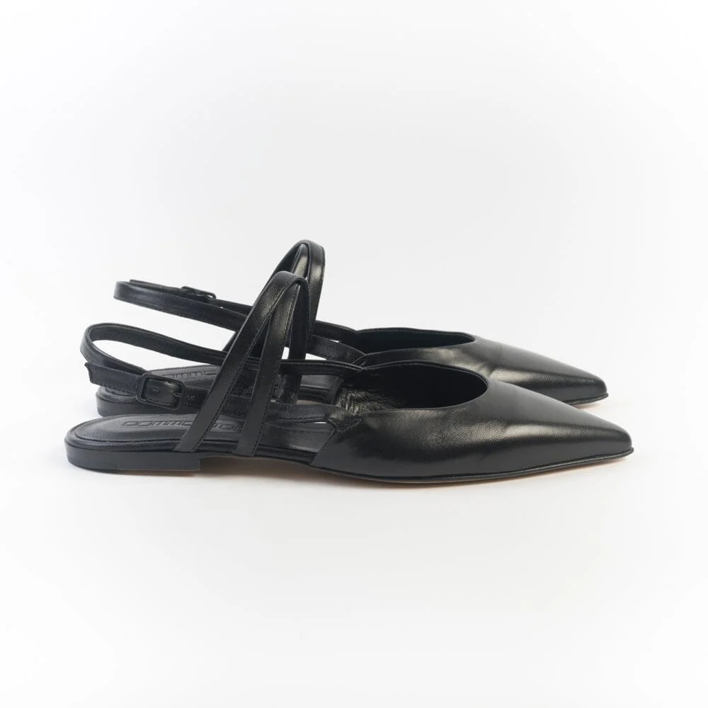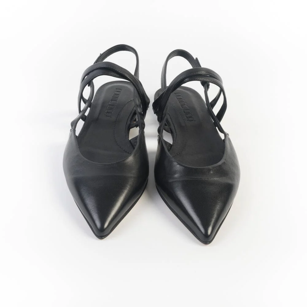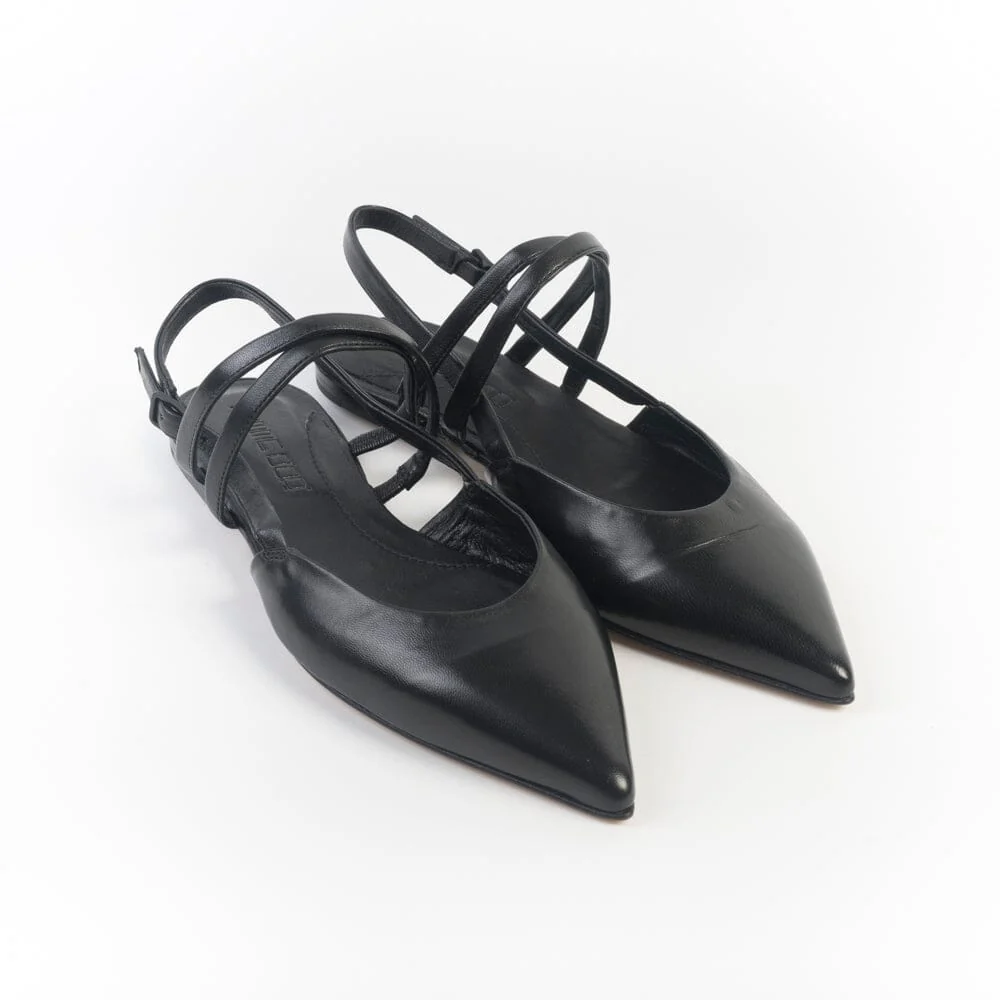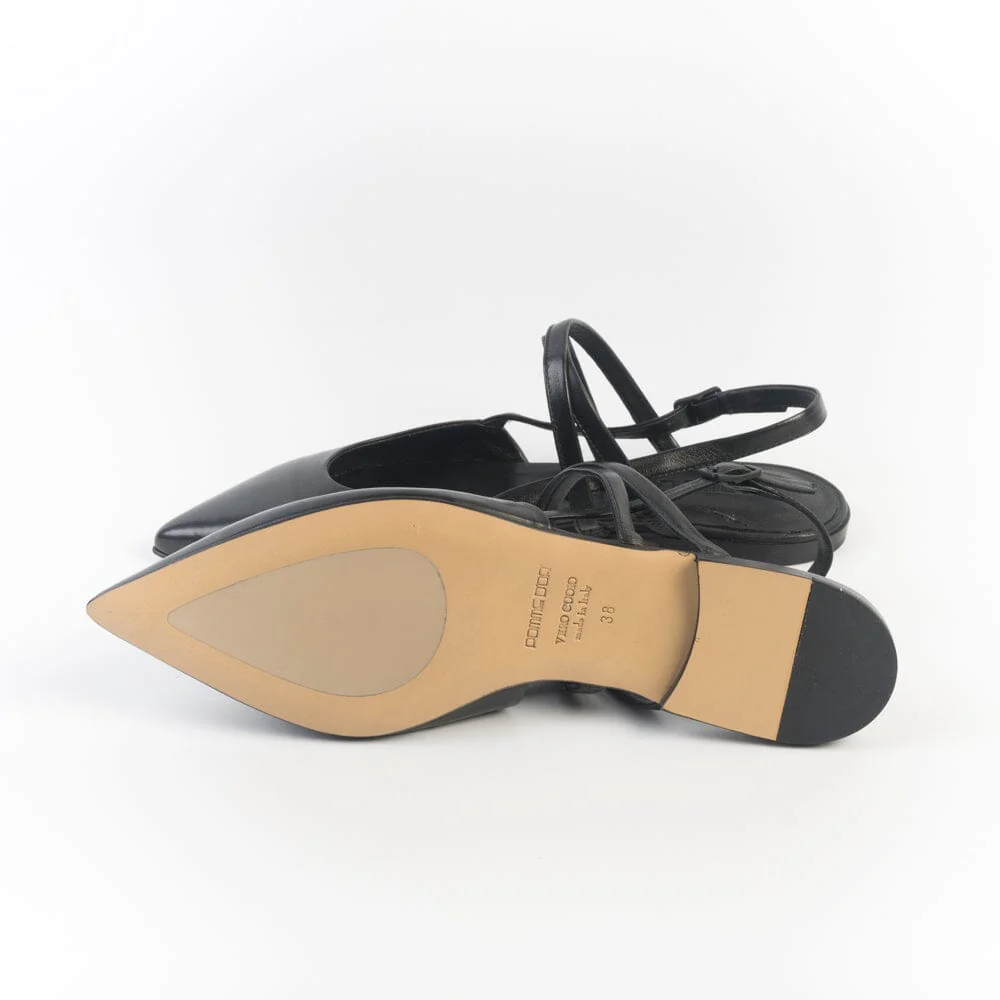 Sling back di Pomme D’Or, realizzate in morbidissima pelle di colore nero. Dotata di doppia fascia incrociata su collo del piede; chiusura con cinturino regolabile sul tallone. Punta affusolata, interno rivestito in pelle. Suola in cuoio con inserti in gomma.