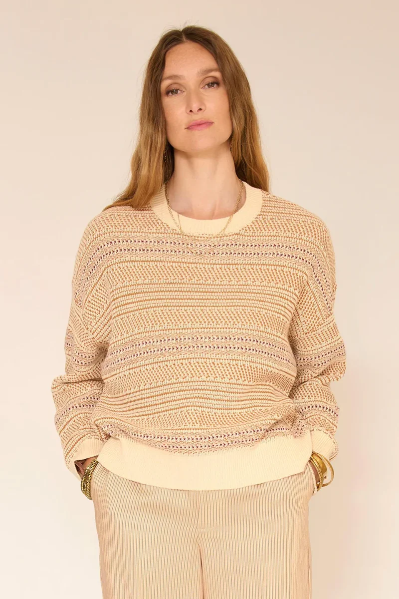 Il gioco di maglie porta rilievo pur rimanendo morbido e luminoso. Questo maglione punta su un taglio comodo, leggermente ampio, con una caduta morbida che si indossa naturalmente tutti i giorni. Facile da abbinare a pantaloni fluidi o denim, si inserisce in un guardaroba accogliente ed elegante, pensato per le transizioni di stagione.