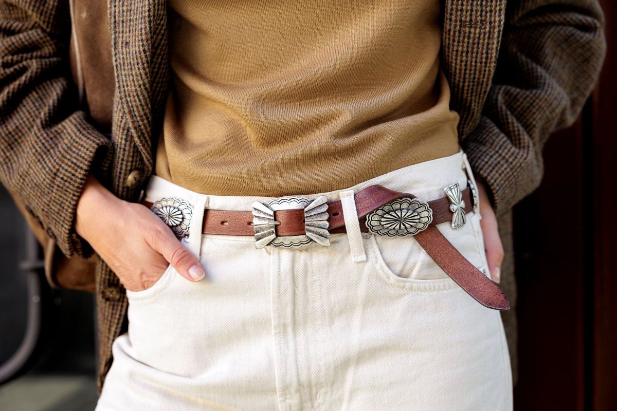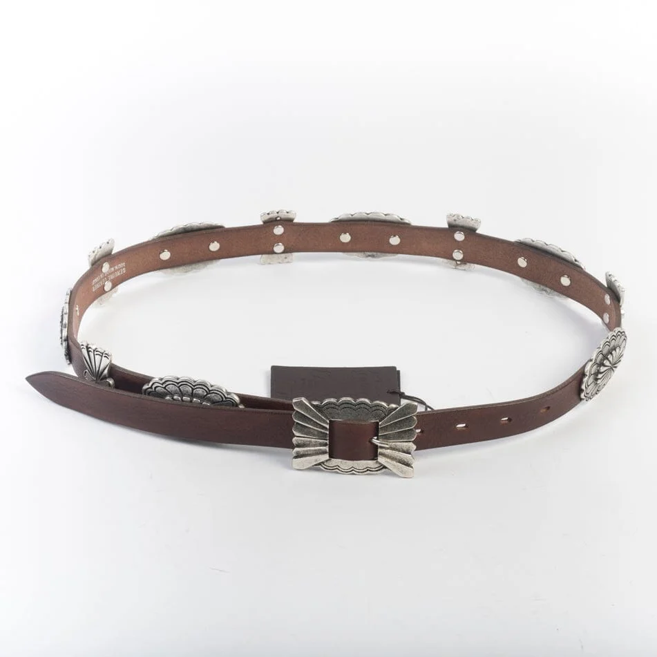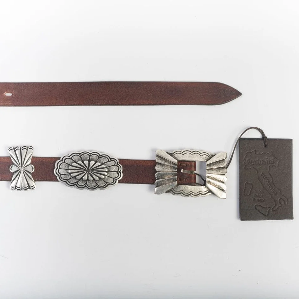 Cintura donna di PuntoVita realizzata in pelle di colore testa di moro, con fibbia squadrata di colore brunito con intagli effetto vintage. Decorazioni in metallo di varie forme.