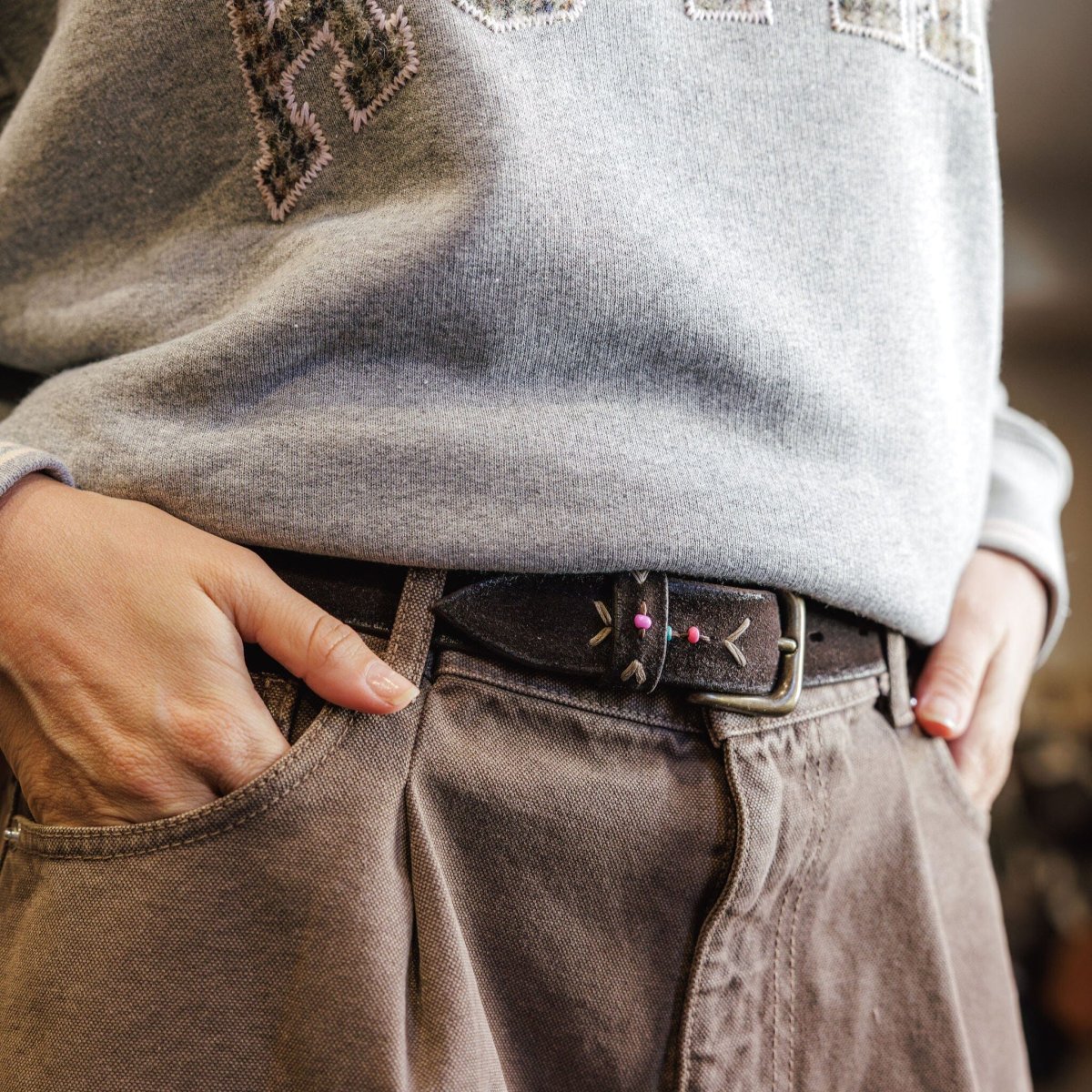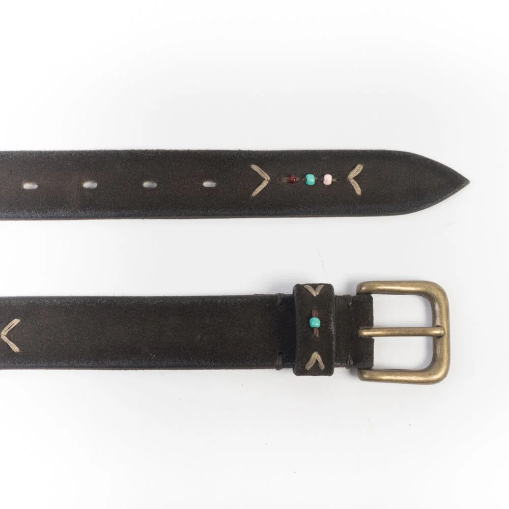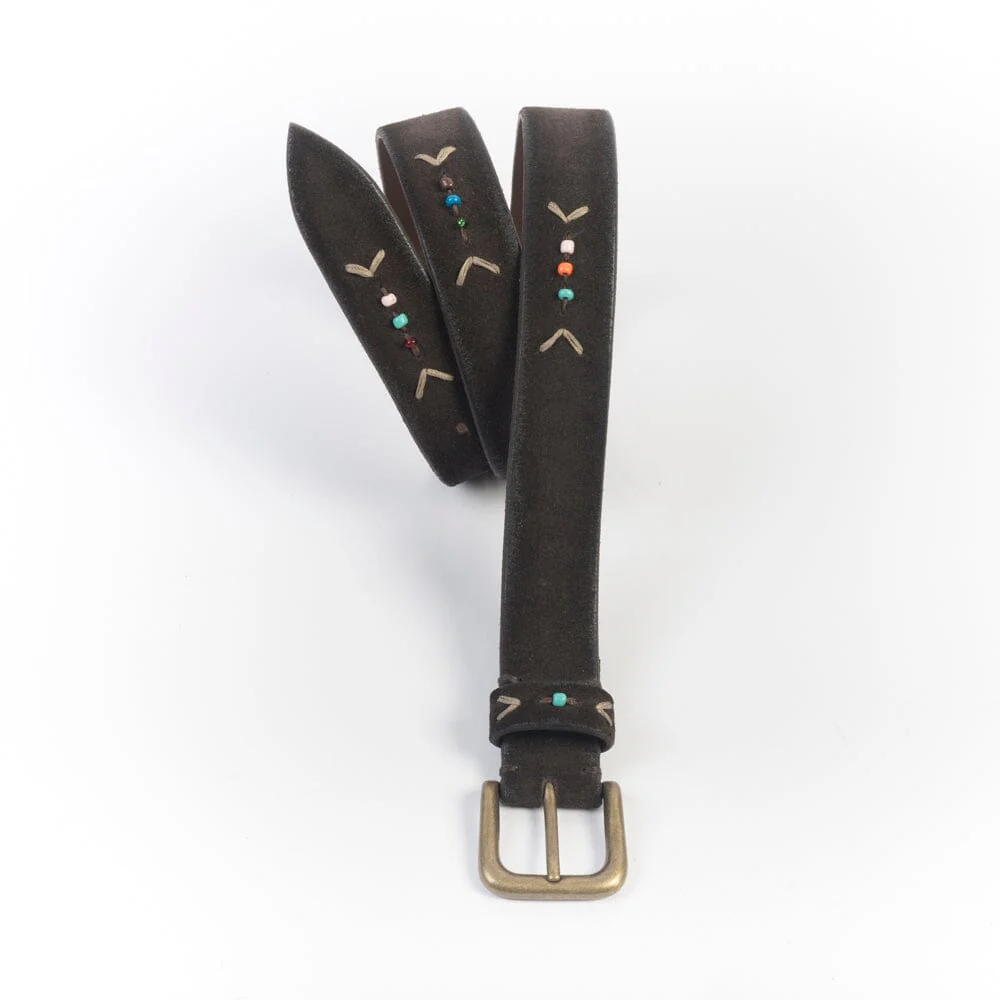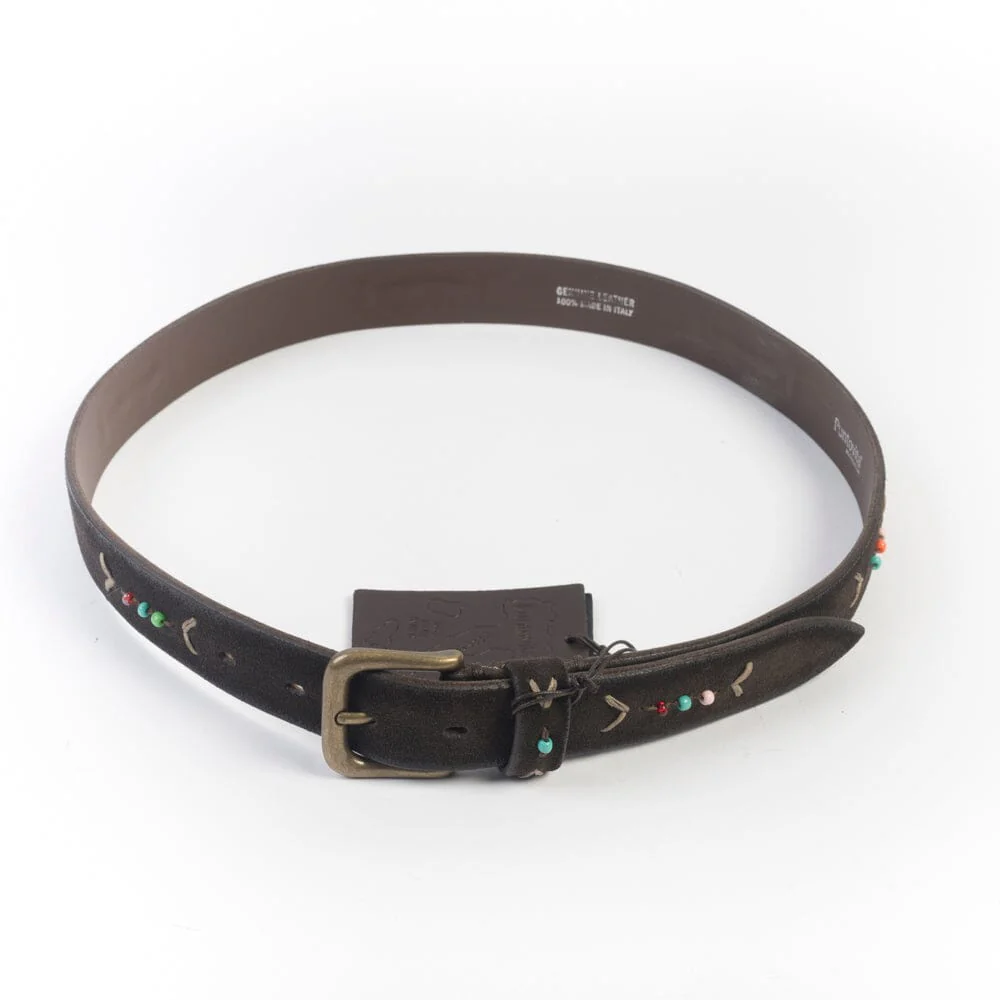 Cintura donna di PuntoVita realizzata in pelle scamosciata di colore testa di moro, con fibbia squadrata di colore brunito . Decorazioni con perline colorate e ricami cuciti a mano. Altezza 3 cm.