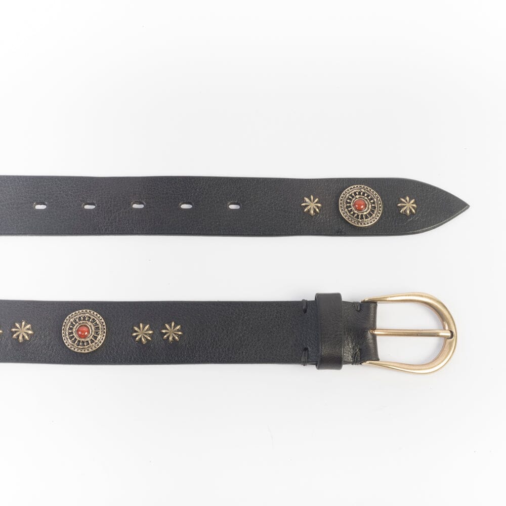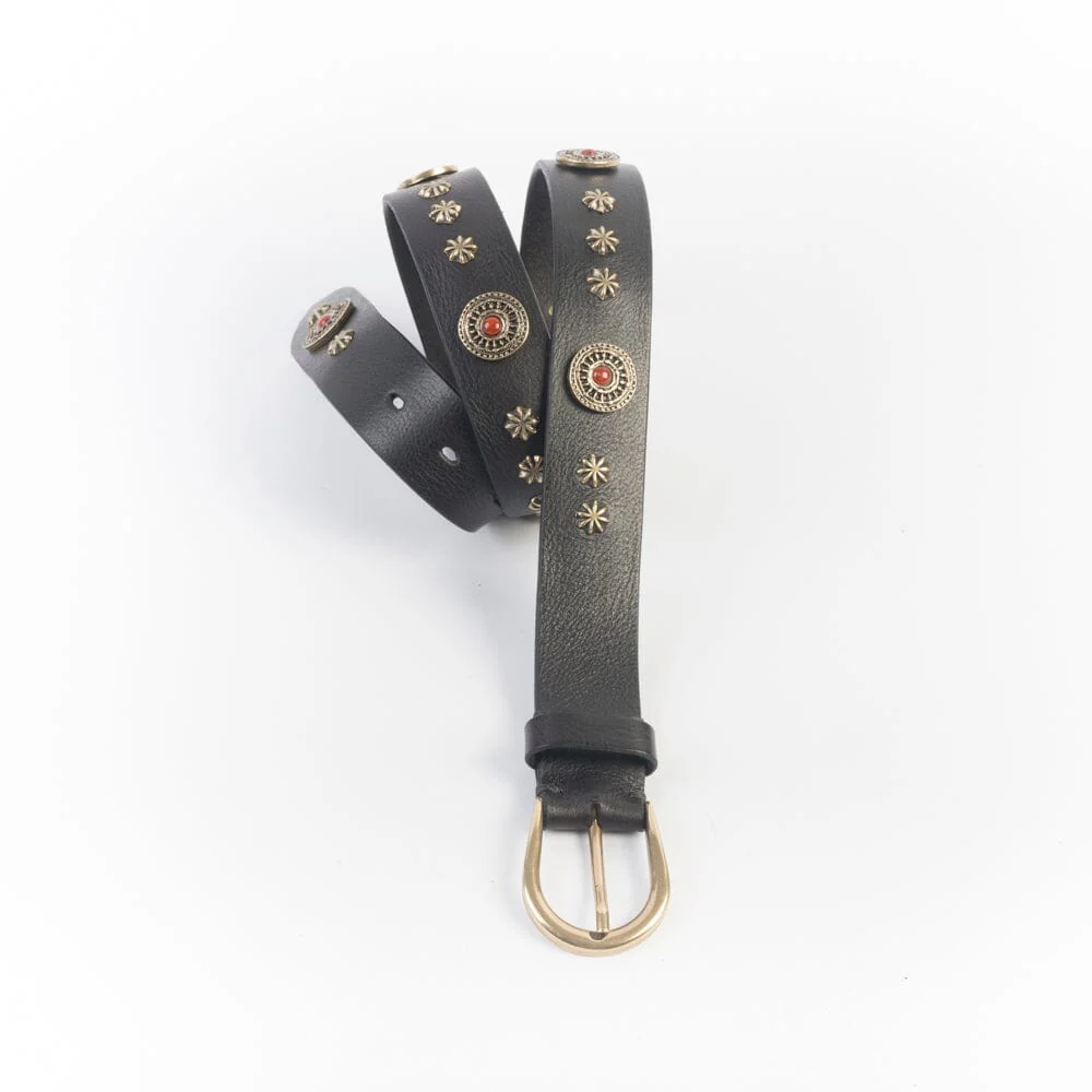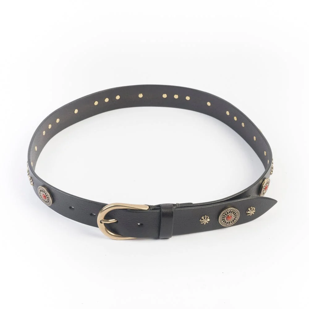 Cintura donna di PuntoVita realizzata in pelle di colore testa di moro , con fibbia di colore bronzo opaco. Decorazioni in metallo bronzo con applicazione di perline perline di colore rosso. Altezza 3 cm.