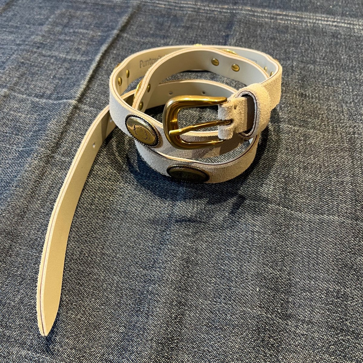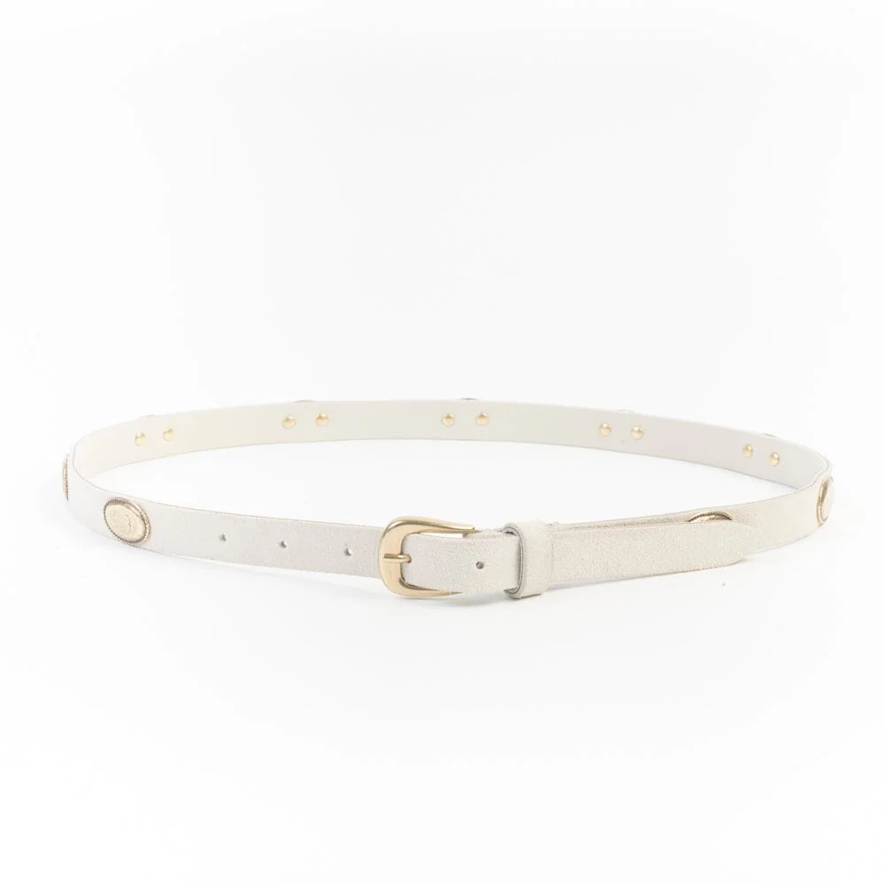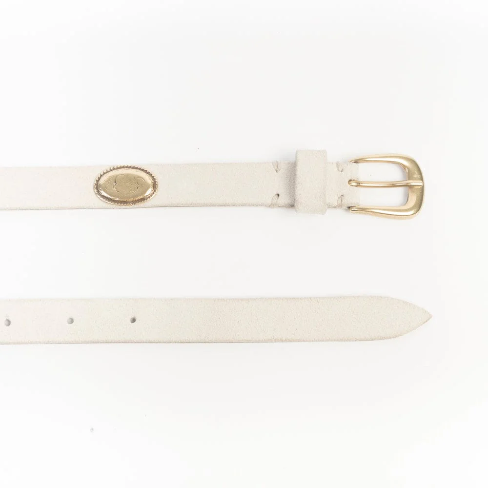 Cintura donna di PuntoVita realizzata in pelle scamosciata di colore avorio, con fibbia squadrata di colore oro brunito effetto vintage. Applicazioni in metallo a forma ovale in nuance. Altezza 2 cm.
