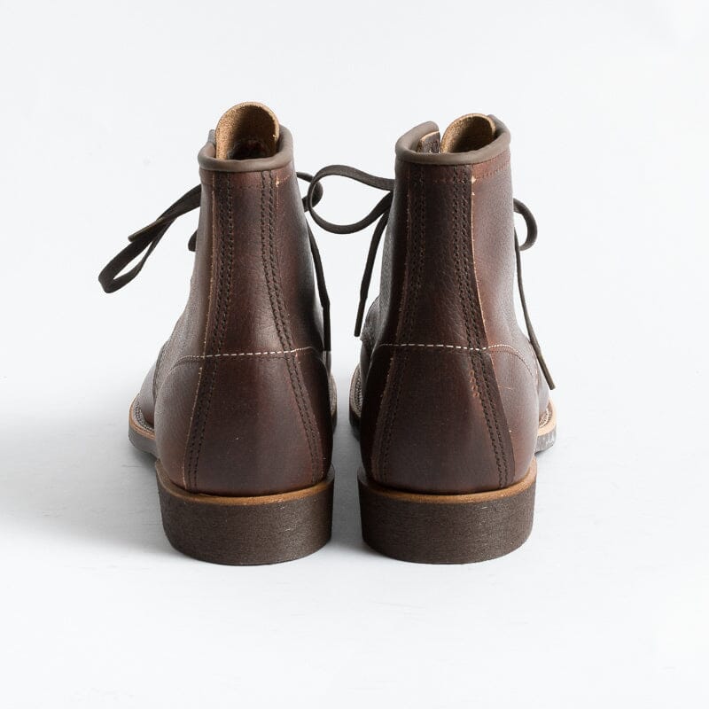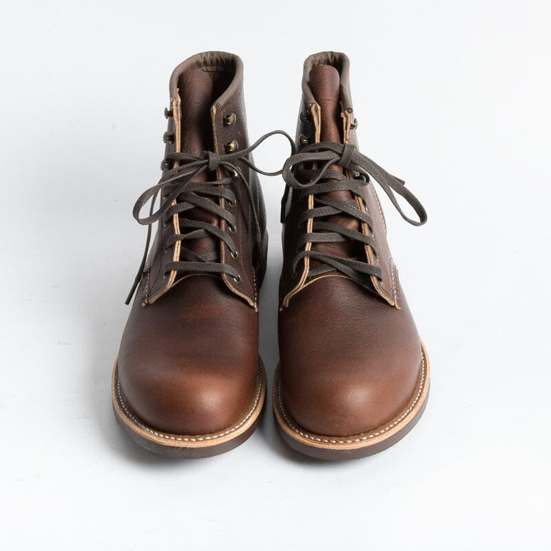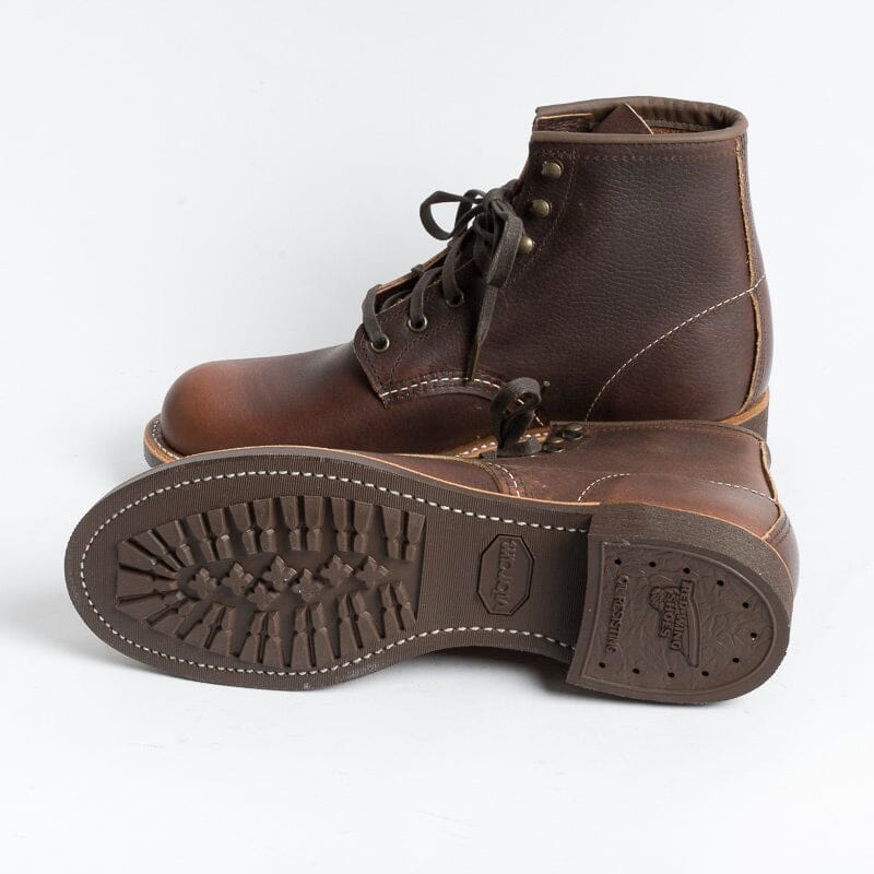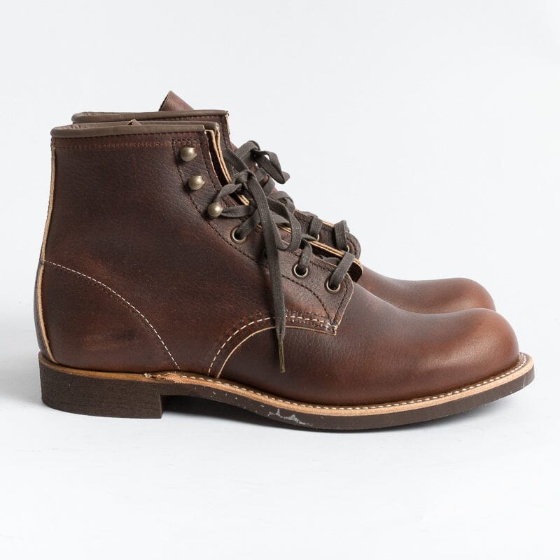 Stivaletto BlackSmith di Red Wing Shoes realizzato in robusta pelle di colore marrone ambrato. Lavorazione Goodyear, sottopiede in pelle, occhielli e ganci in nichel, la suola è in Vibram® di colore marrone scuro, lacci in cotone.