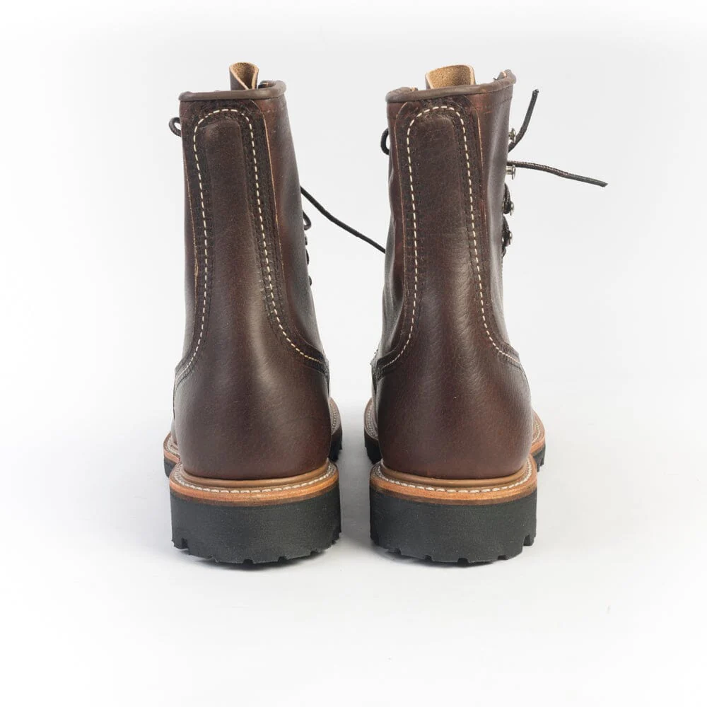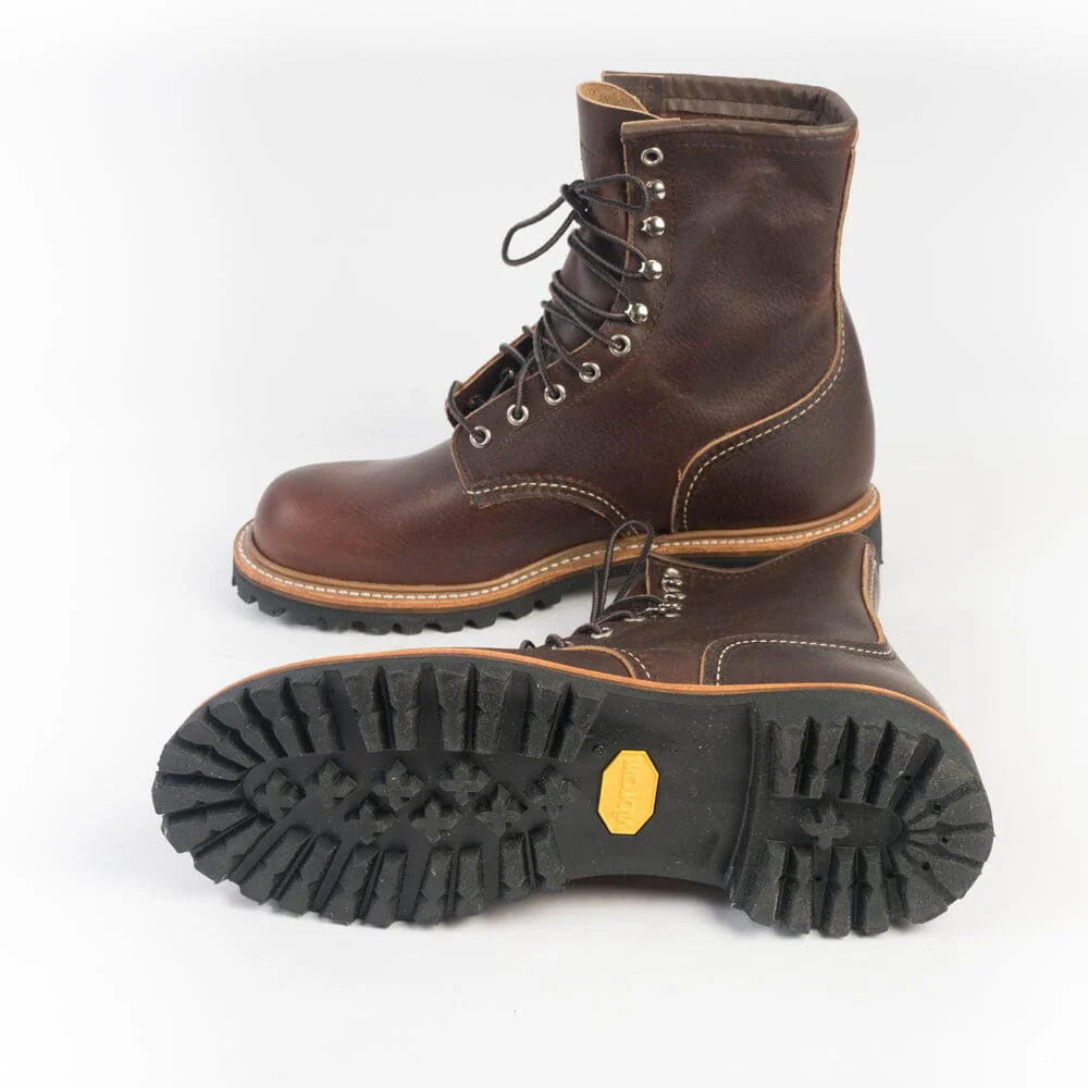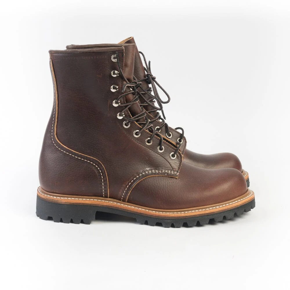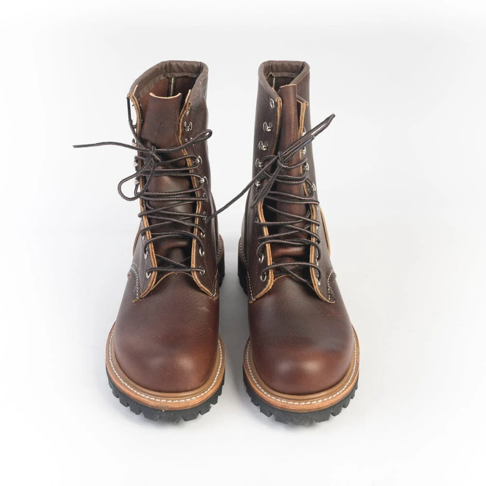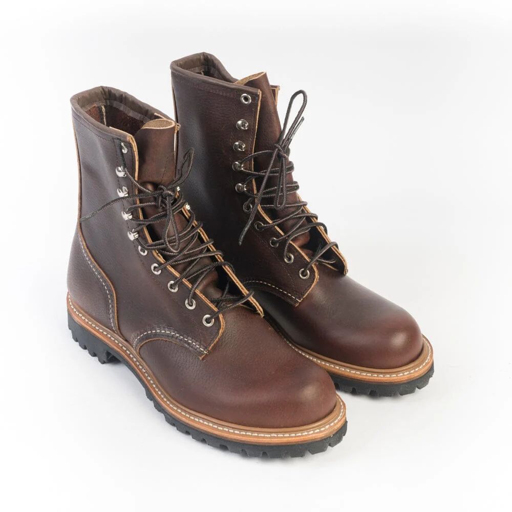 Stivaletto Anfibio modello di Red Wing realizzato in pelle di vitello naturale di colore testa di moro con dettagli effetto anticato. Questo modello risale agli anni ’30 ed era popolare nei campi di raccolta e nell’industria mineraria. Lacci in cotone melange con sei occhielli e quattro ganci in nichel. Lavorazione Goodyear, sottopiede in pelle. Suola in gomma Vibram antiscivolo.