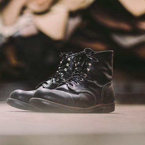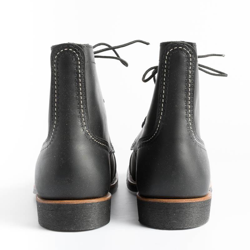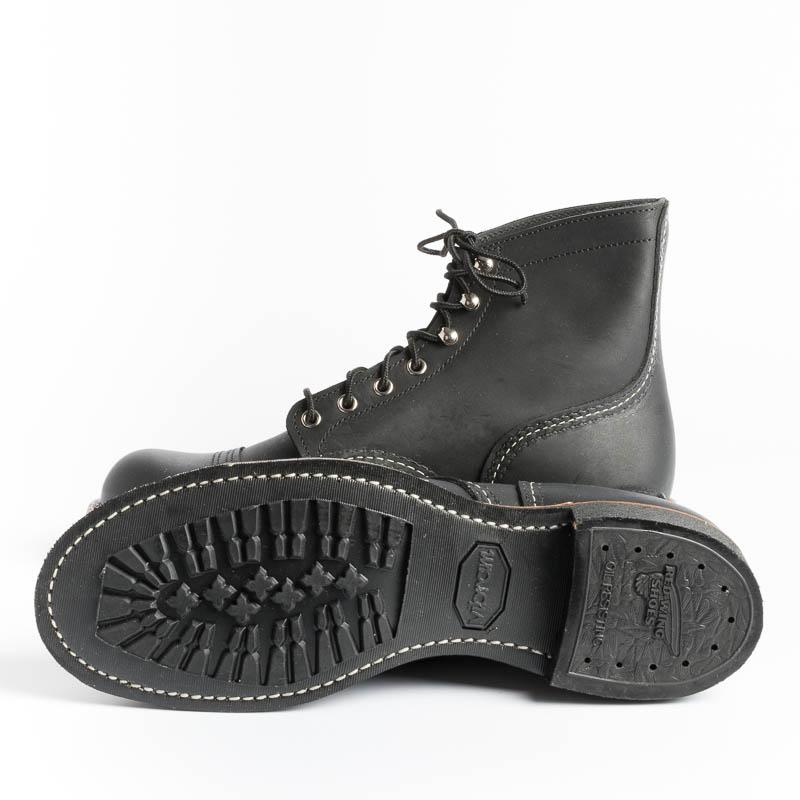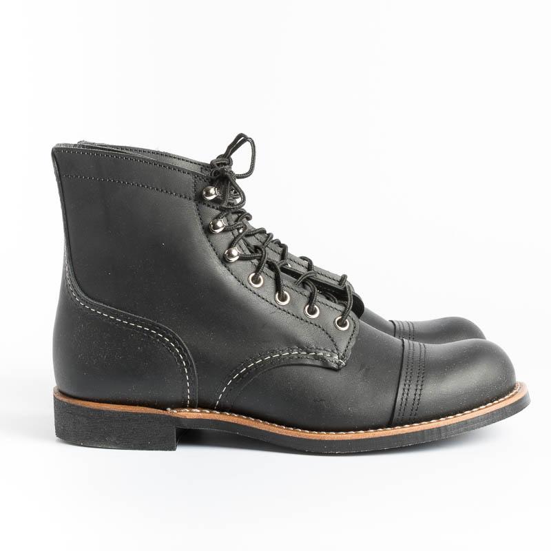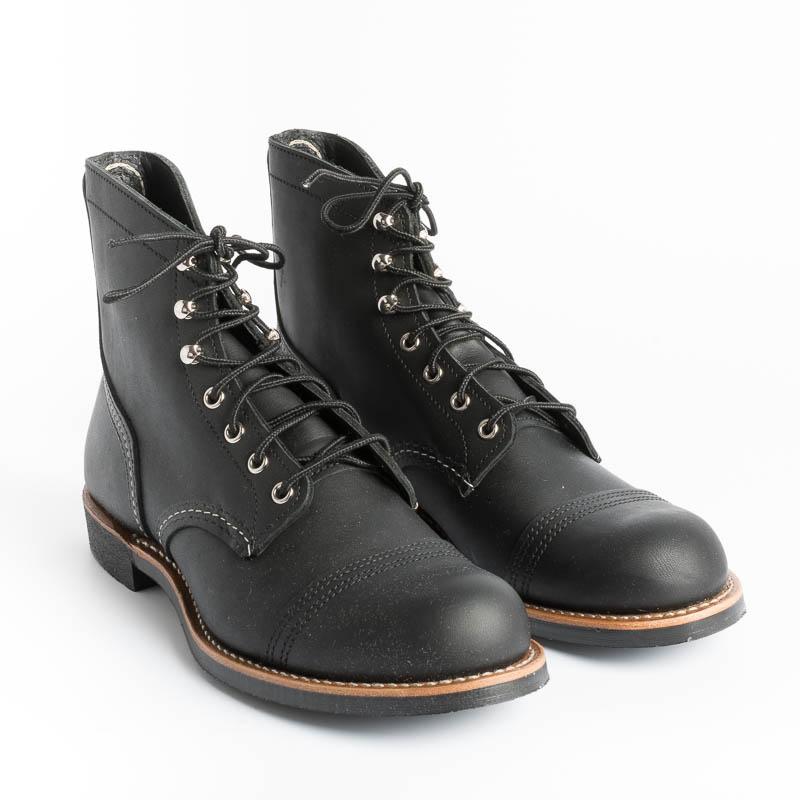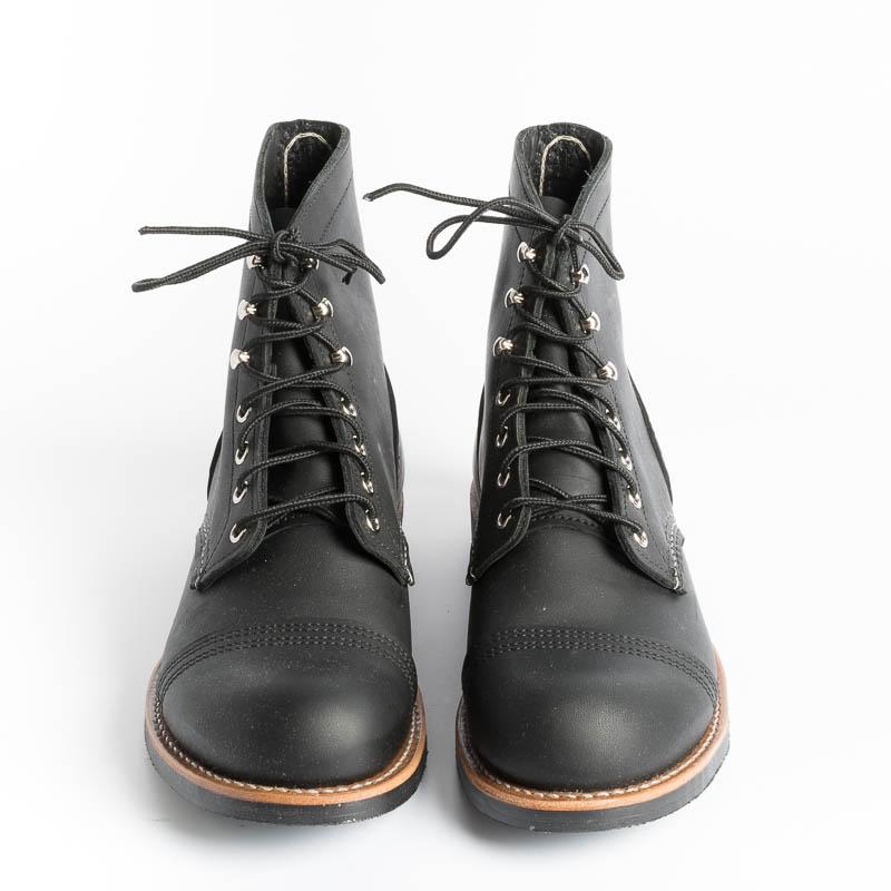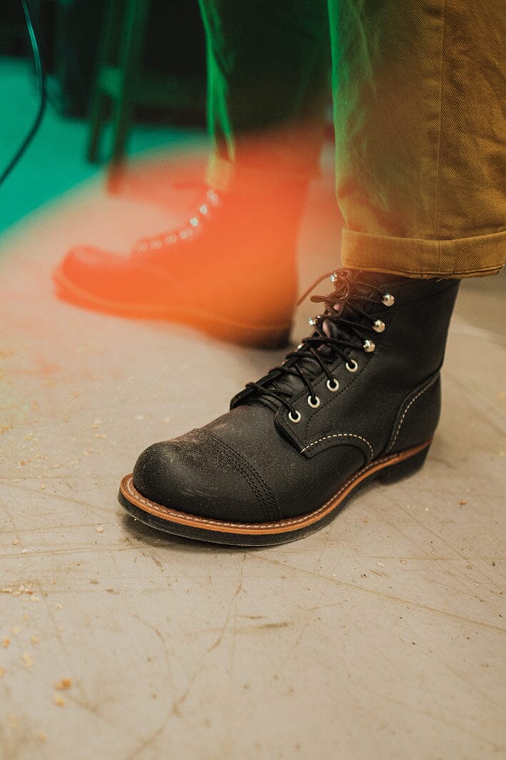 Lo stivaletto Iron Ranger di Red Wing è realizzato in robusta pelle Hawthorne Muleskinner premium, di colore nero. Lavorazione Goodyear, sottopiede in pelle, occhielli e ganci in nichel, la suola è in Vibram® 430 Mini-lug di colore marrone scuro, lacci in cotone.