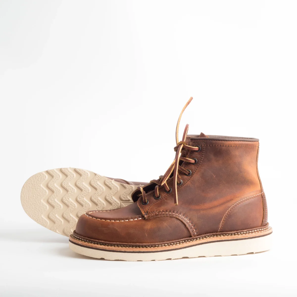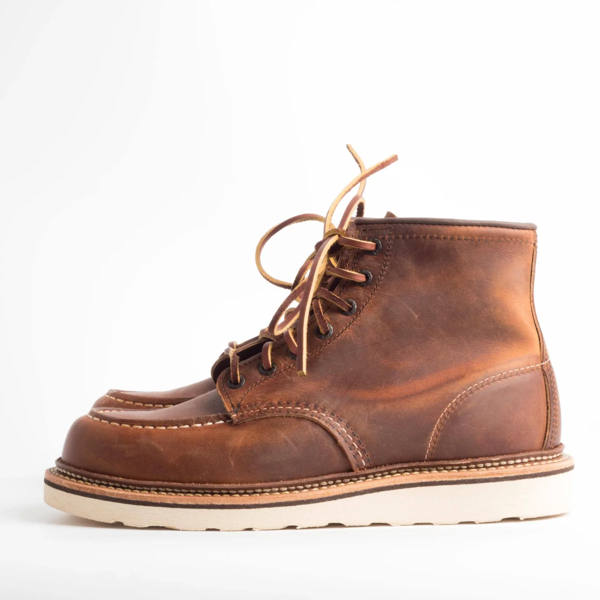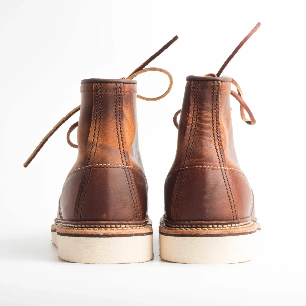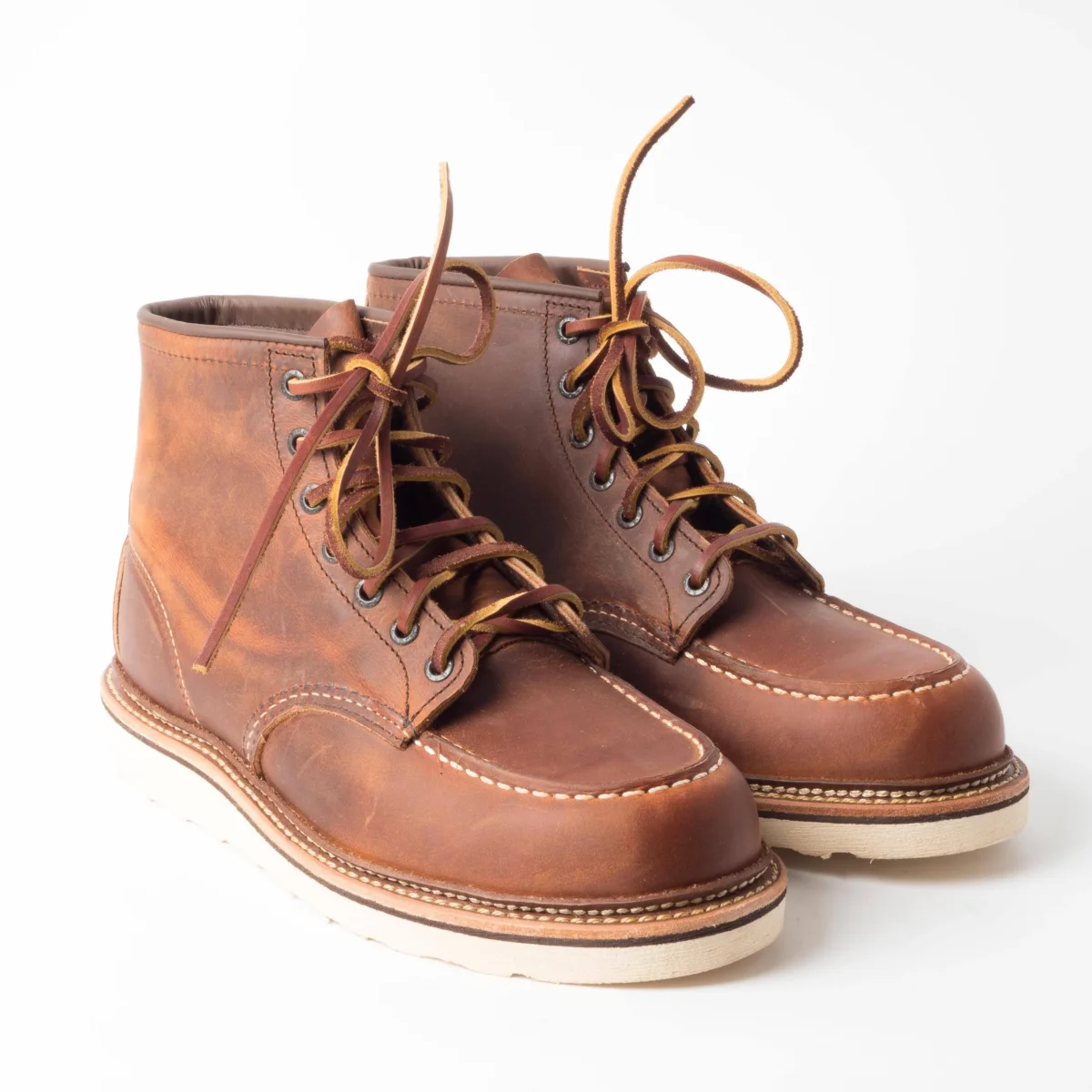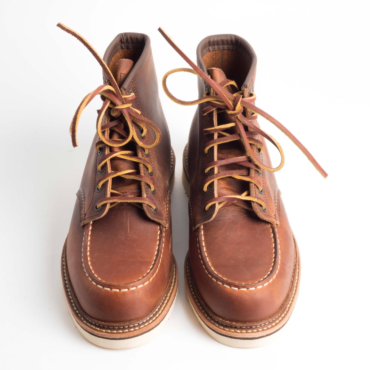 Iconico Moc Toe 6″ di Red Wing Shoes, 7 fori, realizzato in pelle conciata con olio resistente all’acqua di colore cuoio scuro. Lavorazione Goodyear, sottopiede in pelle, occhielli in metallo, la suola è in gomma bianca. La calzatura può essere allacciata con iconici lacci in pelle o in cotone colore marrone. Soletta memory interna in dotazione.