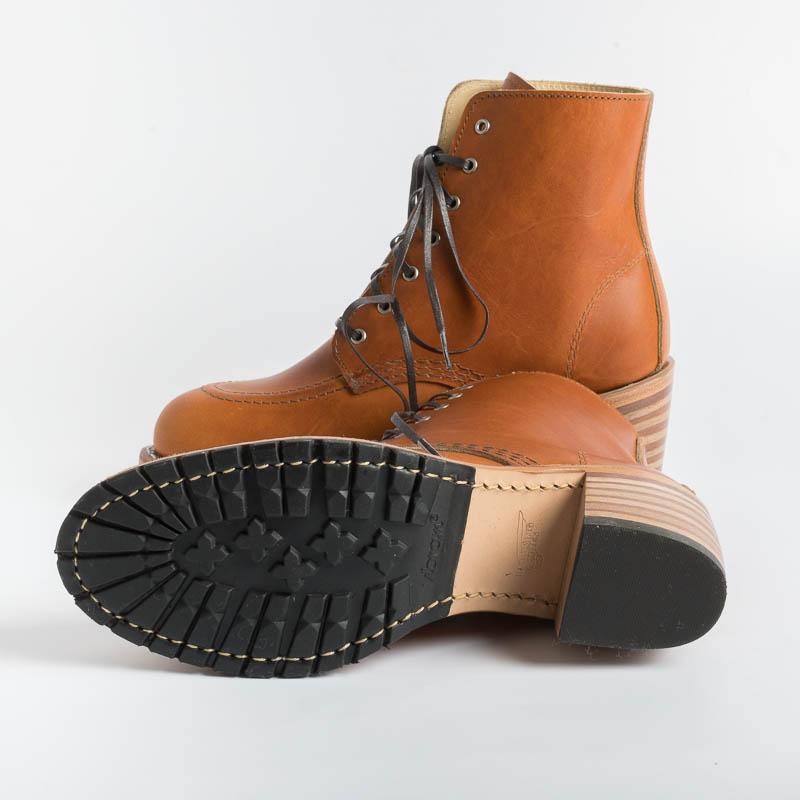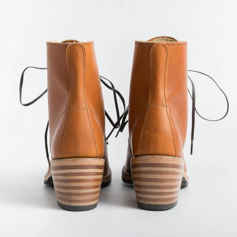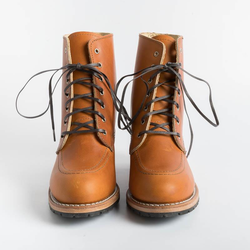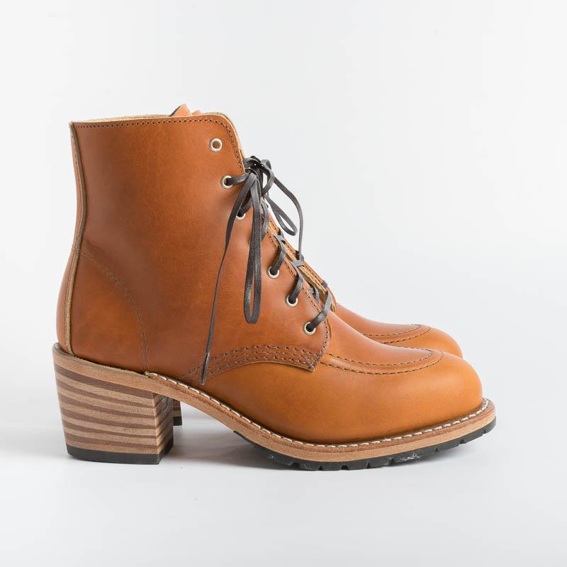 Stivaletto Clara 3404 di Red Wing realizzato in un vacchetta di color cuoio, con tacco in legno di circa cm 6 e suola cuoio e Vibram combina comfort e resistenza. Costruzione tradizionale del guardolo Goodyear, sottopiede in Texon® , occhielli in nichel, lacci in cotone piatti di color mogano.