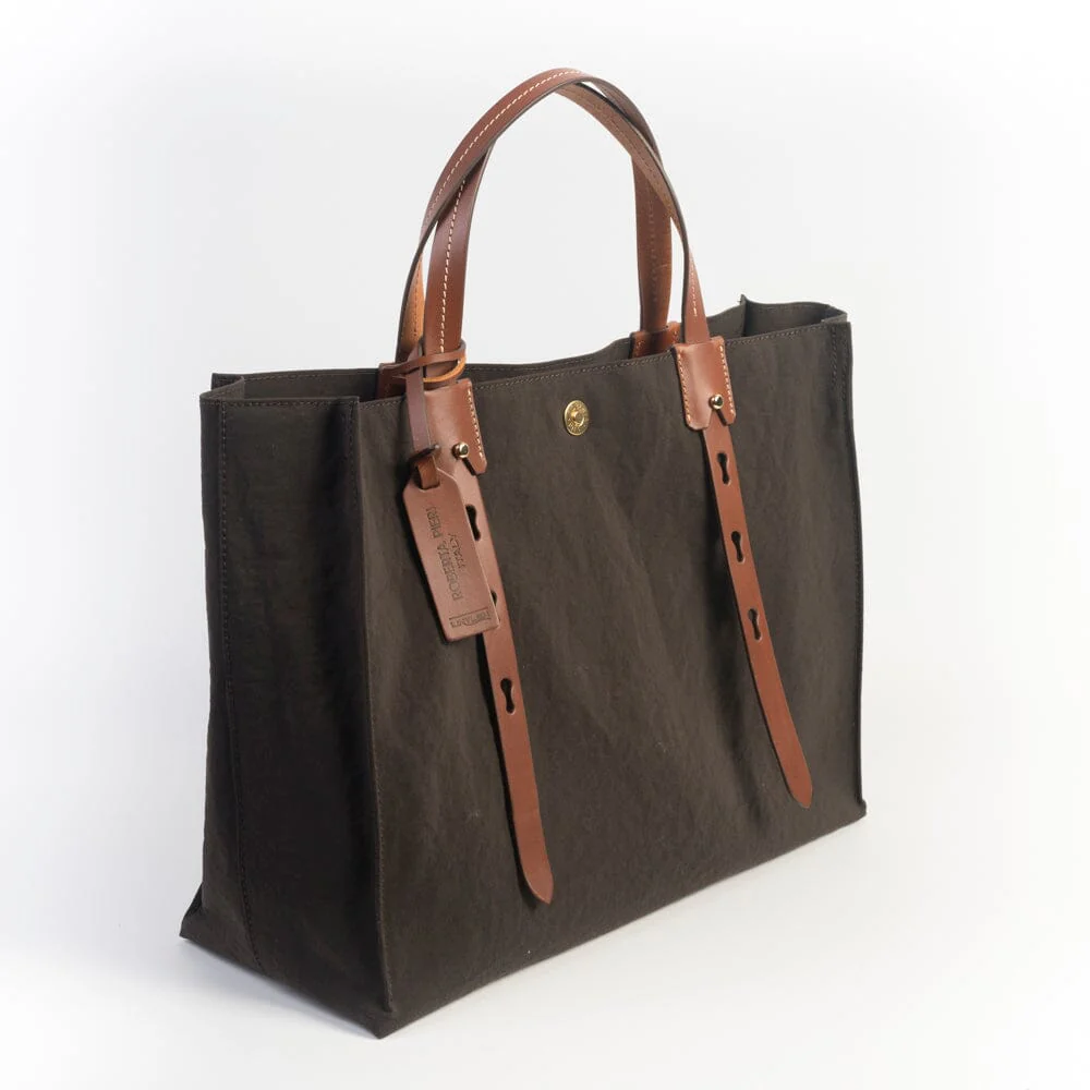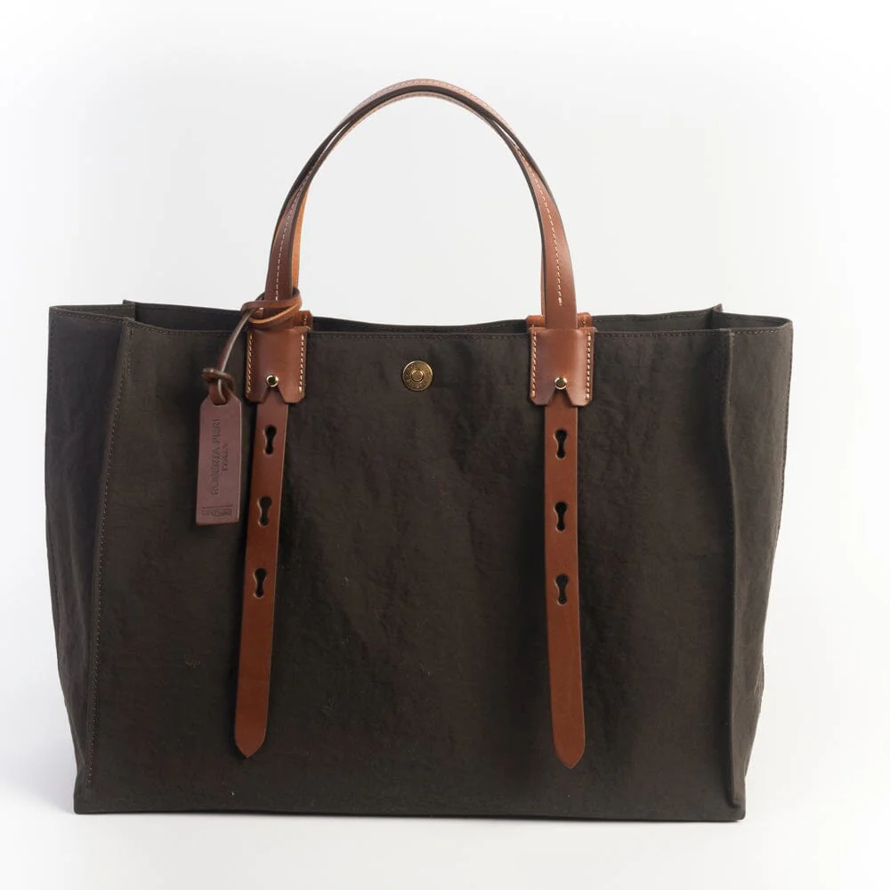 Borsa Edge Tote di Roberta Pieri realizzata in tessuto nylon leggero e resistente di colore testa di moro. Chiusura con cerniera e bottone. Manici regolabili in pelle di colore cuoio per consentire di usare la borsa a mano e a spalla. Interno organizzato con tre tasche aperte e una chiusa da cerniera.
