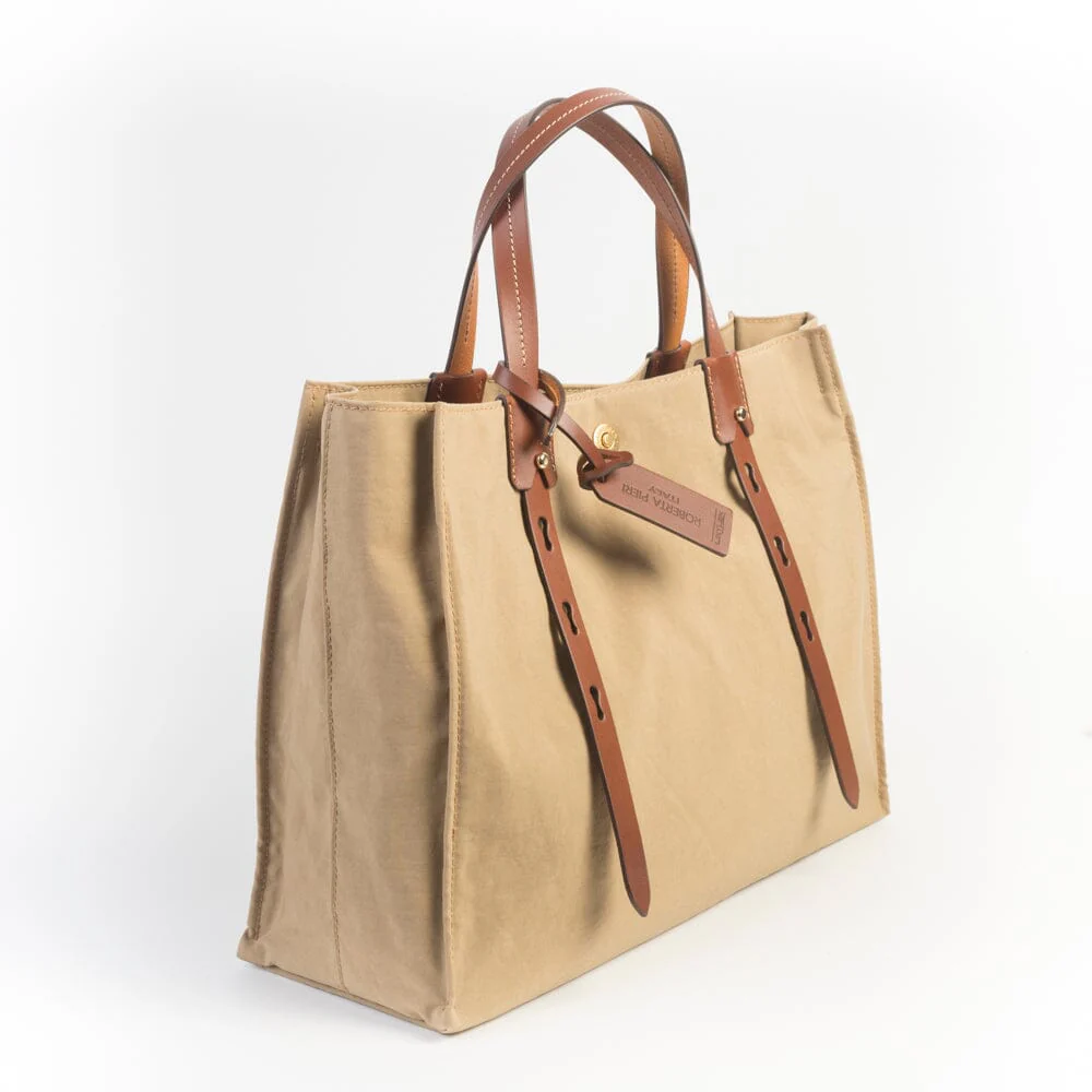 Borsa Edge Tote di Roberta Pieri realizzata in tessuto nylon leggero e resistente di colore beige. Chiusura con cerniera e bottone. Manici regolabili in pelle di colore cuoio per consentire di usare la borsa a mano e a spalla. Interno organizzato con tre tasche aperte e una chiusa da cerniera.
