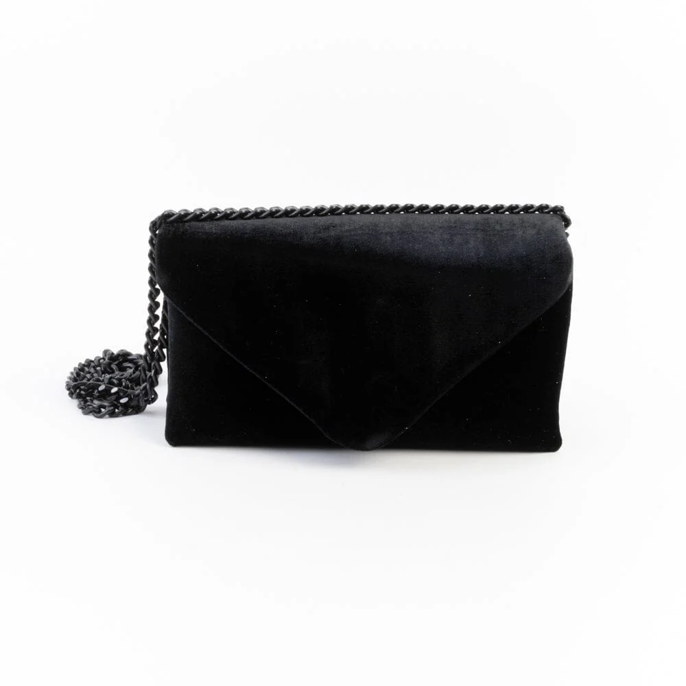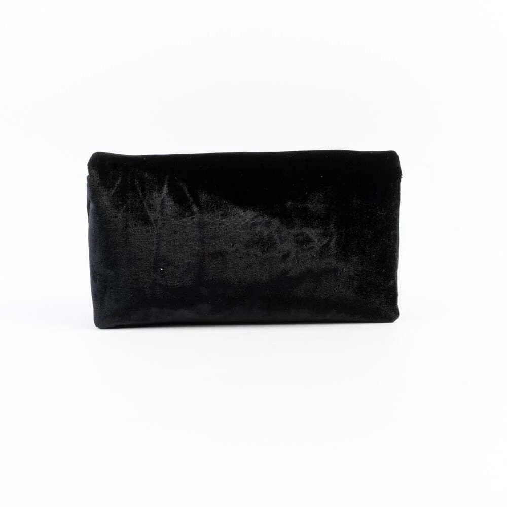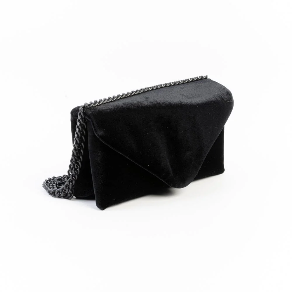 Pochette di Roberto Festa, realizzata in velluto di colore nero. Chiusura con patta; tracolla in metallo di colore nero. Interno foderato in tessuto, doppio scomparto.