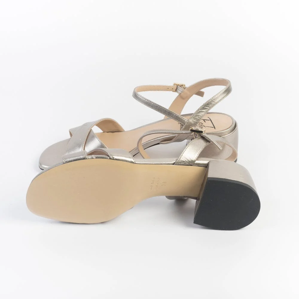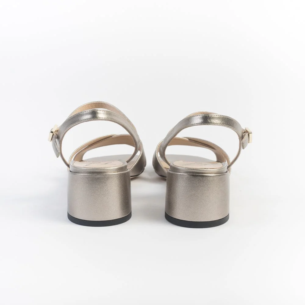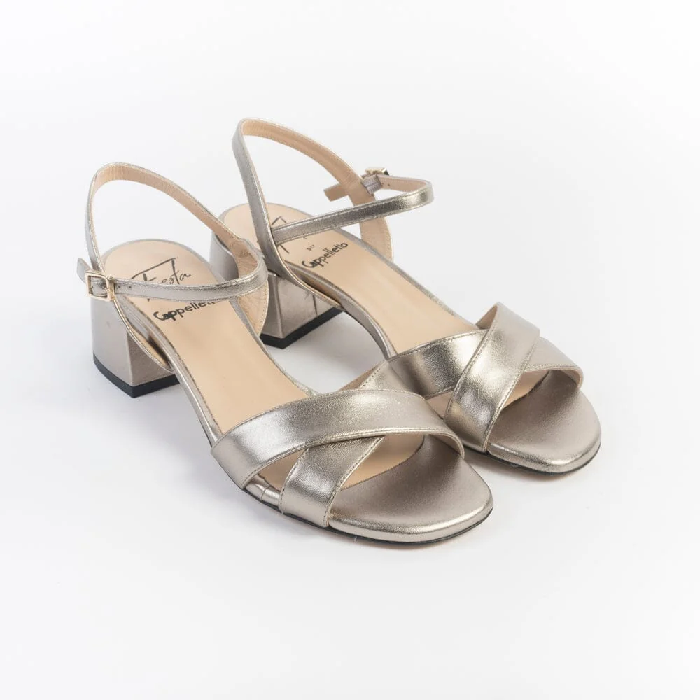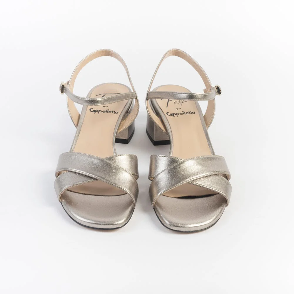 Sandali a fascia incrociata di Roberto Festa, realizzati in morbida nappa laminata di colore canna di fucile. Sottopiede in pelle. Cinturino di chiusura con fibbia regolabile alla caviglia. Tacco colonna, rivestito in pelle, di altezza circa 5 cm. Suola in cuoio.