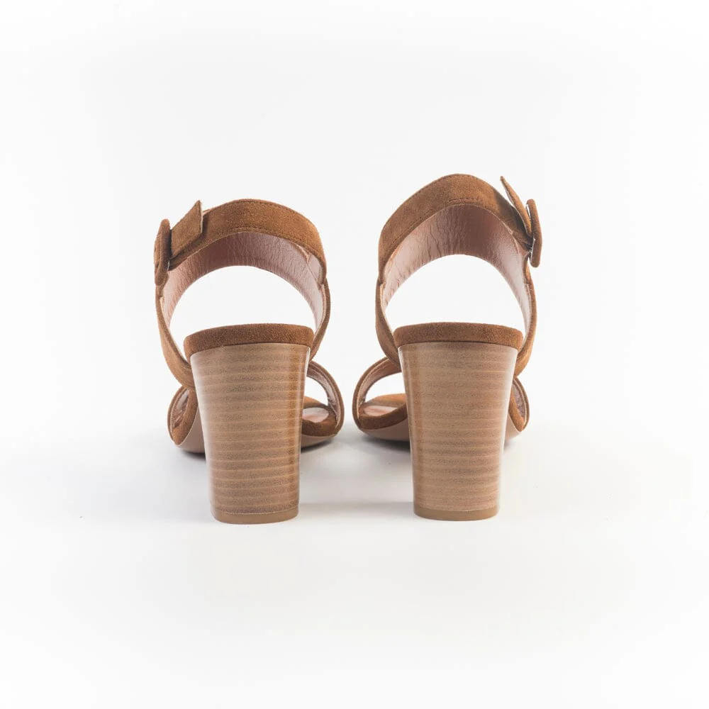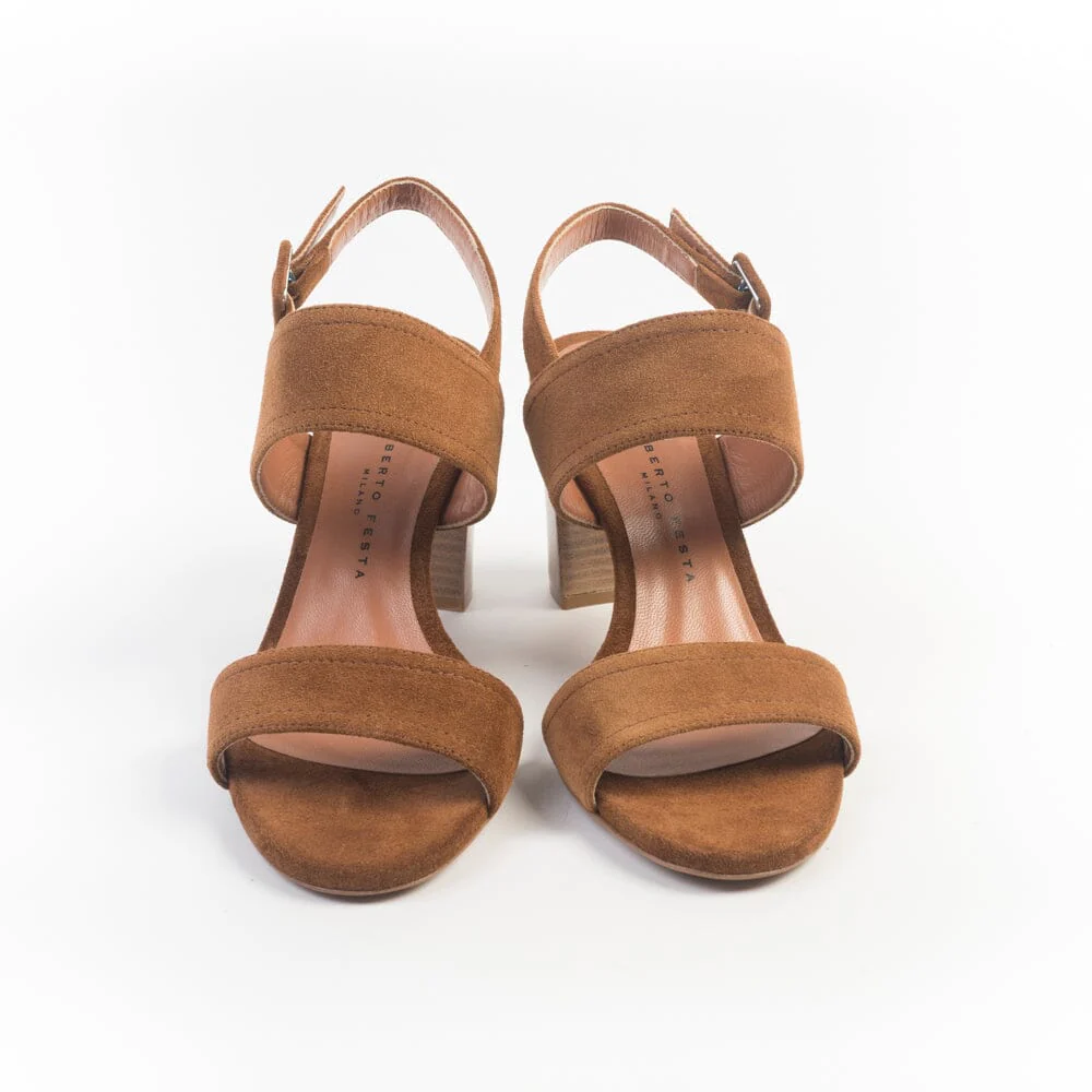 Sandalo a doppia fascia di Roberto Festa, realizzato in morbida pelle scamosciata di colore cannella. Sottopiede ed interno rivestiti in pelle. Chiusura con cinturino alla caviglia e fibbia in nuance in camoscio. Tacco in legno di altezza circa 8 cm. Suola in cuoio..