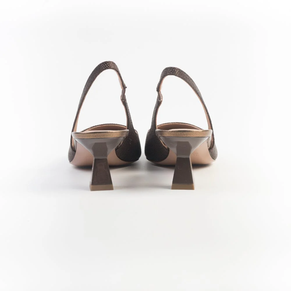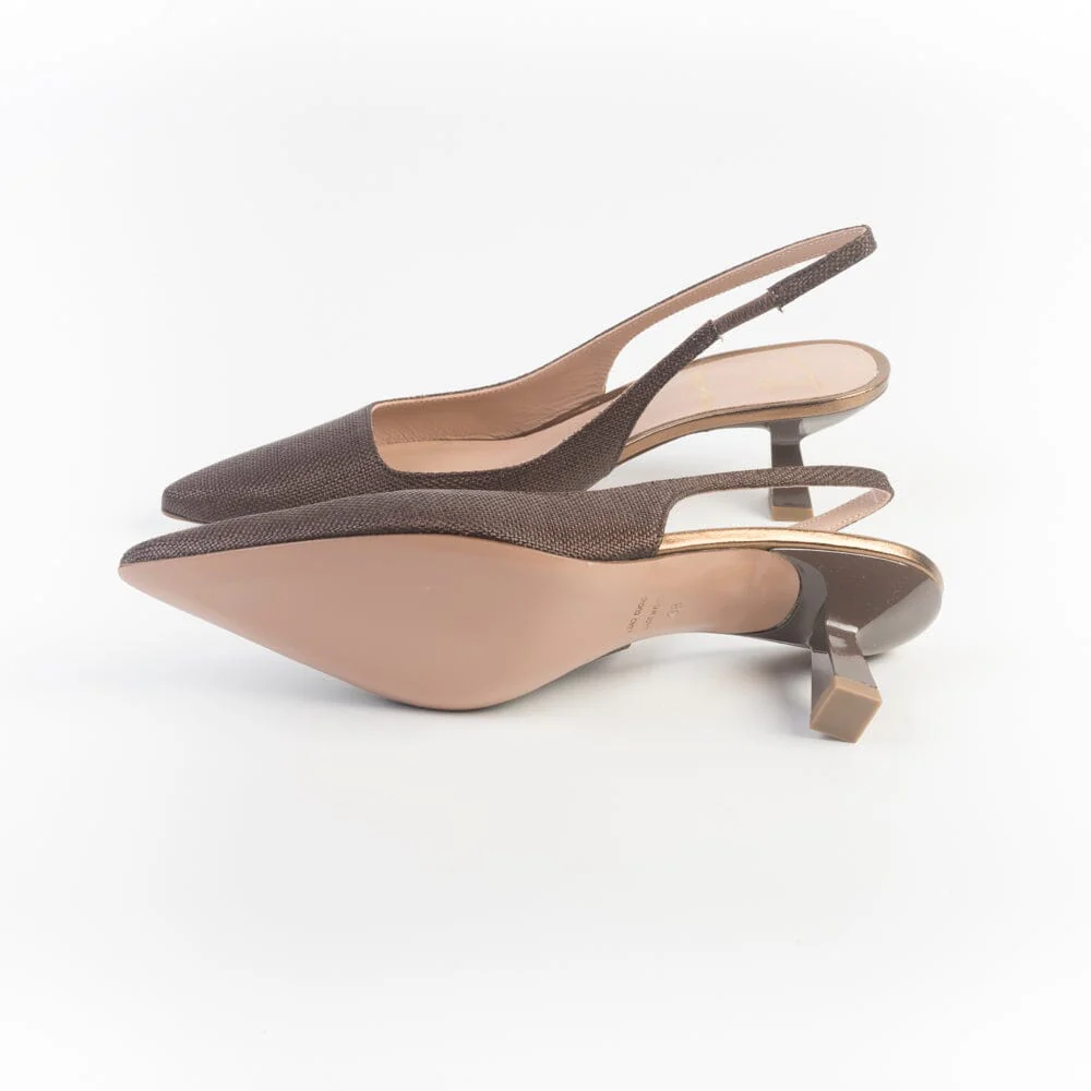 Sling Back a punta di Roberto Festa, realizzate in rafia di colore marrone e pelle di colore bronzo. Cinturino con elastico alla caviglia. Fodera interna e sottopiede in pelle. Tacco rocchetto in nuance, di cm 5. Suola in cuoio.